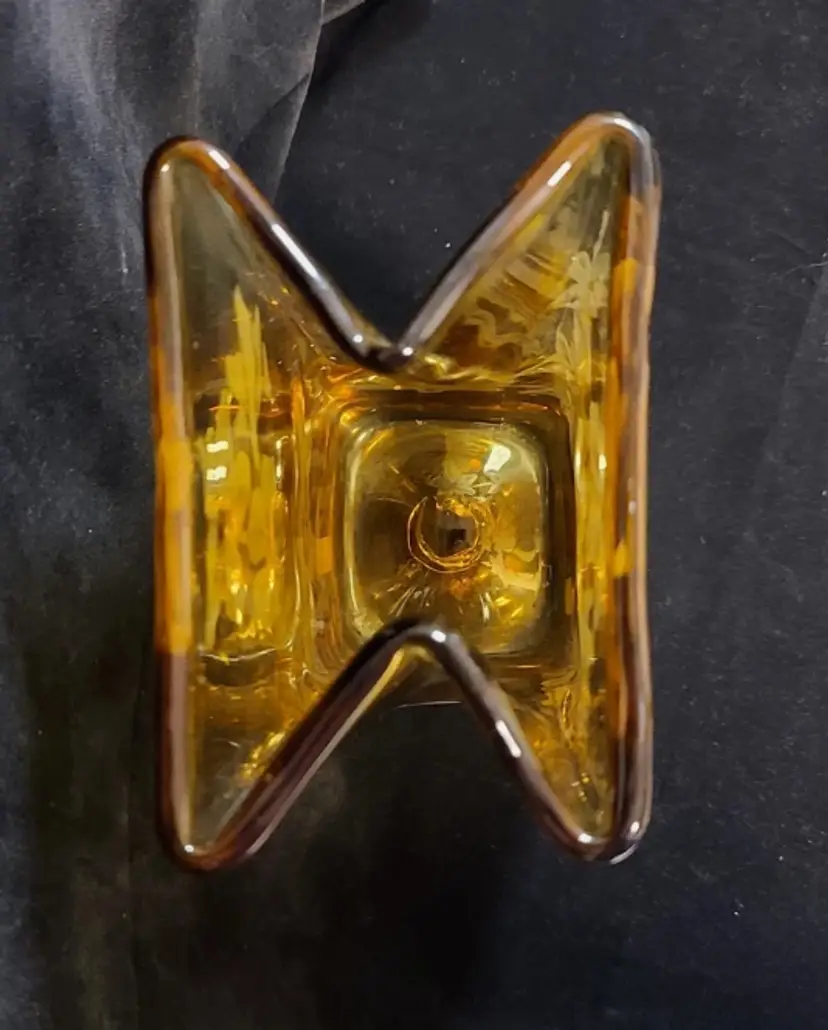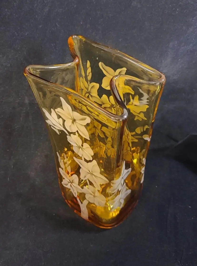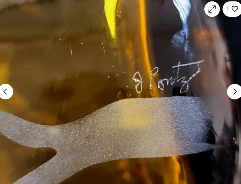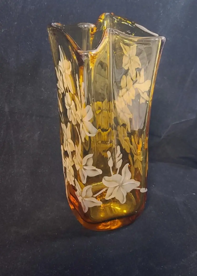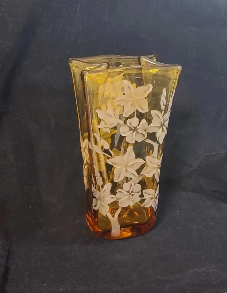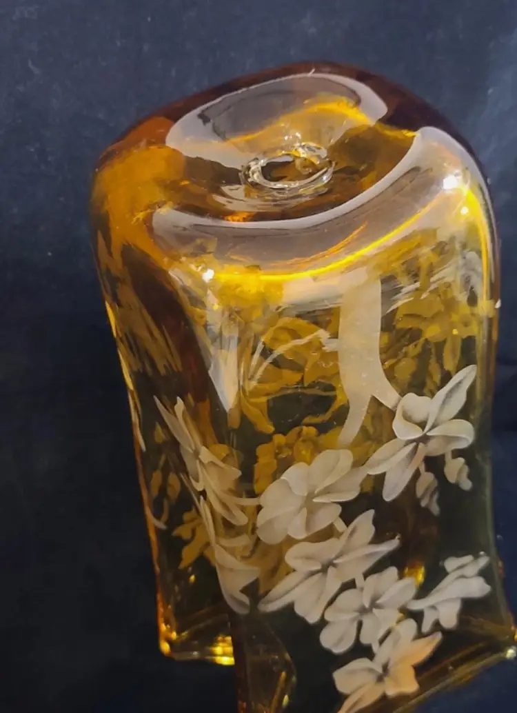 This beautiful vase is a must-have for any glassware collector. The amber color and hand-etched plumeria design make it a stunning decorative piece for any home. The vase is signed by J. Pontz, an artist from Hawaii, adding to its value.
