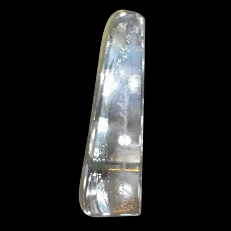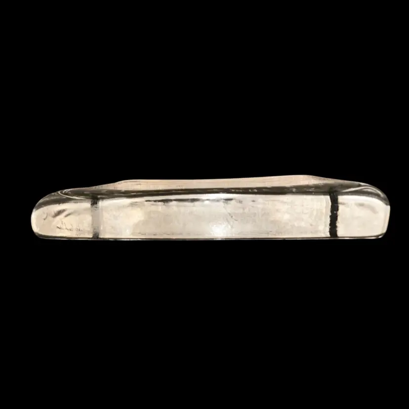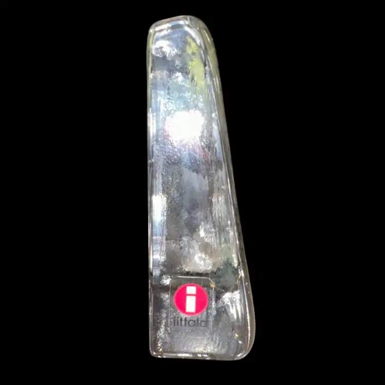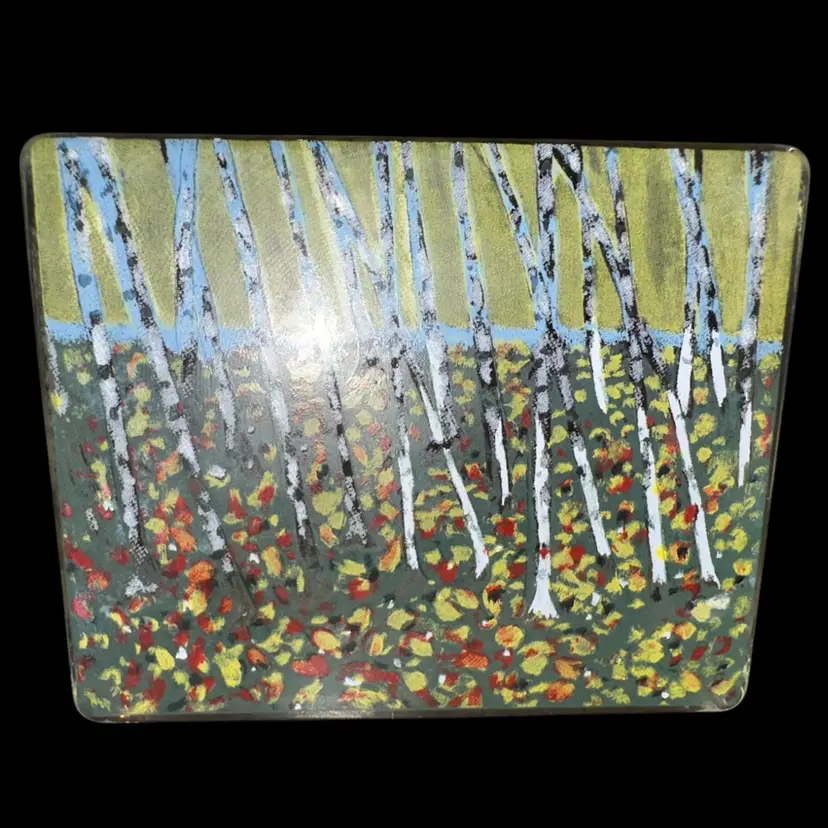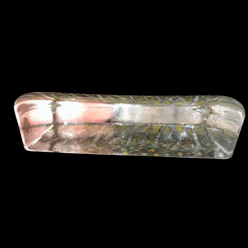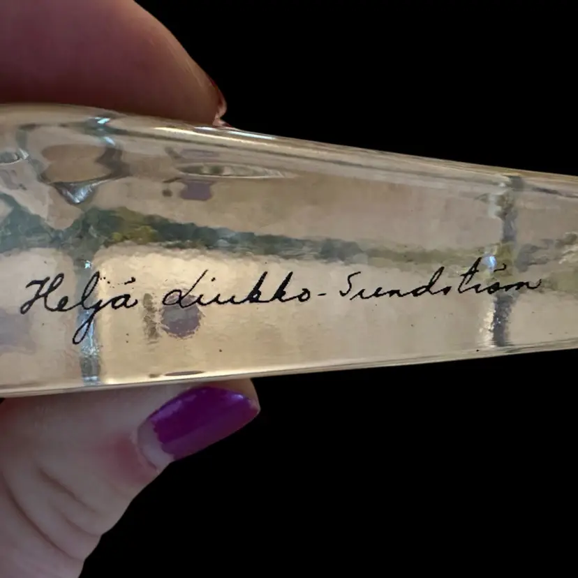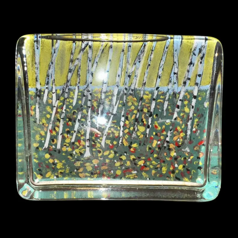 vintage, glass paperweight with a reverse image of a thicket of birch trees in a colorful field of flowers. The image is printed on the back and shines through the front and the signature of artist Heljä Liukko-Sundström is marked on the side. This is a solid piece of clear glass with a tall, rectangular shape and a wide base so it can easily stand up. Littala Co. from Finland Artist signed 3 inches tall, almost 4 inches wide, and 1 inch thick