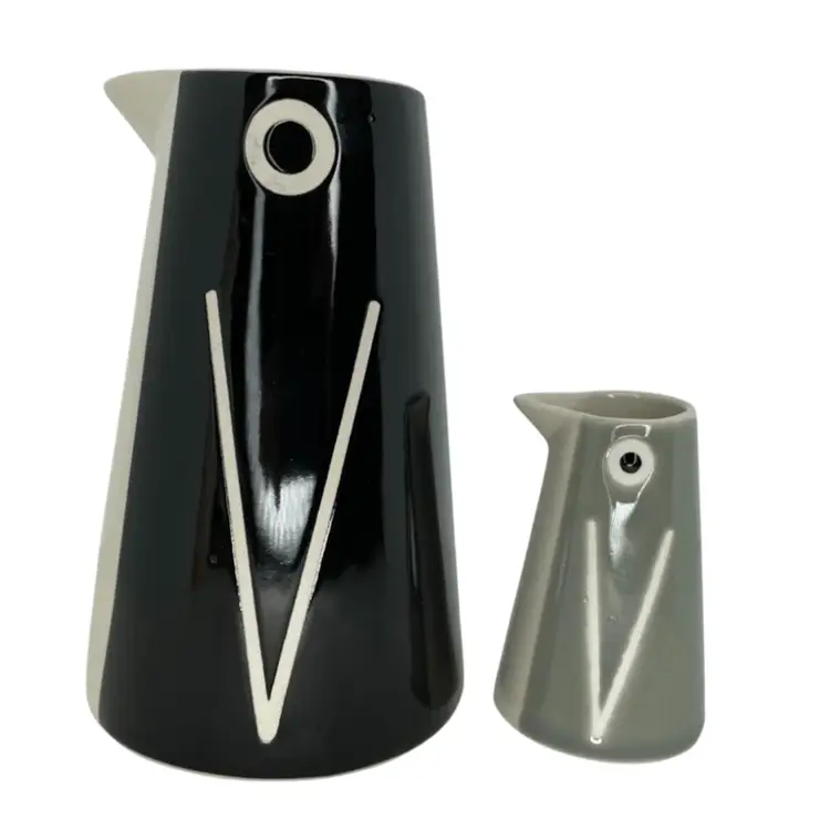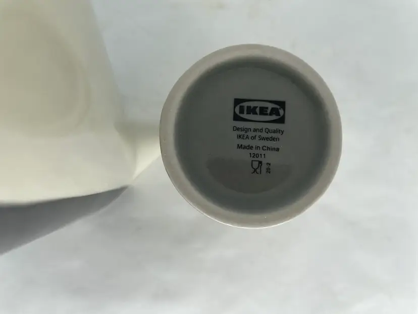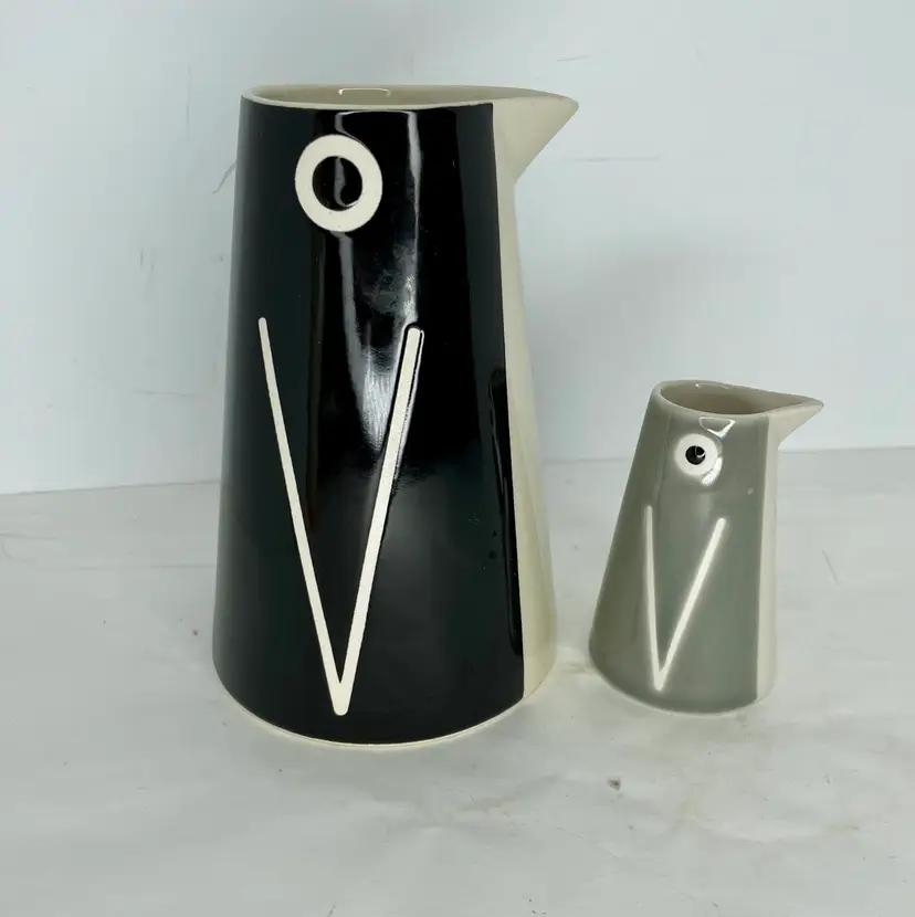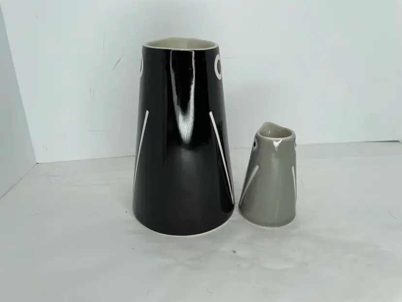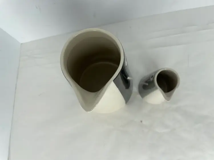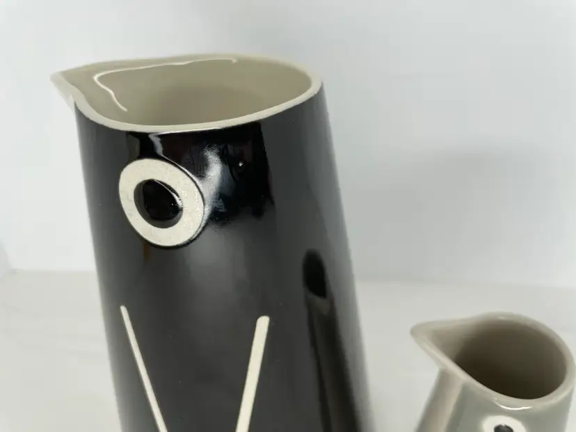 This is a set of two IKEA Lattsald creamers made of ceramic with a Mid-Century Modern style. The creamers are in the shape of penguins and are multicolored with a glossy finish. The larger creamer is 3.75" in diameter and 5.75" in height, while the smaller creamer is 2" in diameter and 3" in height. These creamers are an original product from Sweden and are part of the IKEA Lattsald product line. They are limited edition and have decorative features.