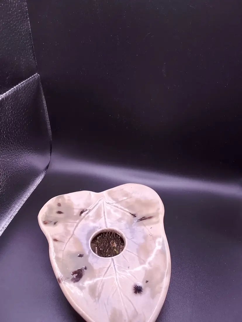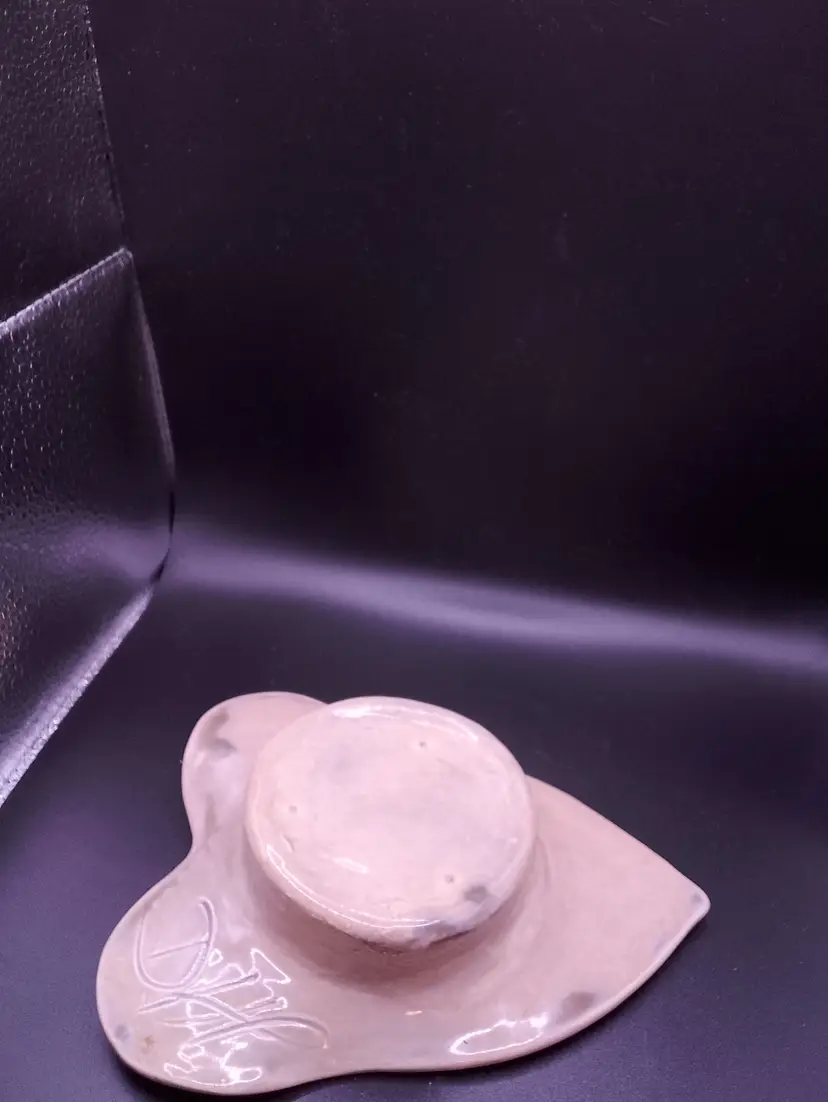 This vintage Ikebana leaf vase pottery, signed by DHE, is a unique piece of mid-century modern decor. Handcrafted in the United States, this beige ceramic vase features a nature-inspired leaf design with a flower frog for arranging flowers. The glossy finish and art pottery production style add to its charm, making it a one-of-a-kind addition to any collection of decorative pottery and glassware. Perfect for those who appreciate the beauty of nature and the craftsmanship of the mid-century era. 7"x5.5" at widest part. no chips or cracks
