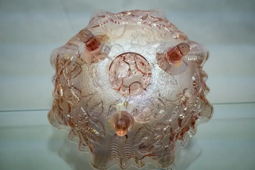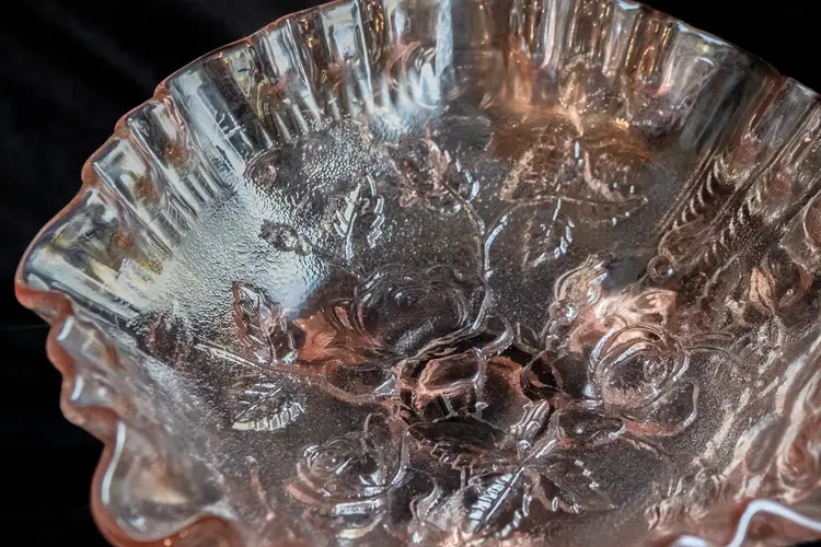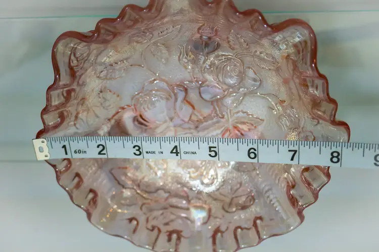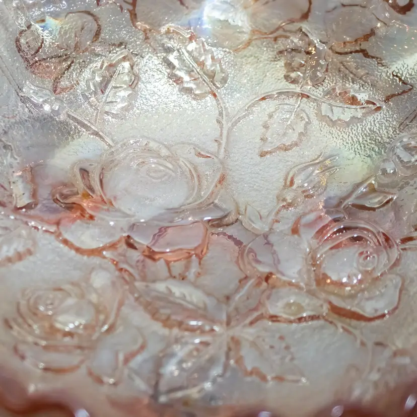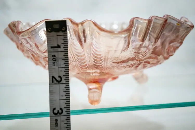 Imperial glass tri-footed bowl with rose design. 3" tall and 8.5" across. Pre-owned in great condition- no chips or cracks.