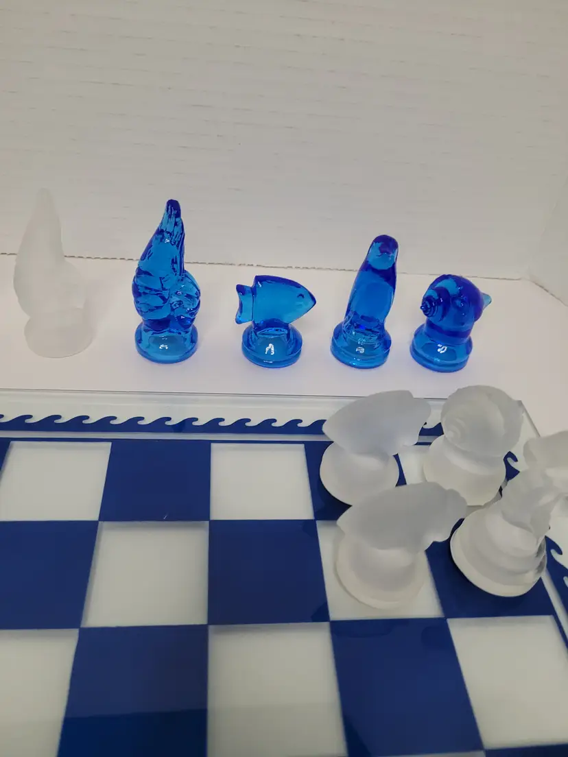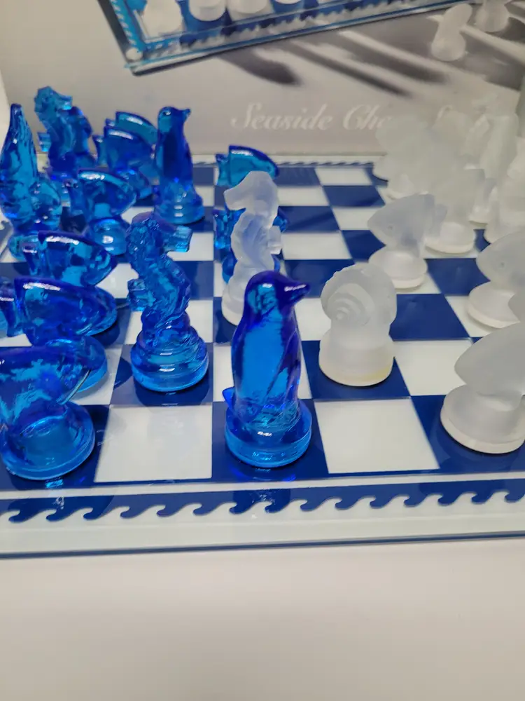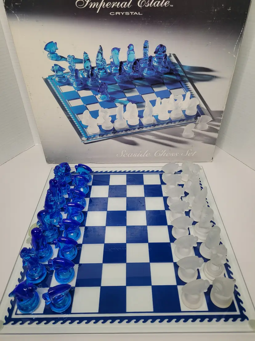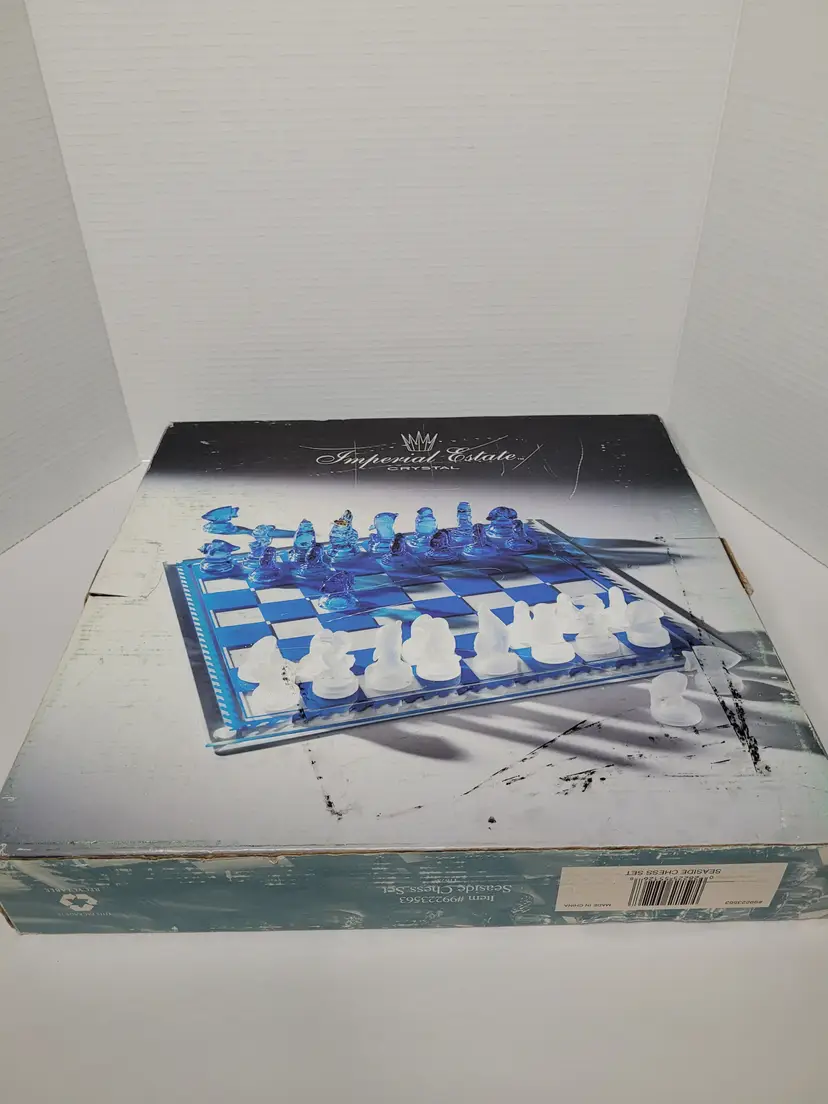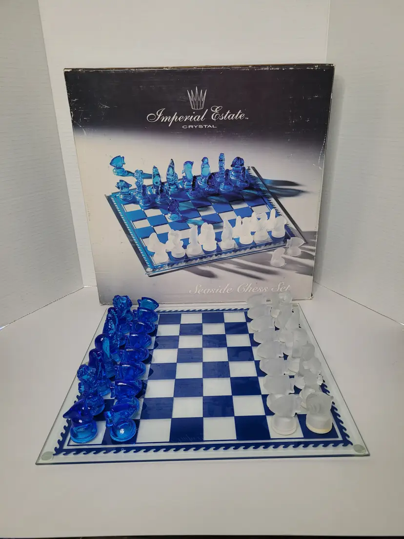 Experience elegance with the Imperial Estate Crystal Seaside Chess Set Featuring stunning blue and white sea life pieces, this set is perfect for any beach house decor Perfect gift for chess enthusiast Or treat yourself Board measures 14 x 14 inches. This very rare vintage set is in like new condition and in its original box with foam and instructions Please see photos they're the best description Ask questions before you purchase. Ships fast