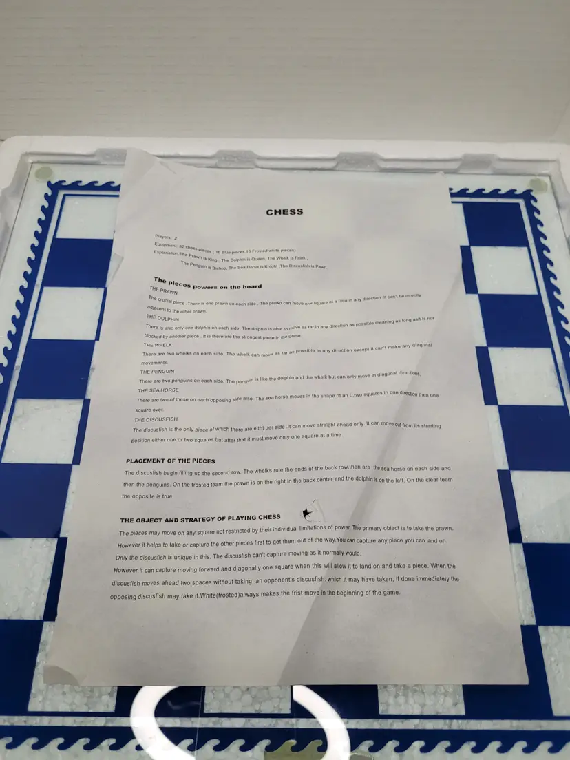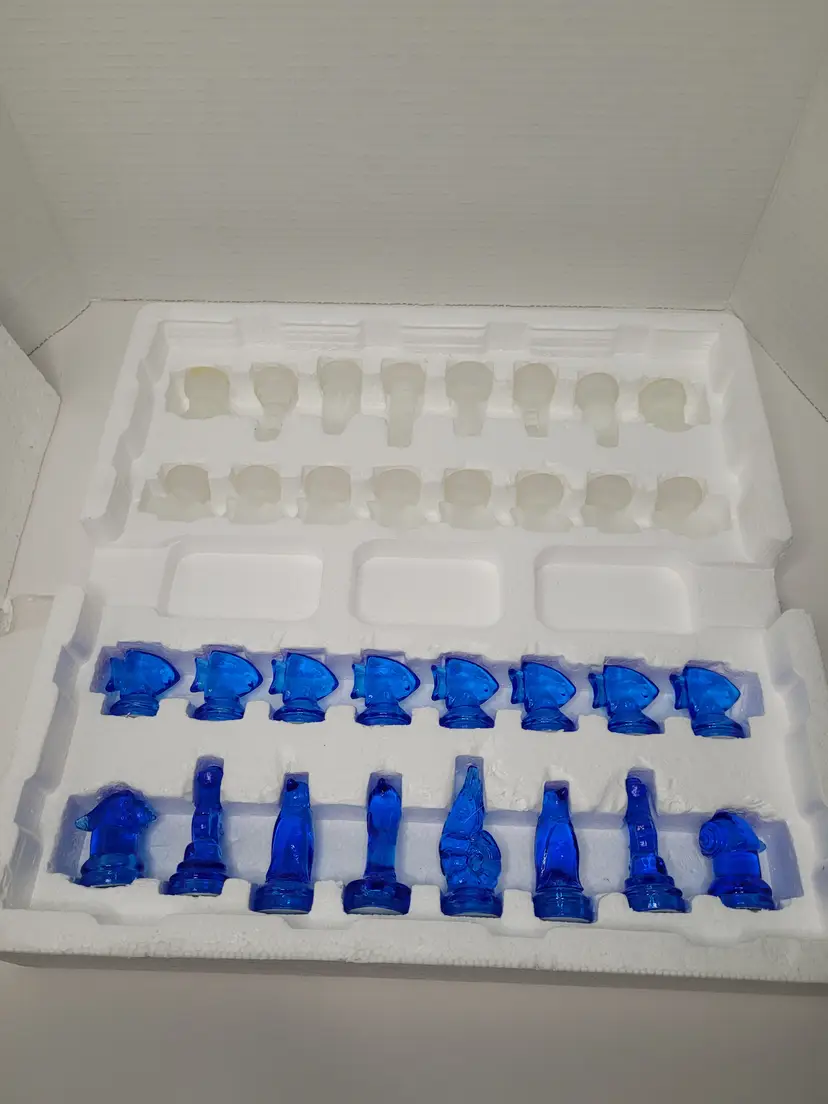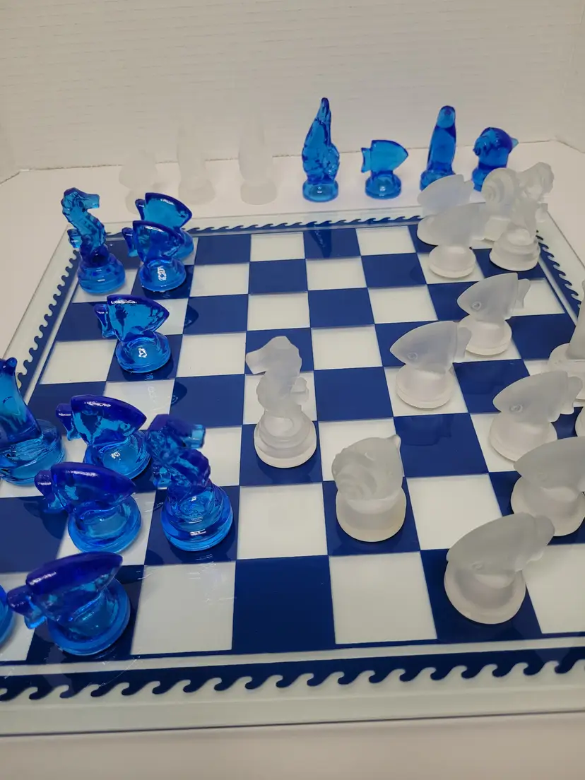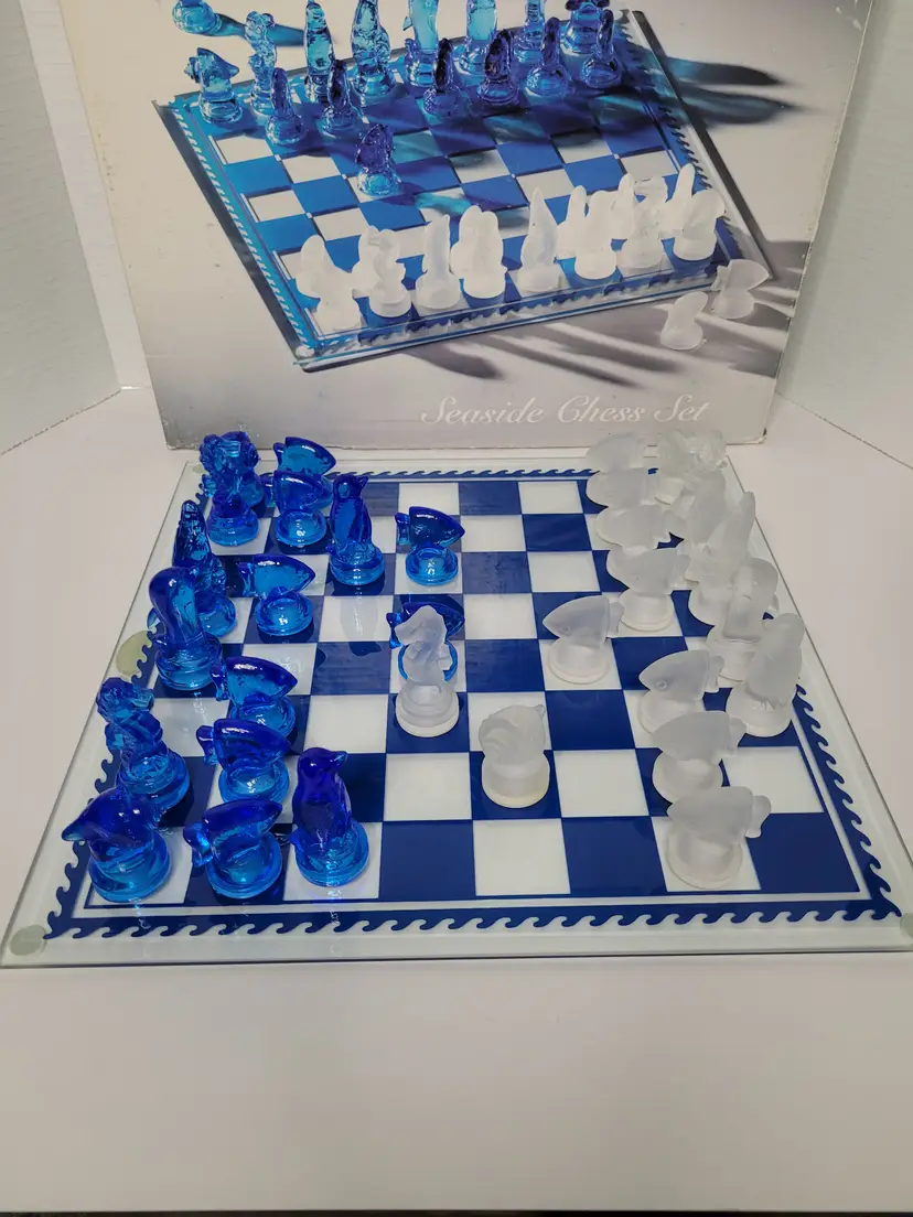 Experience elegance with the Imperial Estate Crystal Seaside Chess Set Featuring stunning blue and white sea life pieces, this set is perfect for any beach house decor Perfect gift for chess enthusiast Or treat yourself Board measures 14 x 14 inches. This very rare vintage set is in like new condition and in its original box with foam and instructions Please see photos they're the best description Ask questions before you purchase. Ships fast