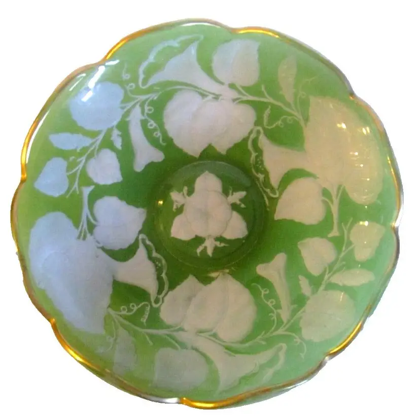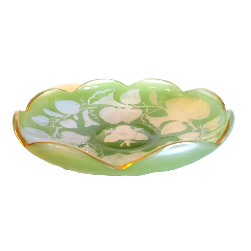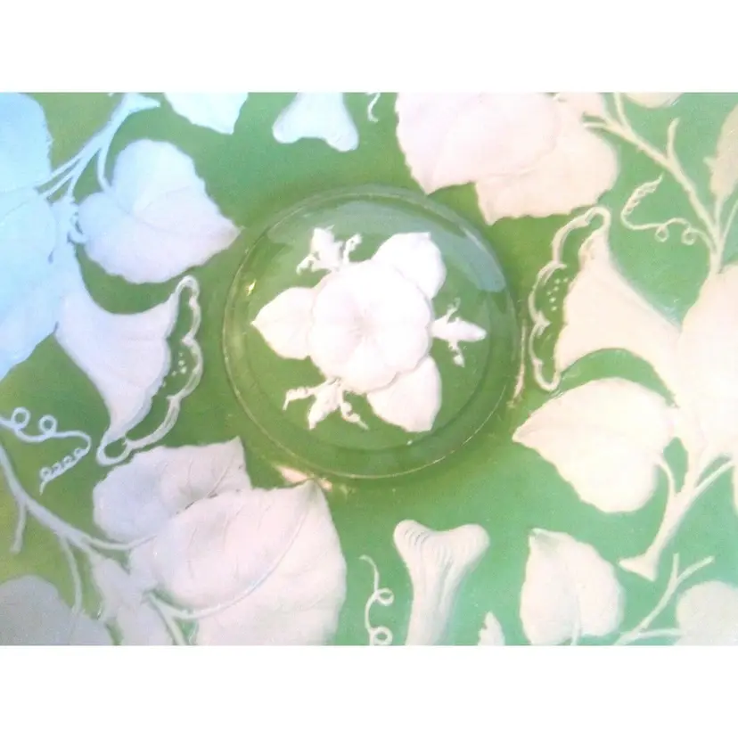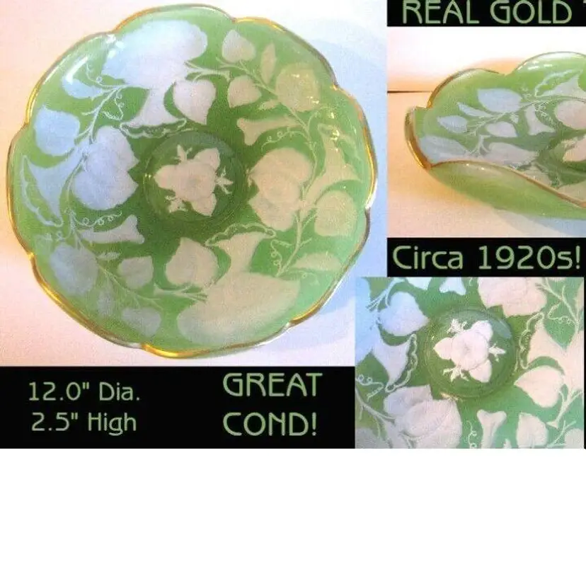 This is an amazing and very, very rare, version, Imperial Glass 1920 Intaglio Green & White Morning Glories Console Bowl. It is very rare in the green color. The paint was applied to the reverse side, and the bowl is trimmed in real gold. It measures, 12.0" in diameter and is 2.5" in height. It is in great condition and almost ALL the original paint remains with maybe a couple tiny areas missing, if any at all!! It was positively ID'd for me by the Imperial Glass Museum and I was told it is very rare indeed, so much so that they have no pic of an existing one to display, so they asked to use mine. :) #ImperialGlass #AntiqueGlass * Please see all pics, as they are part of the description.