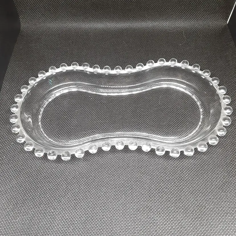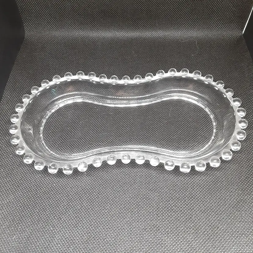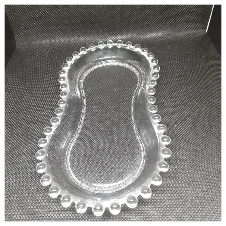This elegant trinket dish from Imperial Glass is a must-have for collectors. With a peanut-shaped design and beaded edge pattern, this clear glass dish is perfect for storing small items or as a decorative piece. Made in the United States during the 1950's and part of the Candlewick product line, this dish is a timeless addition to any home decor collection. It has one compartment and is made from high-quality glass. Use it for serving or for display purposes. It belongs to the pottery and glass category and is a beautiful piece of glass. It measures 7 1/4 inches long and 3 3/4 inches wide at the widest point.