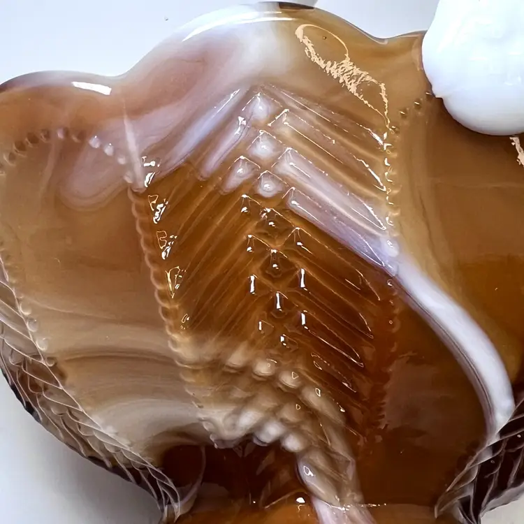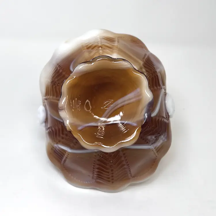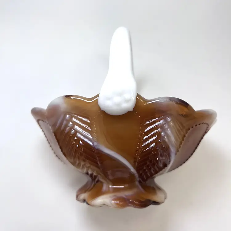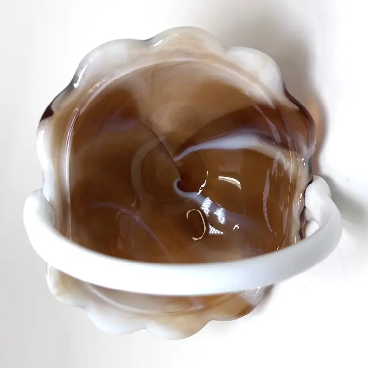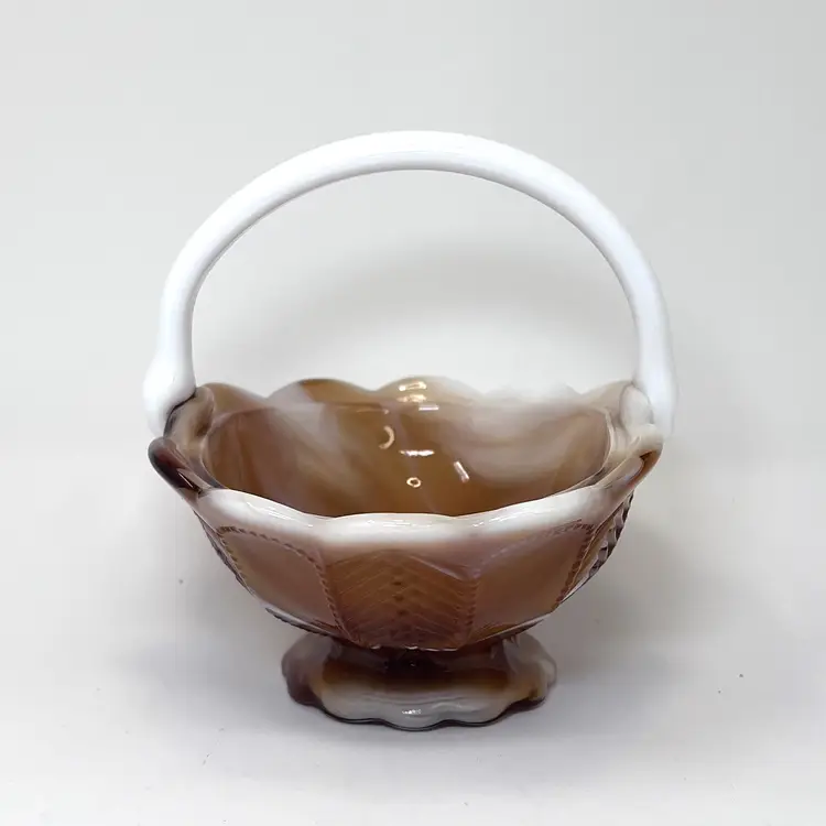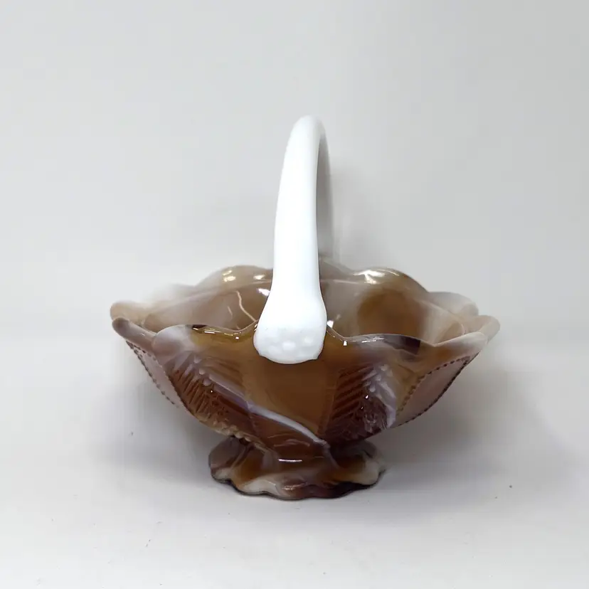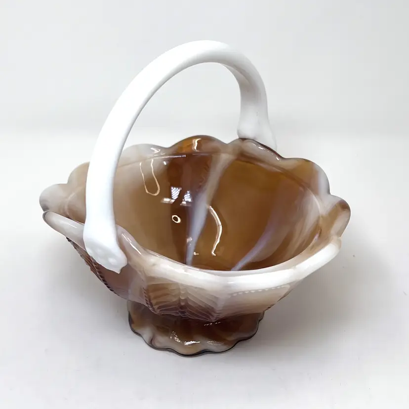 Imperial Glass produced their caramel slag line from the early 1950s through the early 1970s, and this footed handled basket is one of the most sought-after forms they made. The swirling caramel, chocolate brown, and cream glass was created by blending opaque milk glass with colored glass during pressing — a process that guarantees every piece is unrepeatable. This example has a particularly rich, deep swirl pattern. The chevron-paneled exterior and smooth interior bowl are classic Imperial workmanship; the separately applied white milk glass handle, finished with a small daisy detail at each attachment point, elevates it from decorative to heirloom.
