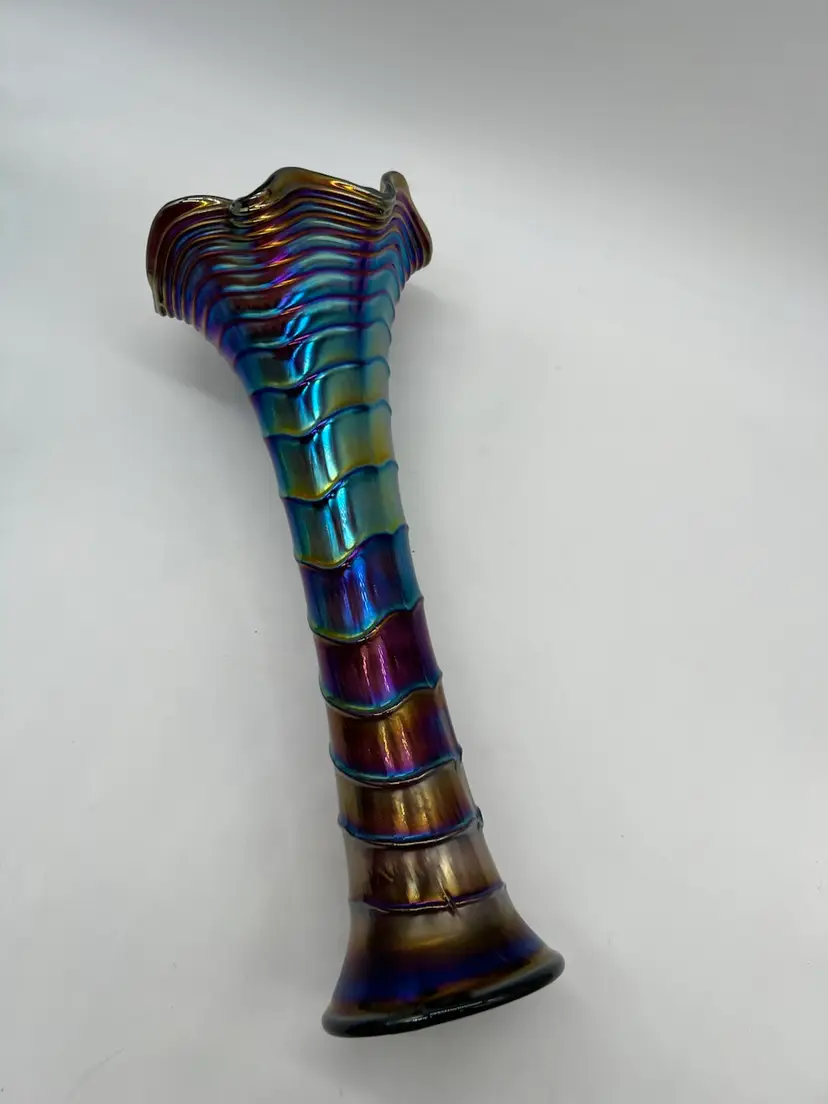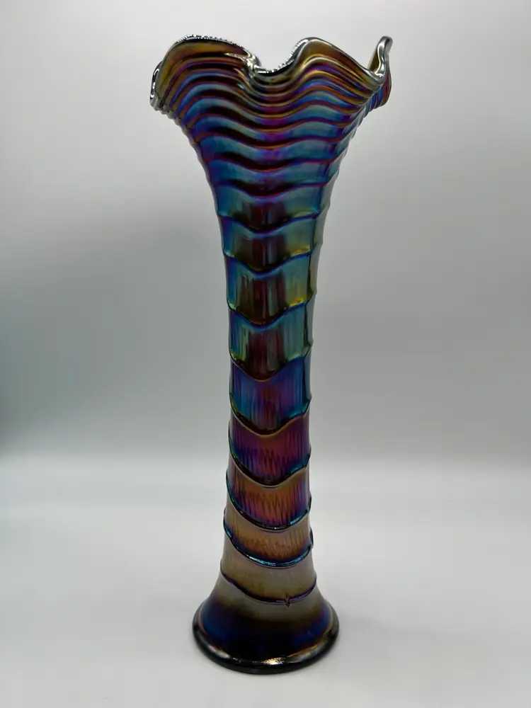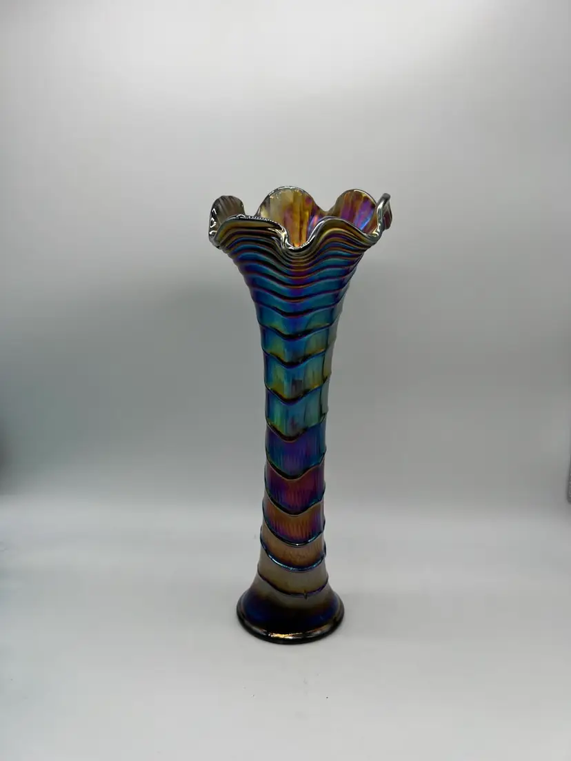 This stunning Imperial Carnival Ripple Vase features a captivating design that showcases vibrant colors and intricate detailing. Standing at an impressive 13 inches tall, it makes for a striking centerpiece in any home decor. The ripple effect adds texture and depth, catching the light beautifully and creating a mesmerizing display. Perfect for showcasing flowers or as a standalone piece, this vase is a must-have for collectors and enthusiasts of fine glassware. Its classic yet contemporary style ensures it will complement a variety of interior themes, making it a versatile addition to your collection. Whether you're looking to enhance your own space or searching for a thoughtful gift, this vase is sure to impress.