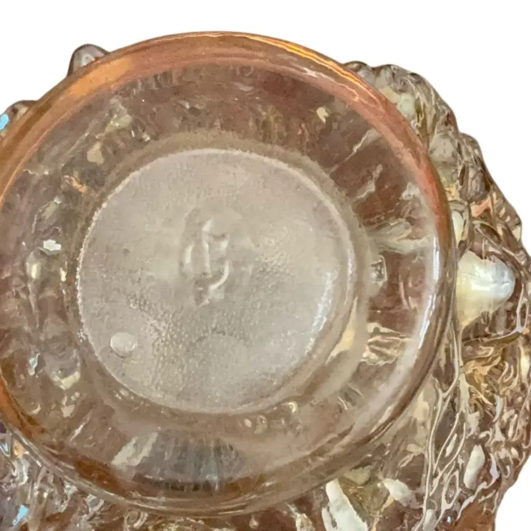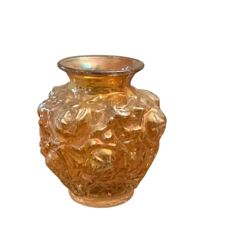 Beautiful vintage iridescent marigold carnival glass vase in a raised rose flower design. Produced during the 1960-1970 era.