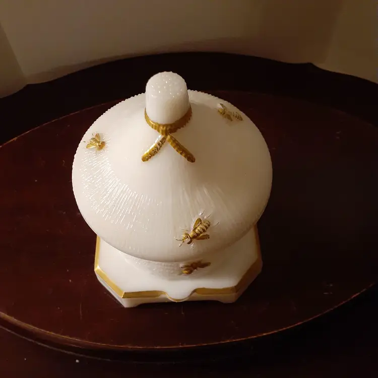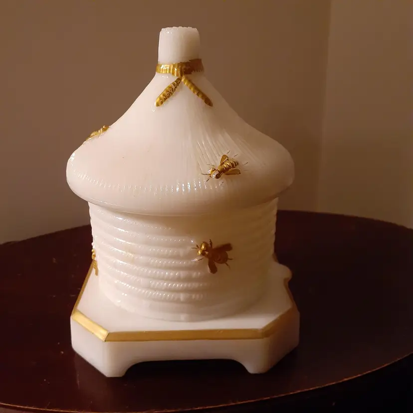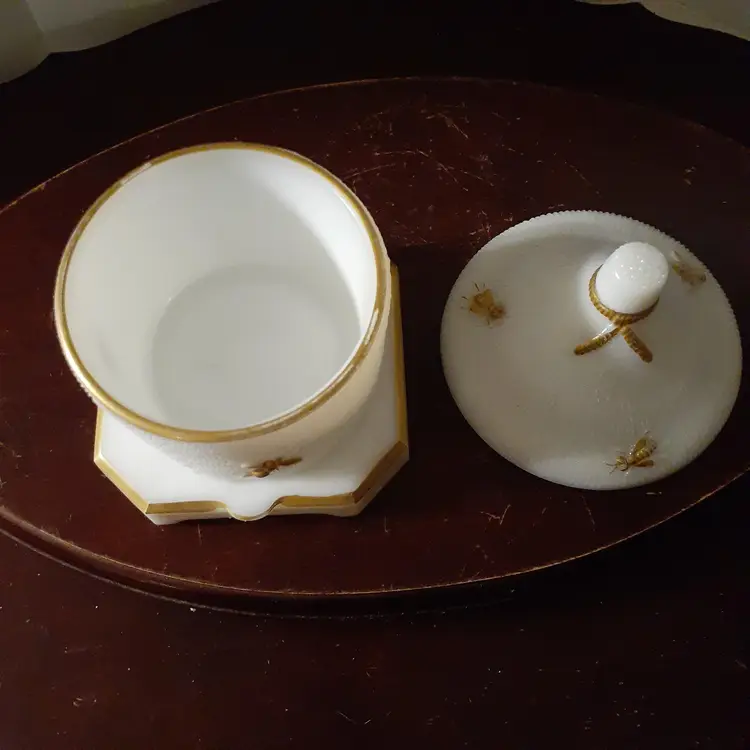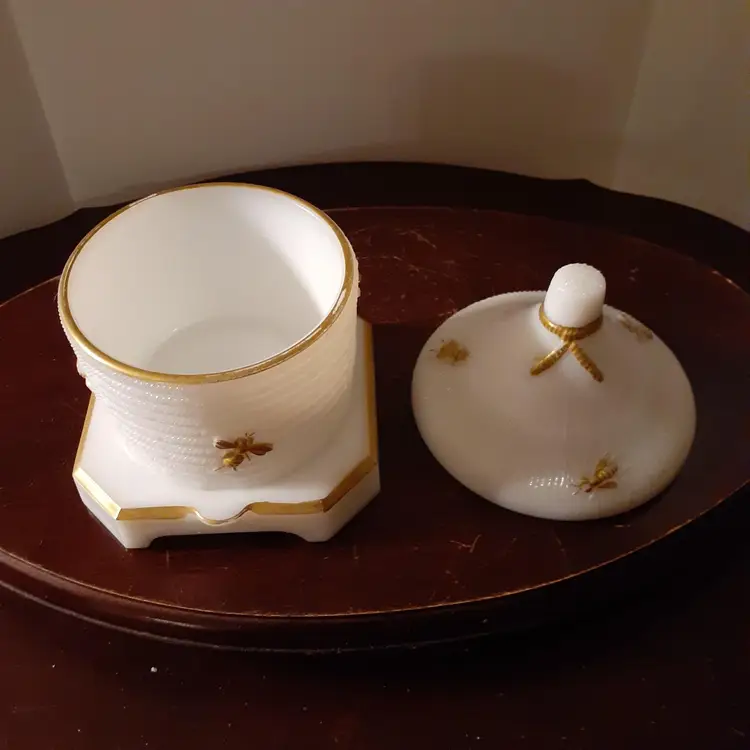 Milk glass, 5" tall with lid