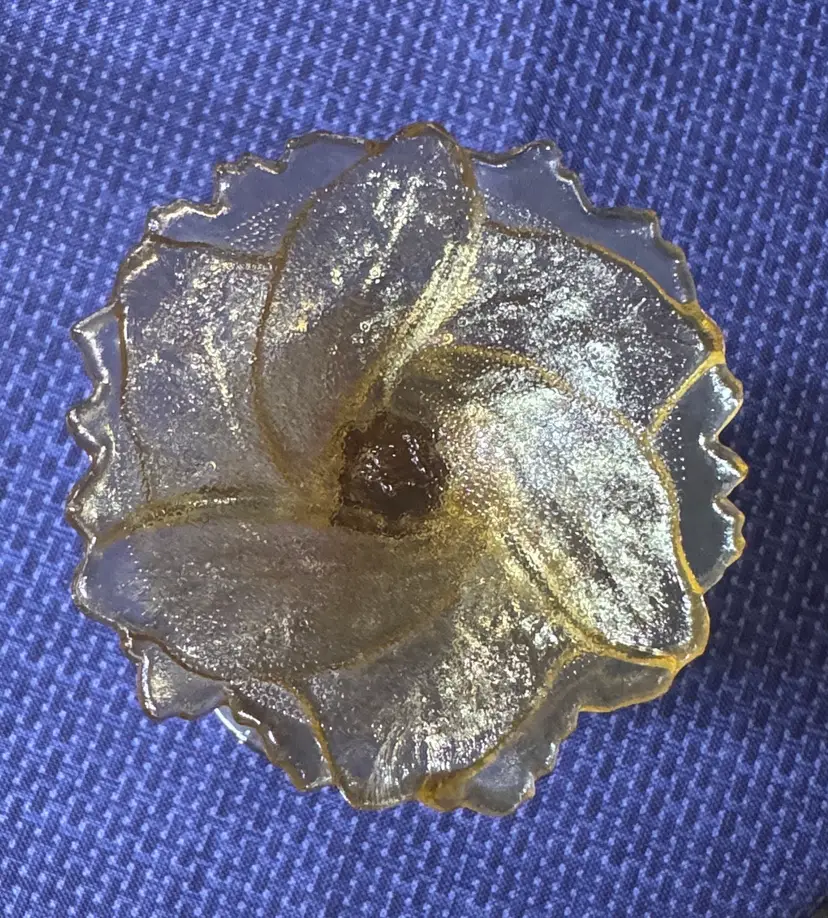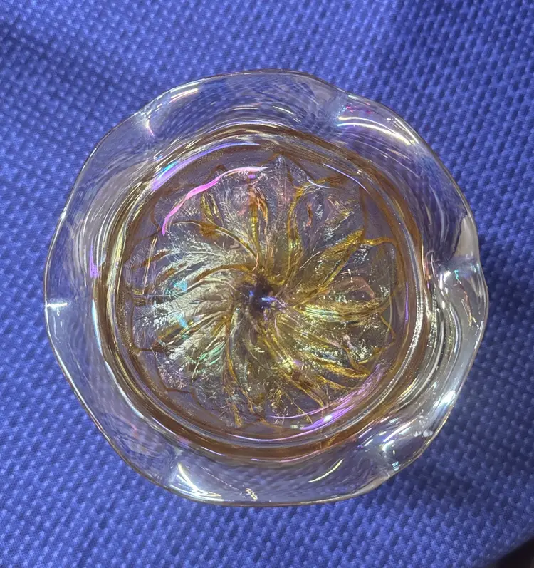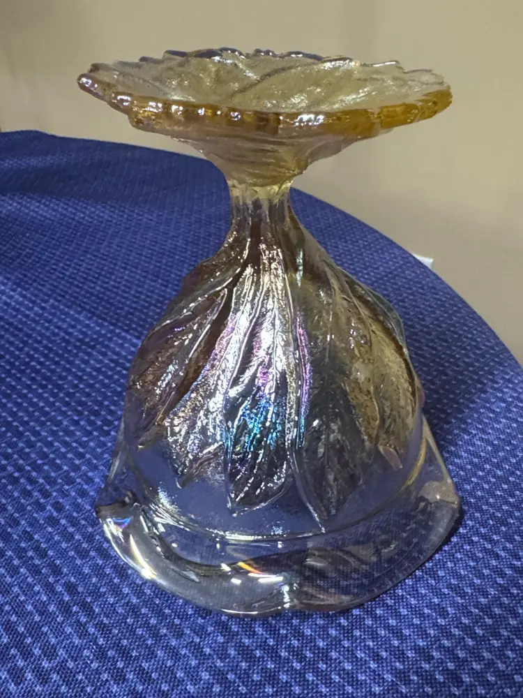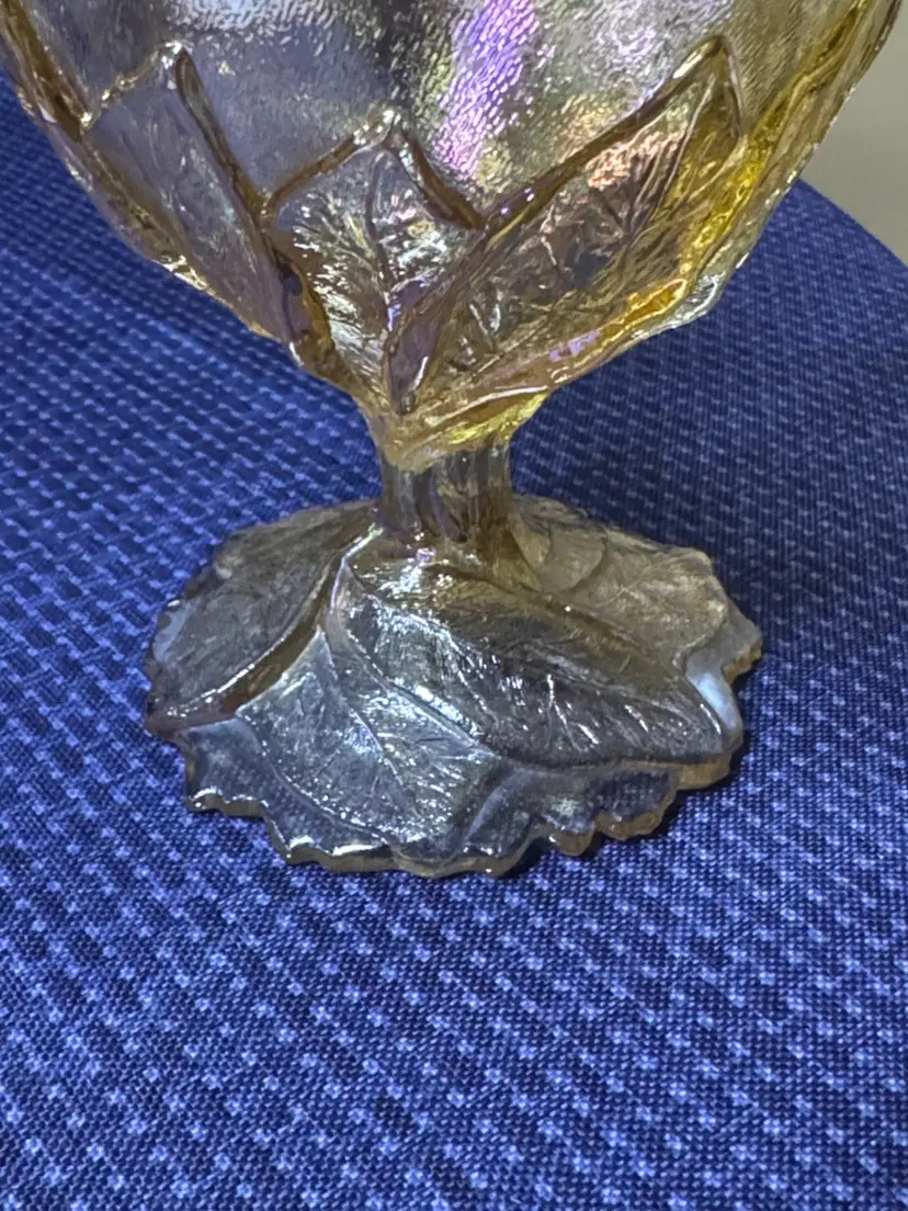 Beautiful iridescent glass goblet with leaf design. Perfect for decor or serving. Imperial Glass Marigold Carnival Glass Compote Bowl, also referred to as a pedestal bowl or candy dish. It features an iridescent marigold color and an embossed acanthus leaf pattern. 5 3/8” tall 5.25” diameter Excellent like new condition with no breaks or chips (1050930251)