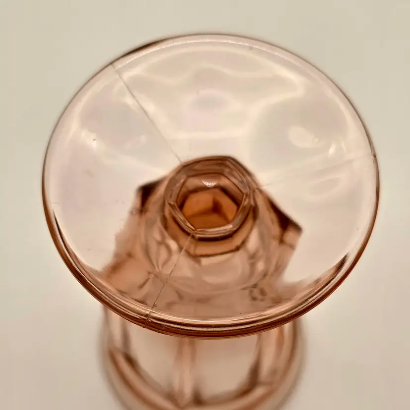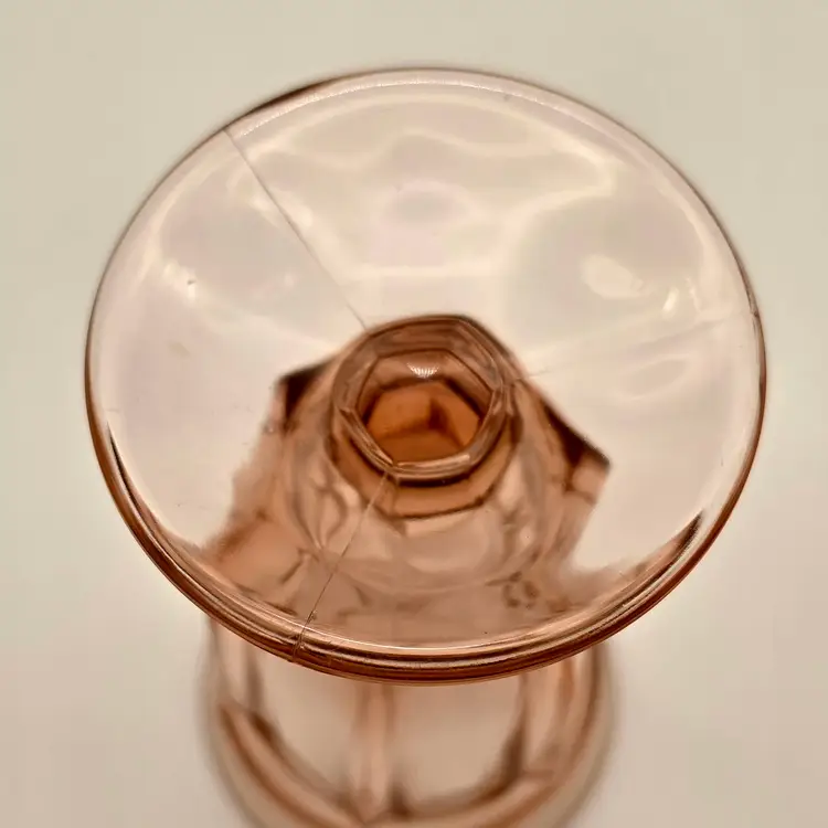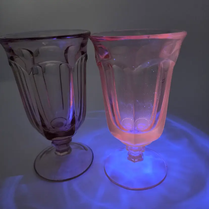 Brand: Imperial Glass Pattern: Old Williamsburg Color: Azalea Pink / Light Pink Material: Pressed Glass Dimensions: Approximately 6.5" tall Quantity: Set of 2 Glows under 365nm UV light!