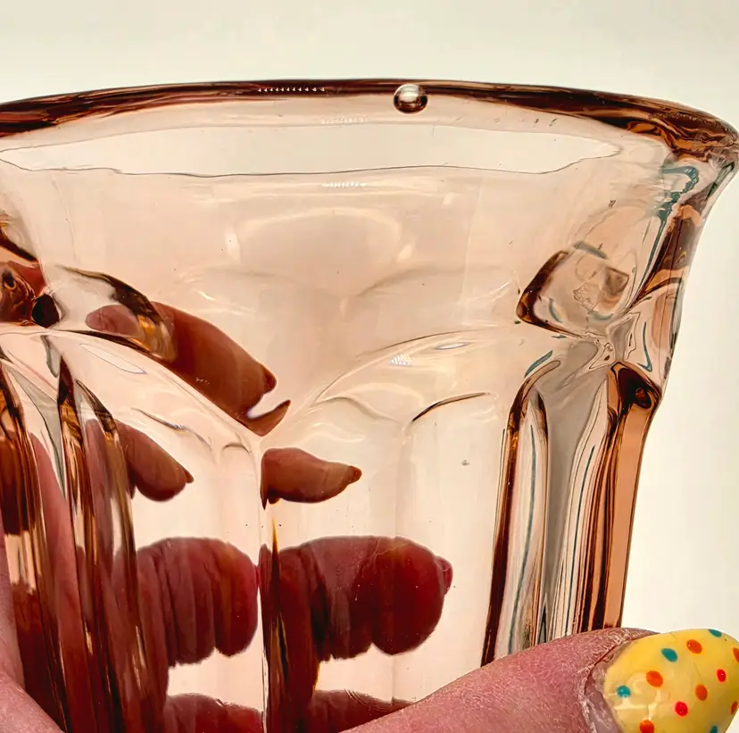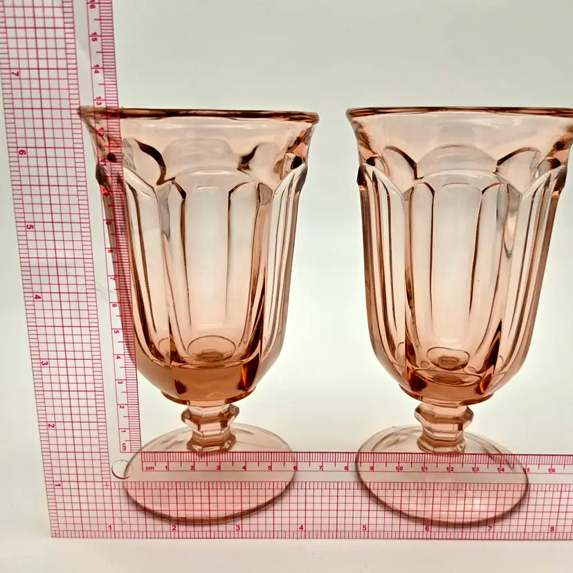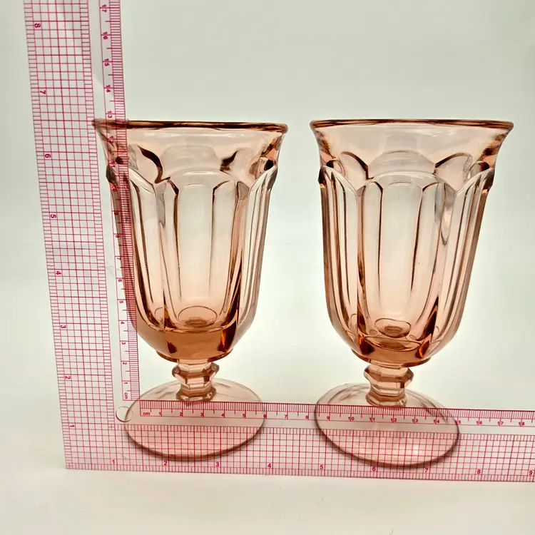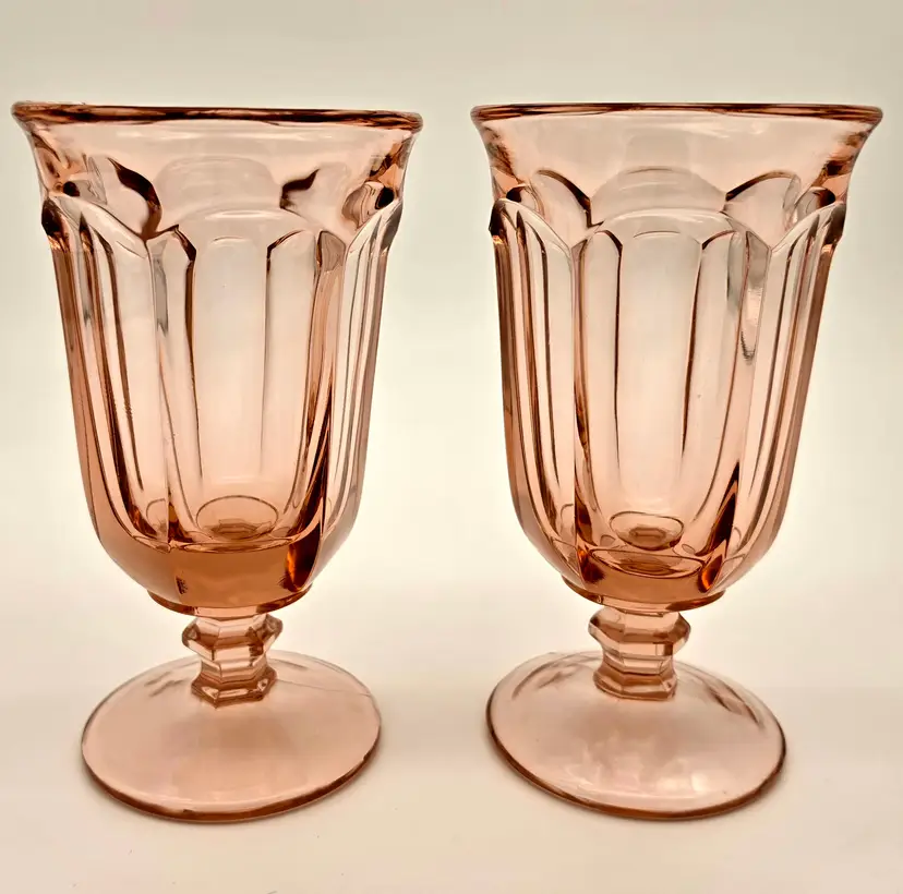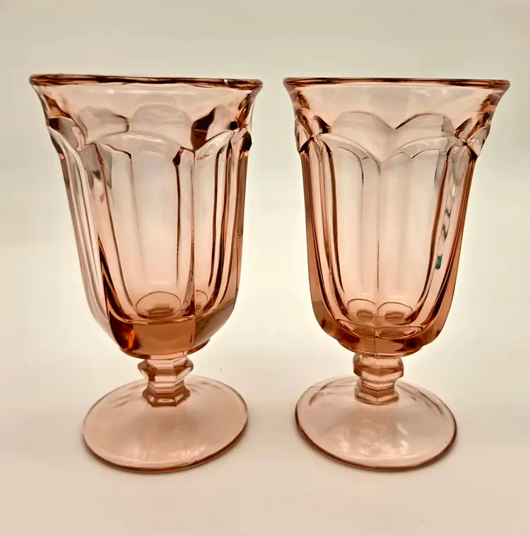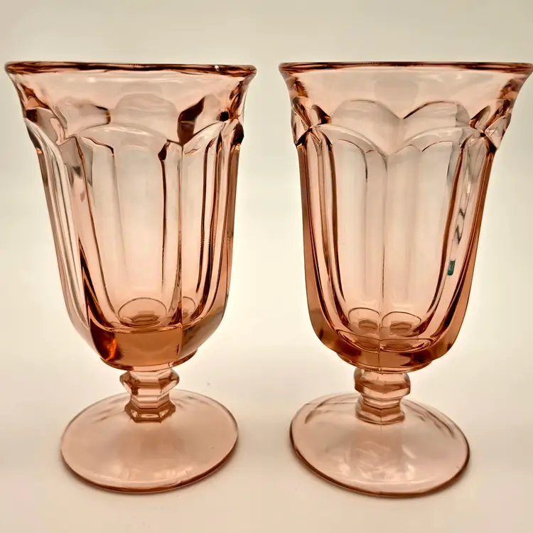 Add a touch of vintage elegance to your table with this beautiful pair of iced tea glasses. Crafted by Imperial Glass, these pieces feature the classic Old Williamsburg pattern in the highly sought-after Azalea Pink (Light Pink) hue. Produced for a limited time between 1978 and 1980, these glasses are a wonderful example of late 20th-century American pressed glass. Their timeless fluted design and delicate color make them perfect for both formal gatherings and everyday use.