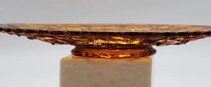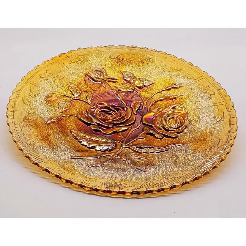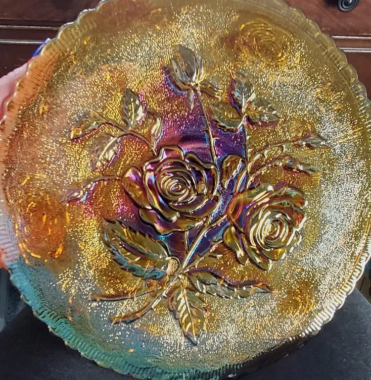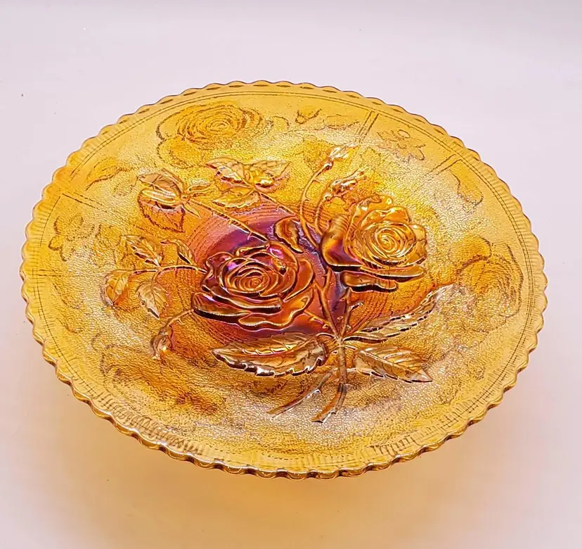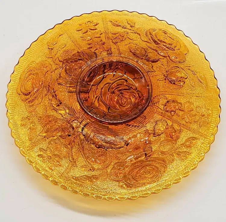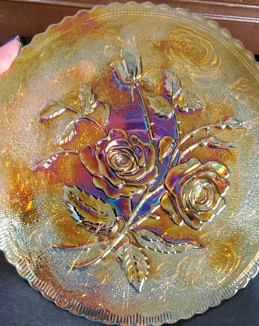 This antique Imperial glass footed plate is from the "Open Rose" collection. The base color is marigold, but the sheen color is amethyst.