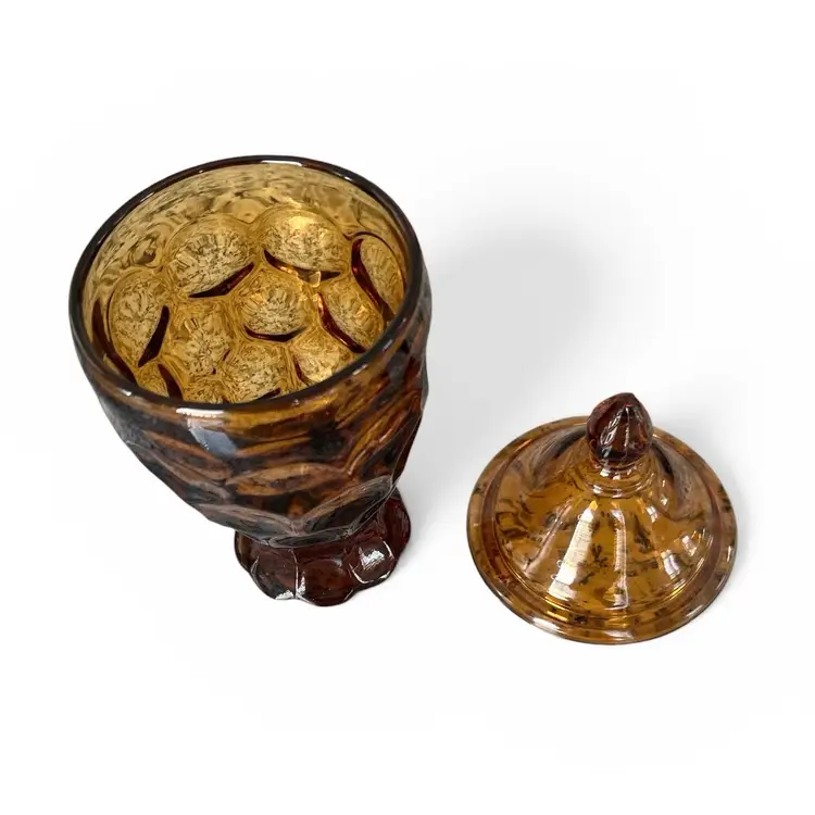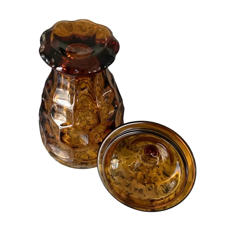 Elevate your home with this charming vintage Imperial Glass Provincial Amber Lidded Jar, a delightful piece of mid-century American glassware from the 1960s–1970s. Crafted by the renowned Imperial Glass Company of Bellaire, Ohio, this lidded jar showcases the iconic Provincial pattern—a timeless design featuring a classic honeycomb or thumbprint motif that catches the light beautifully. The rich, warm amber glass glows with a deep golden-amber hue, adding a cozy, retro elegance to any space. The matching fitted lid keeps contents fresh and secure while completing the elegant silhouette. Size: 8.5”