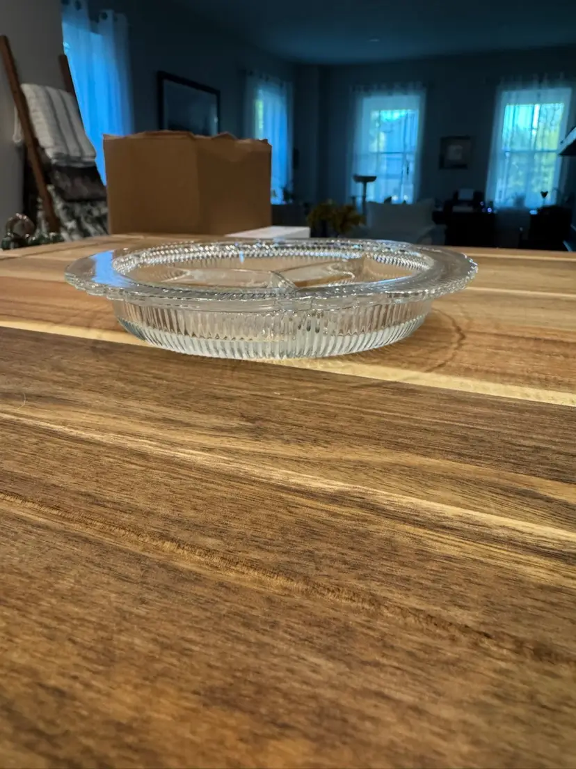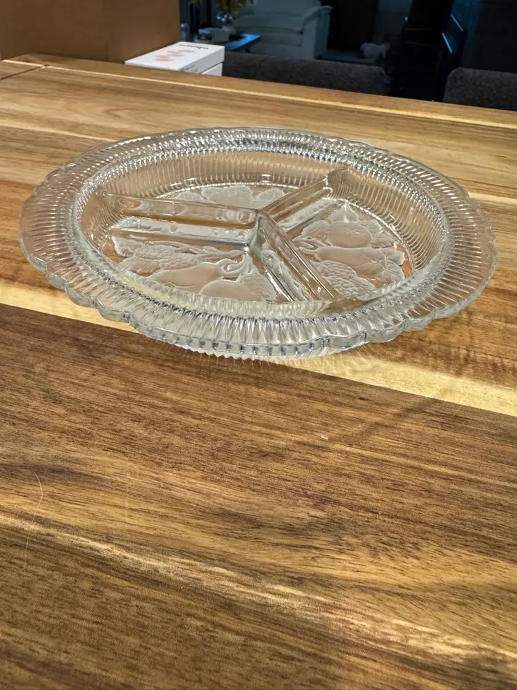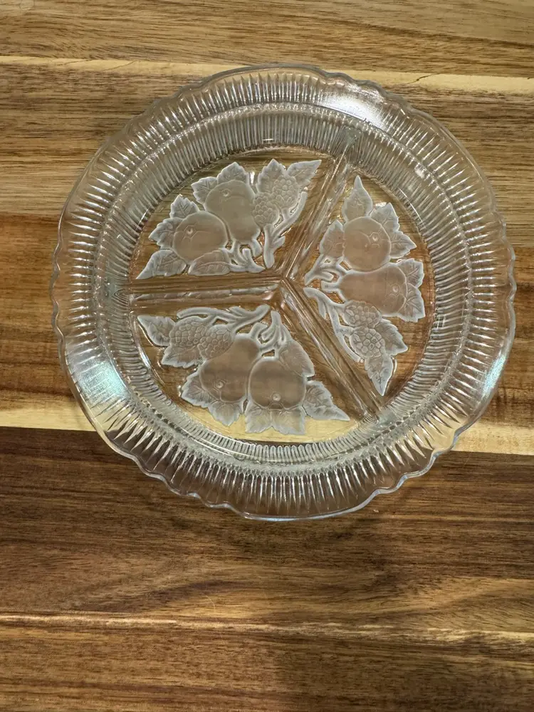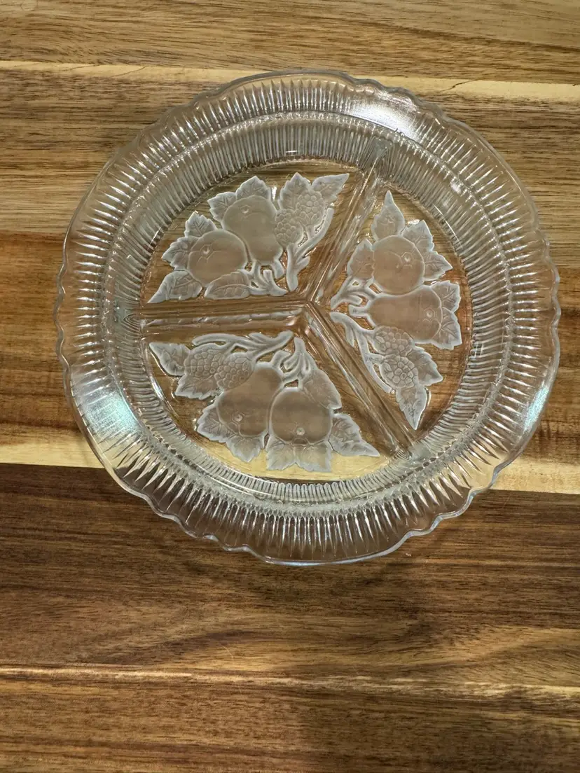 Vintage imperial glass divided relish dish in the Intaglio pattern, which featured raised frosted fruit.