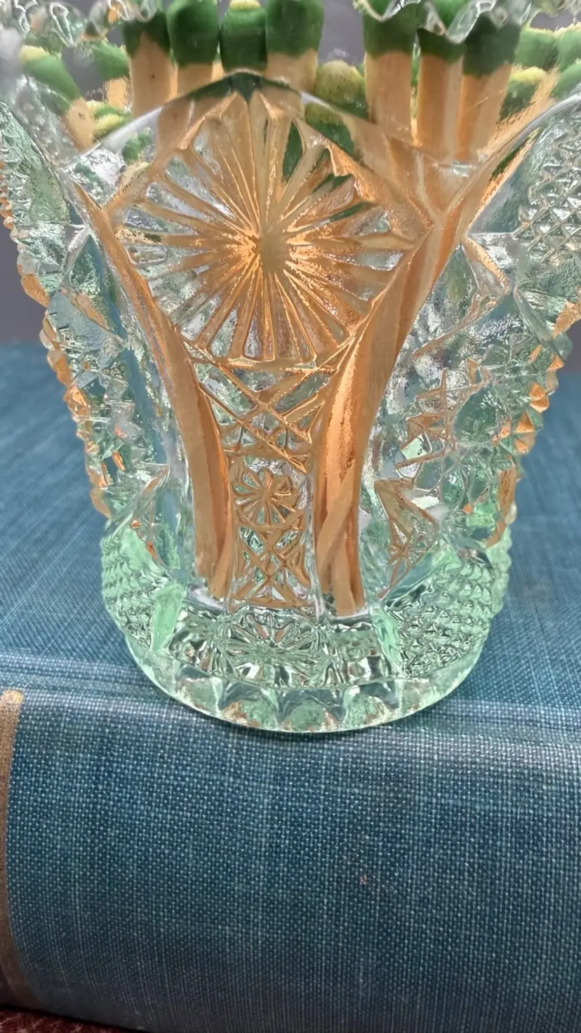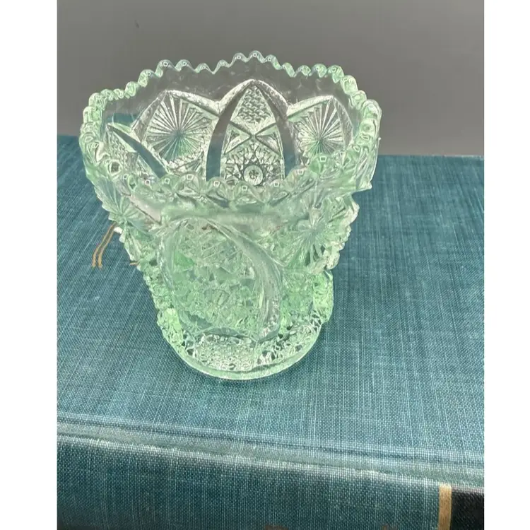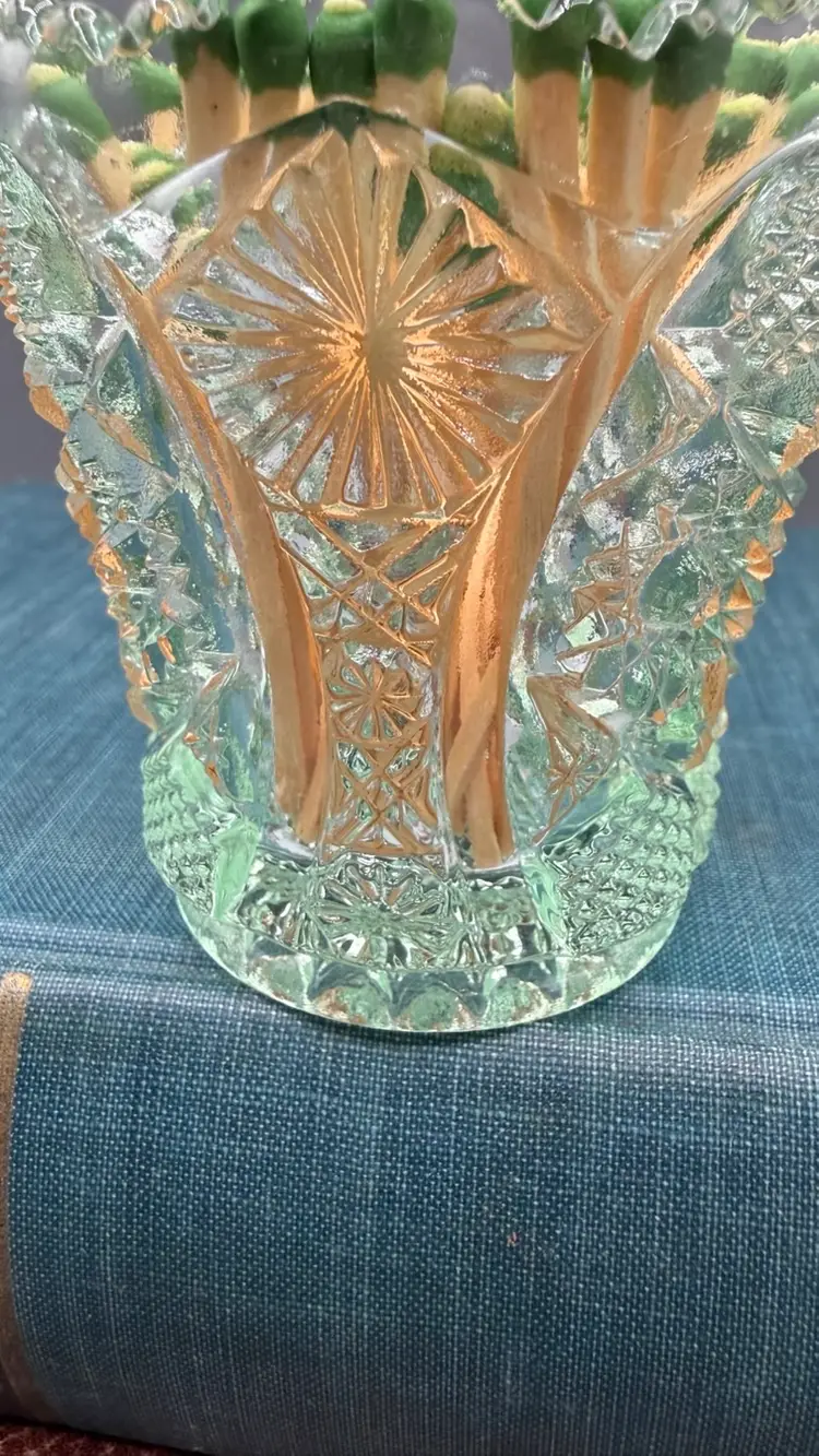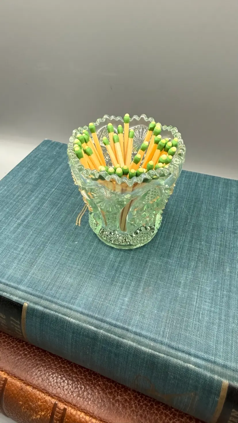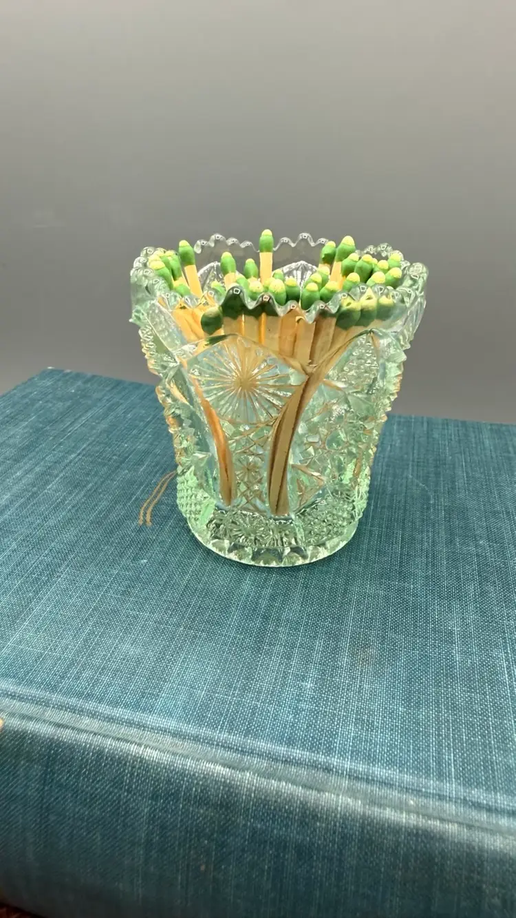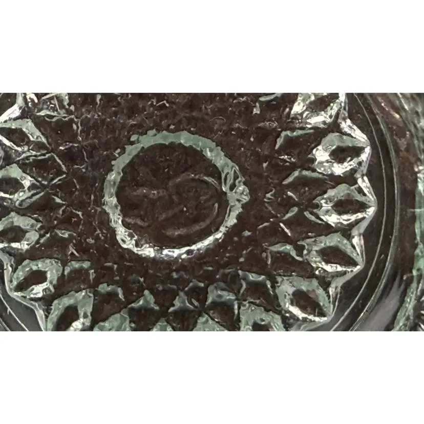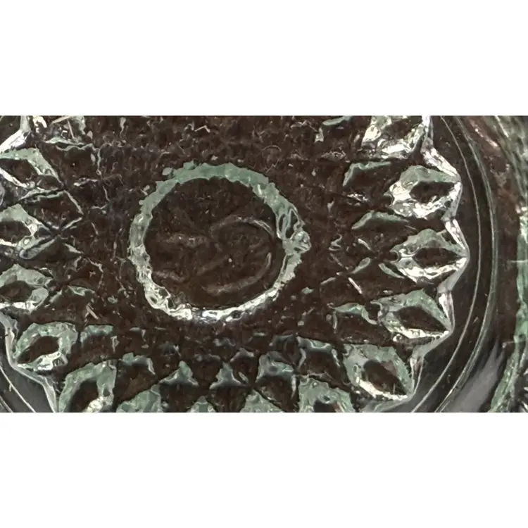 Stamped with the "IG" logo on the inside bottom, dating it between 1951 and 1972. Intricate geometric starbursts (Hobstars) and textured "buttons" with a decorative sawtooth rim. Excellent vintage condition. No chips, cracks, or repairs. Toothpicks, matches, tea light candle.