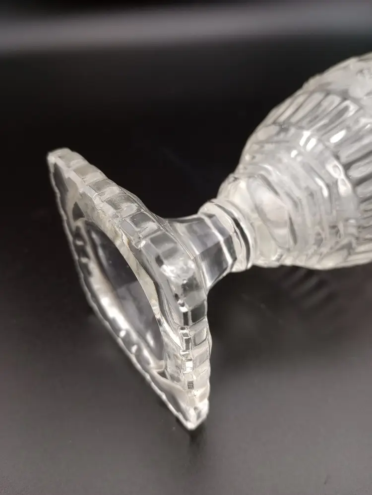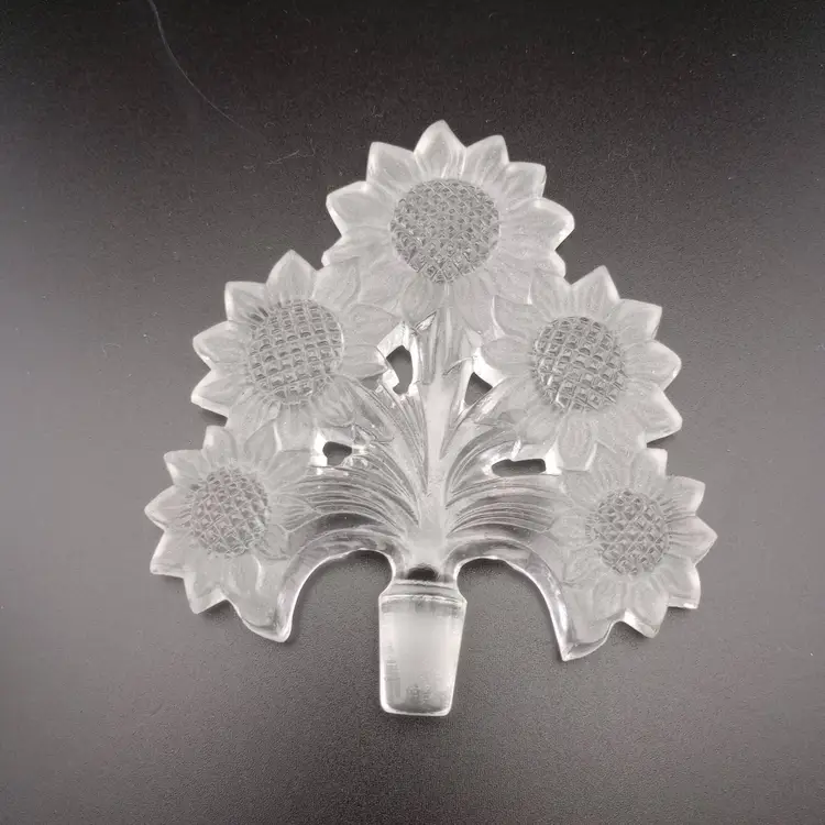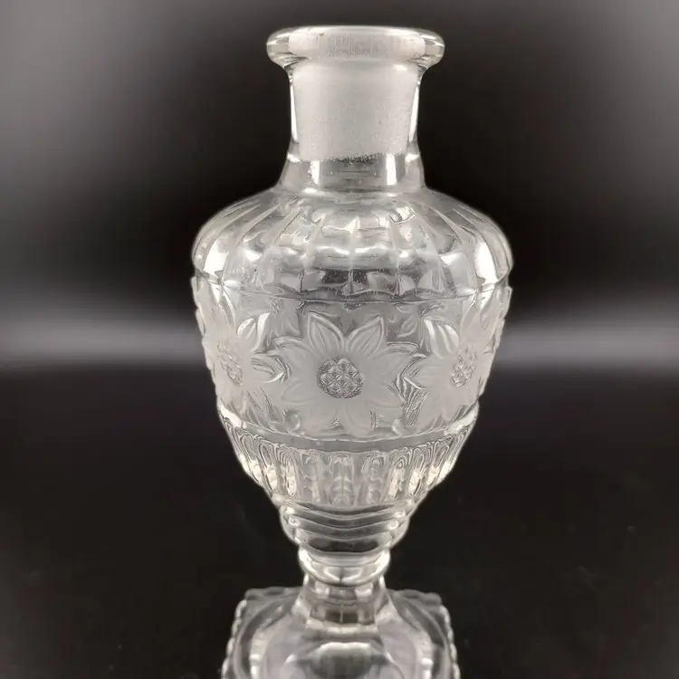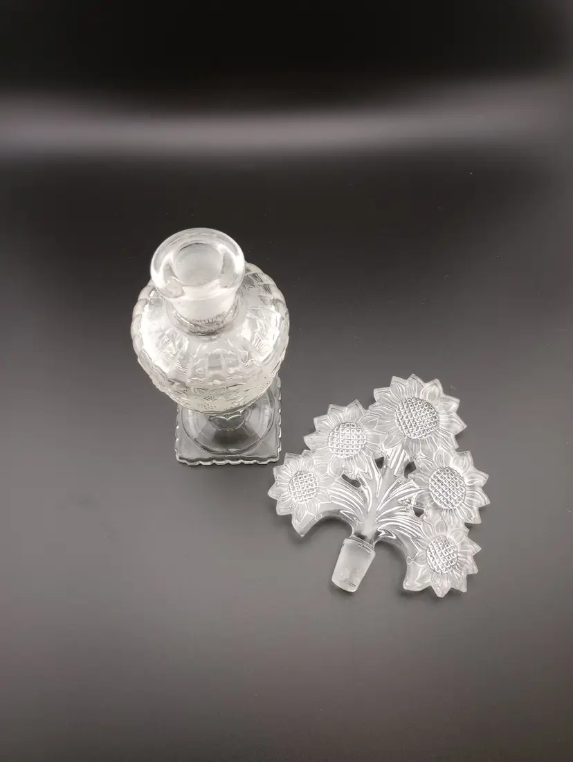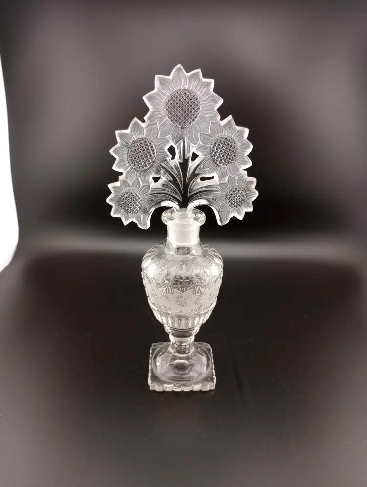 This piece is spectacular. A vintage perfume/cologne bottle from Imperial Glass in a sunflower pattern. The stopper is an amazing spray of sunflowers, carved on one side, flat on the other. At over 10" tall, it makes quite a statement. It's in good vintage condition with a chip on one of the petals.