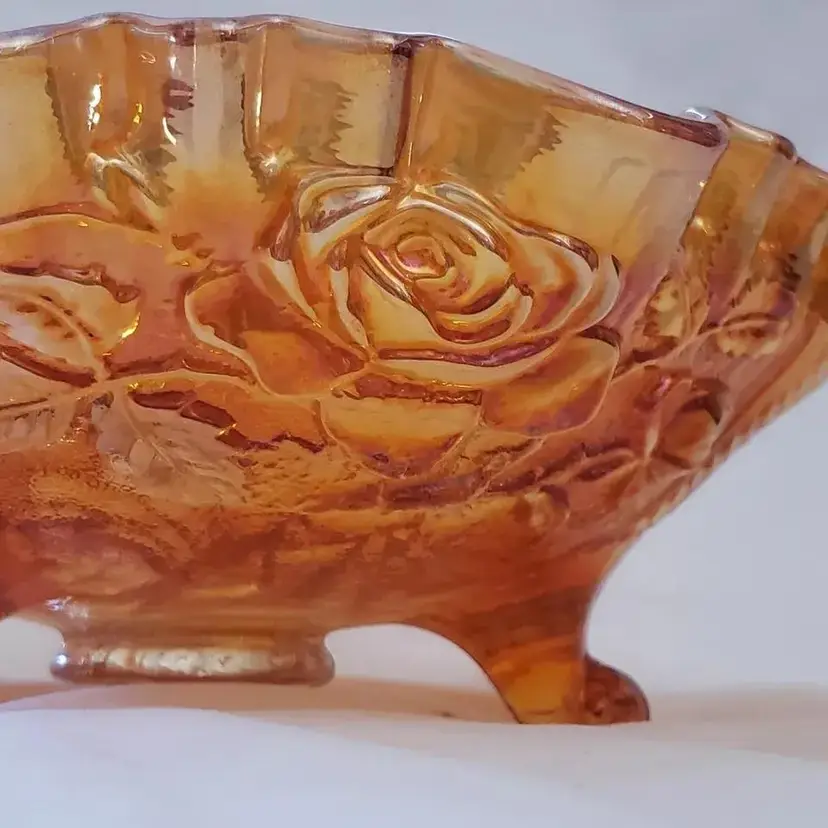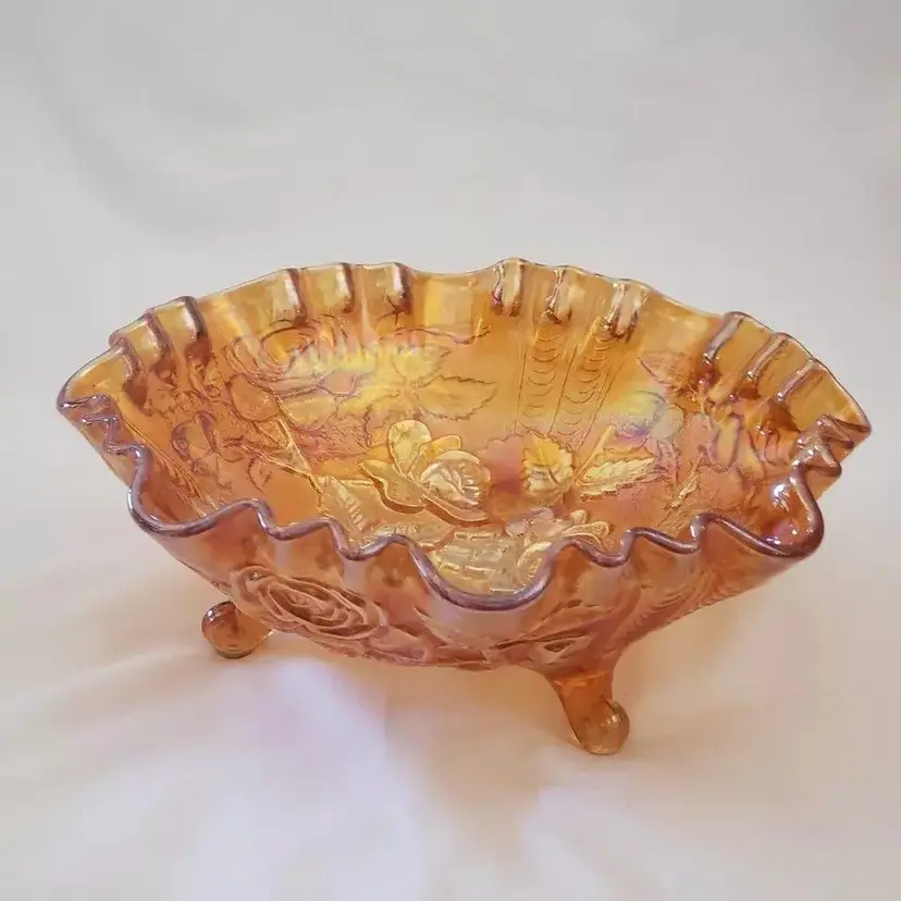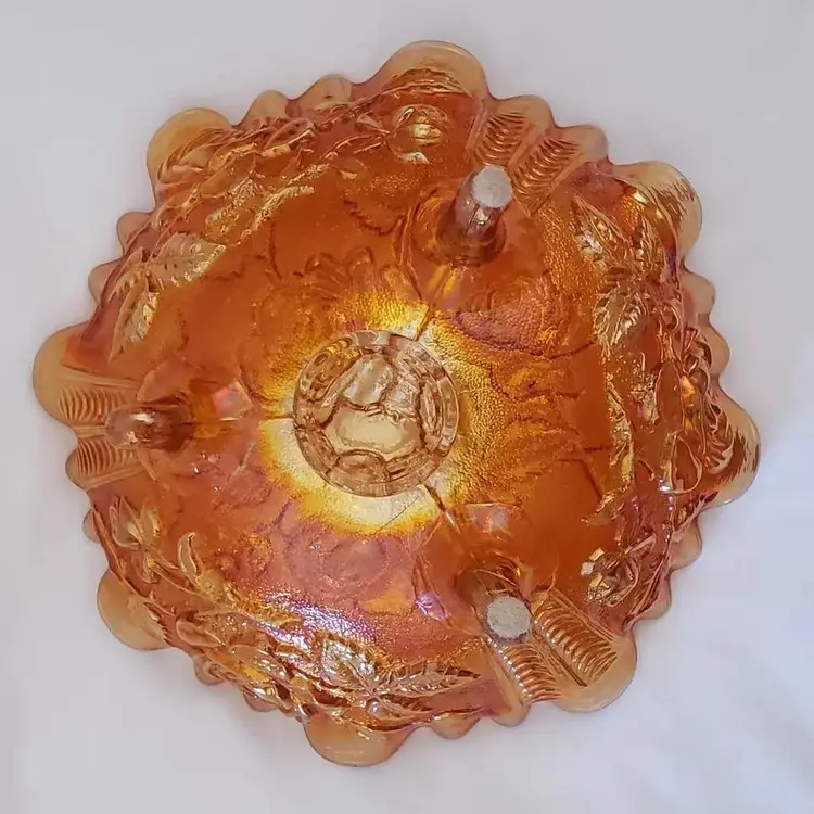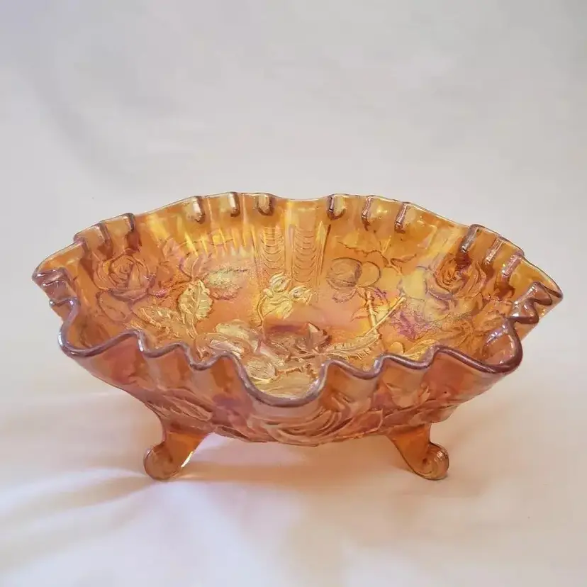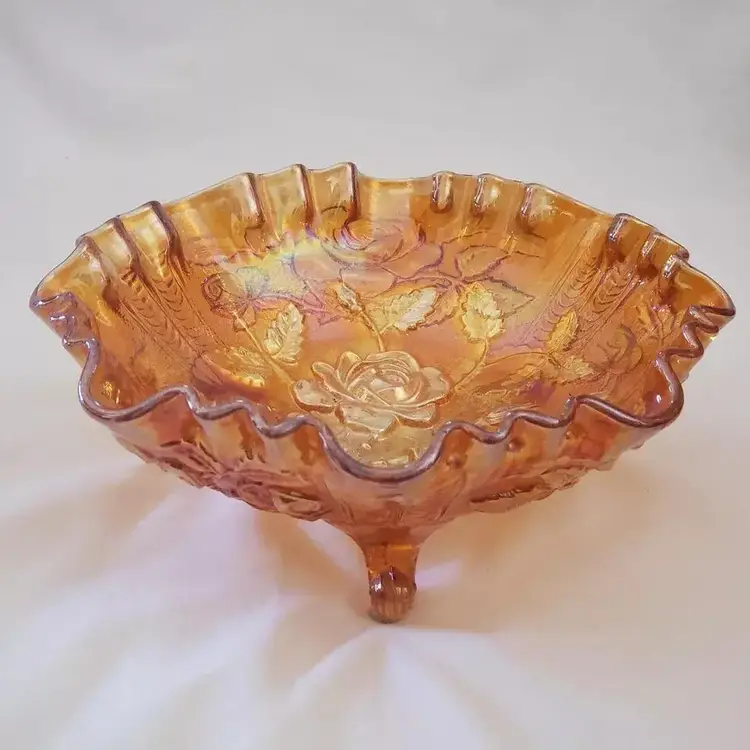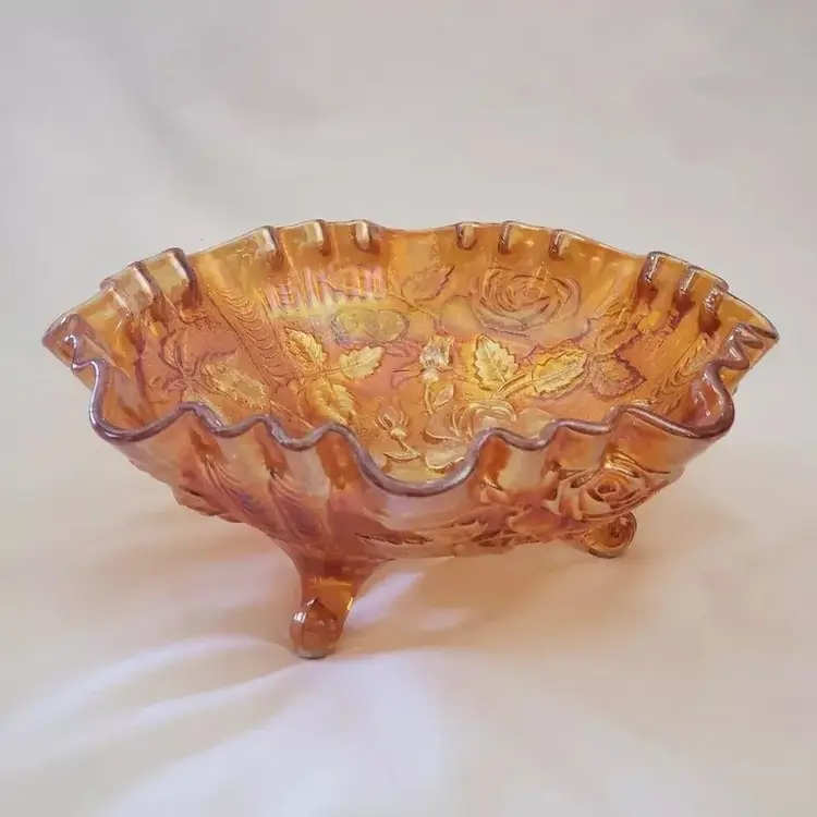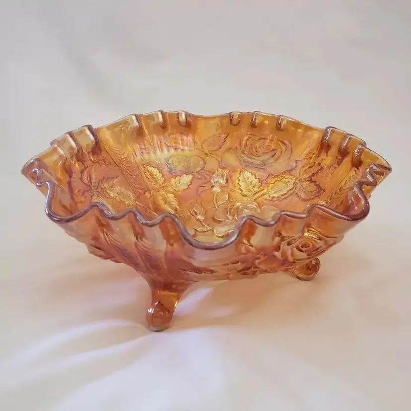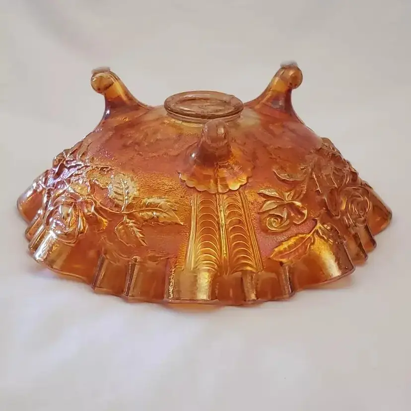 Vintage Imperial Glass Wild Rose Marigold Carnival Glass Footed Ruffled Rim Bowl with faint logo on bottom. Used condition with one of the felt pads is missing on a foot of the bowl, manufacture flaws including dirt and bubbles within the glass. Please view all the photos and read the entire item description and please ask any questions prior to purchase when possible.