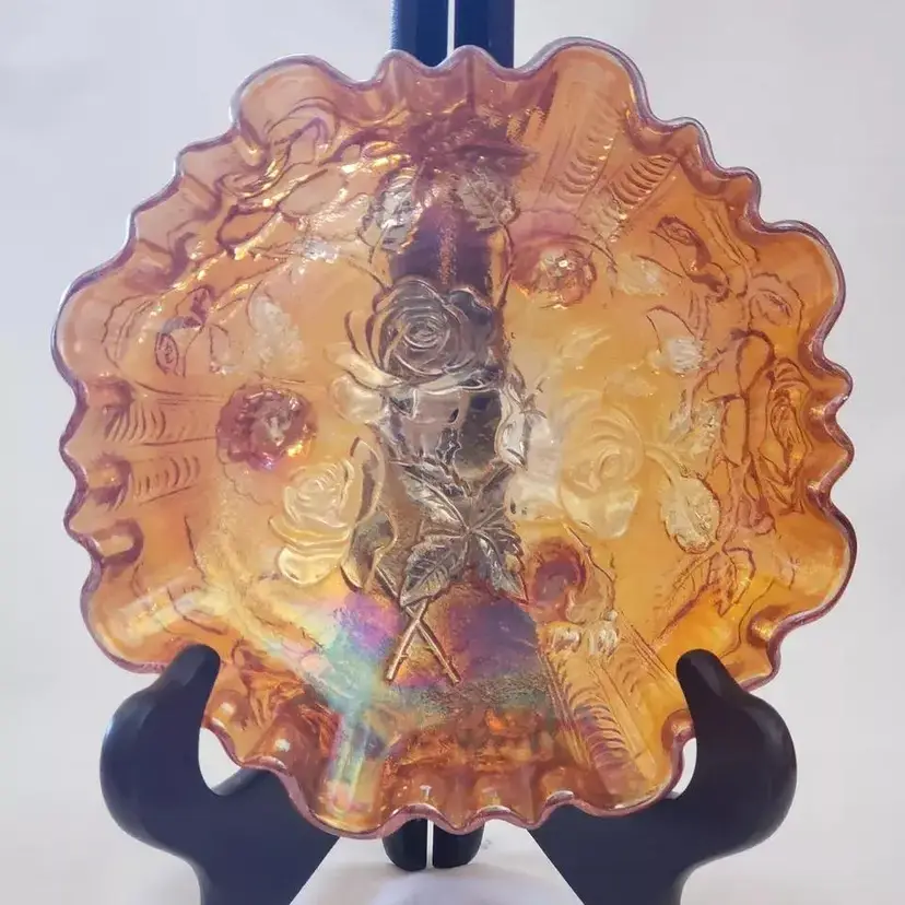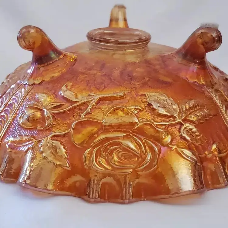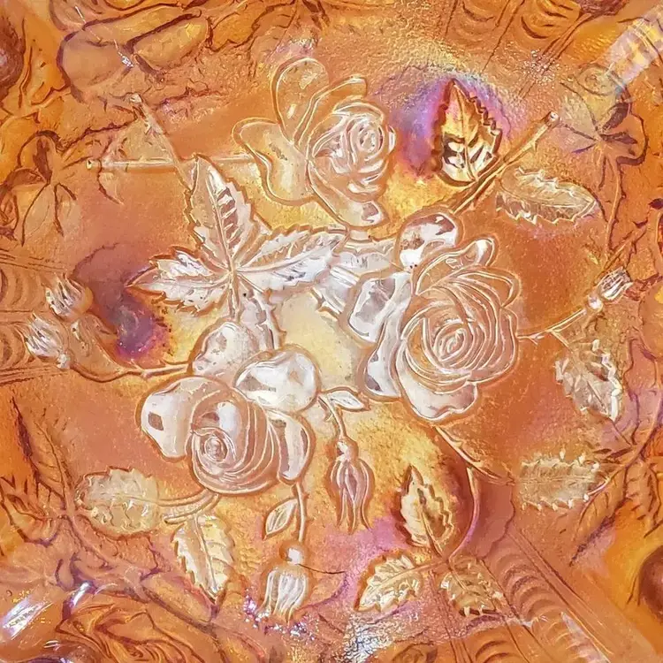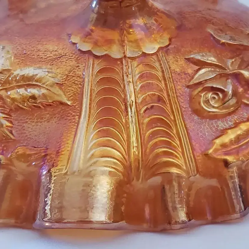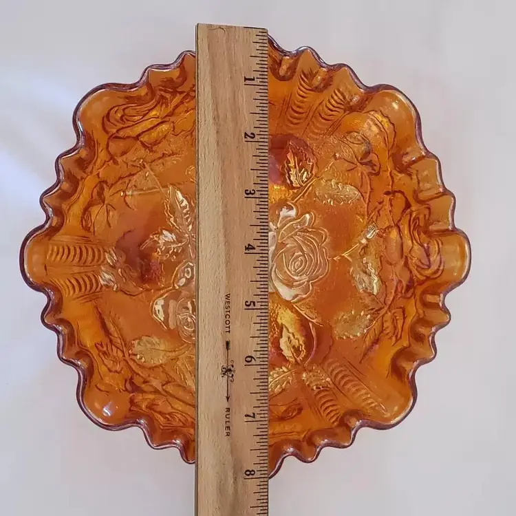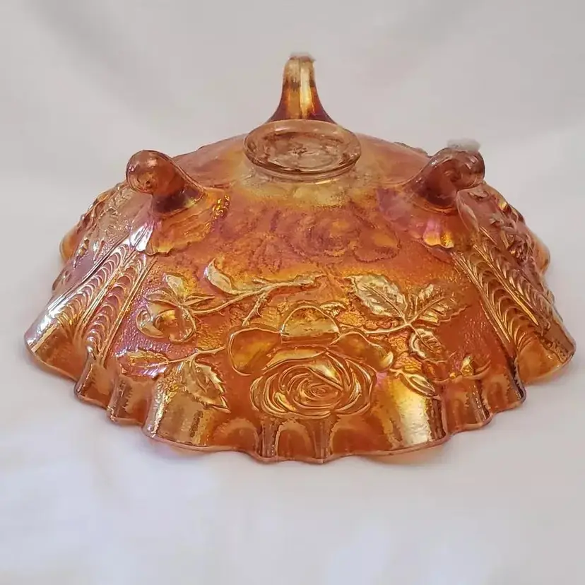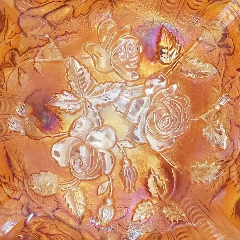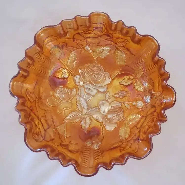 Vintage Imperial Glass Wild Rose Marigold Carnival Glass Footed Ruffled Rim Bowl with faint logo on bottom. Used condition with one of the felt pads is missing on a foot of the bowl, manufacture flaws including dirt and bubbles within the glass. Please view all the photos and read the entire item description and please ask any questions prior to purchase when possible.