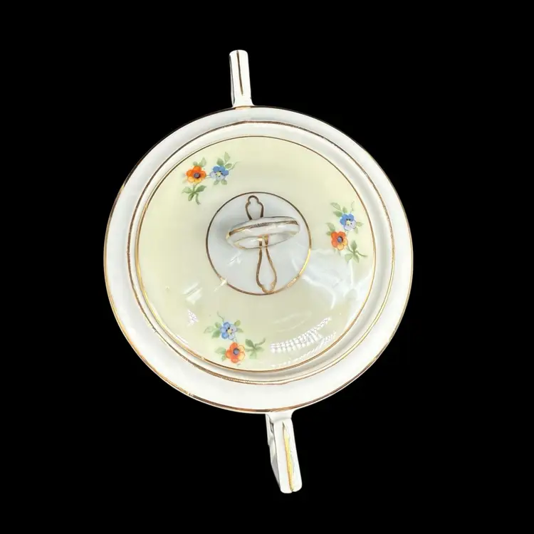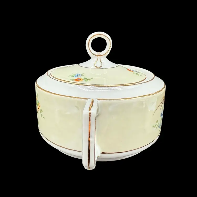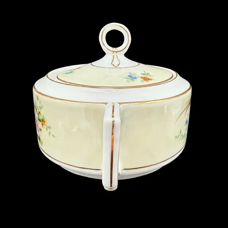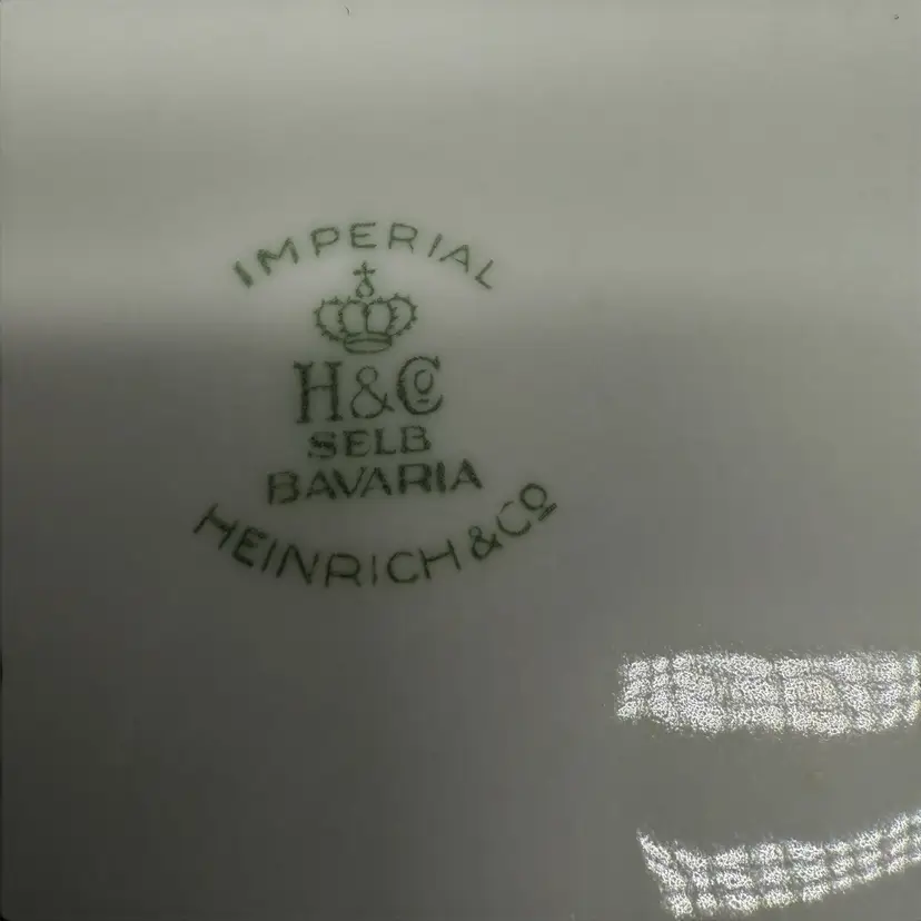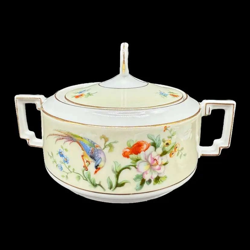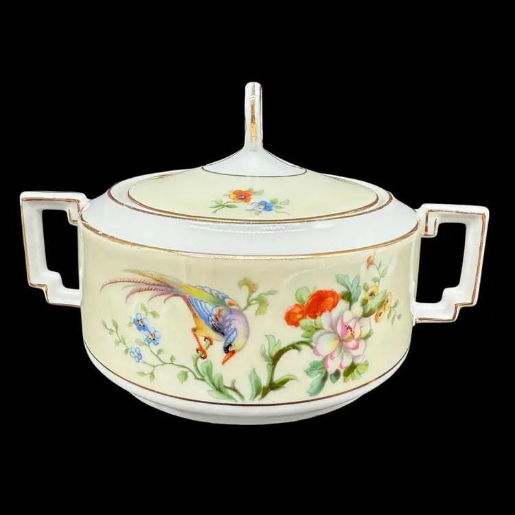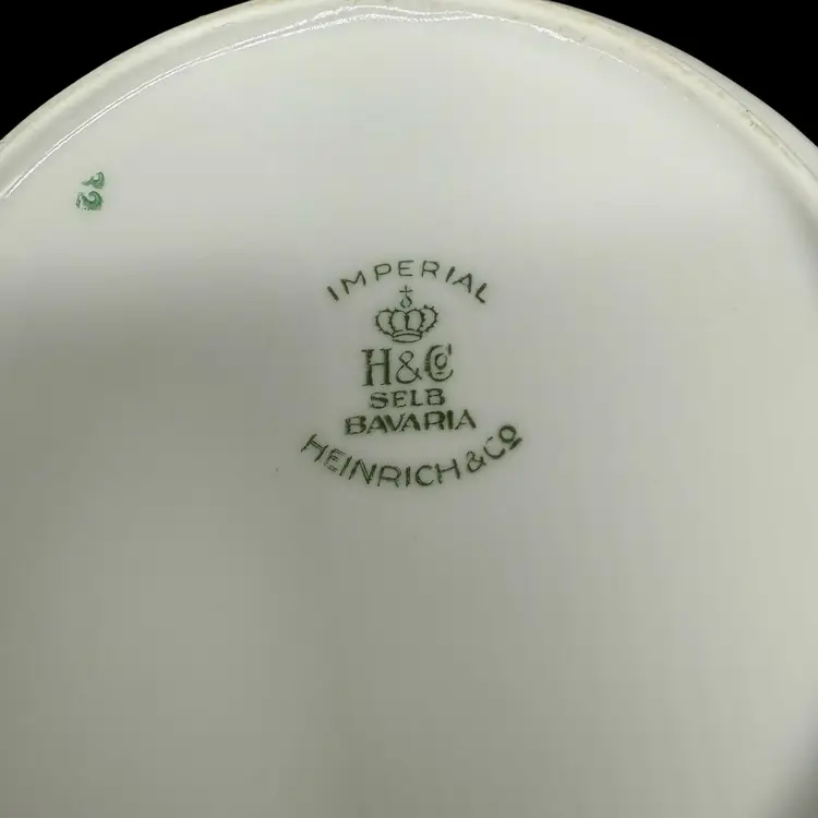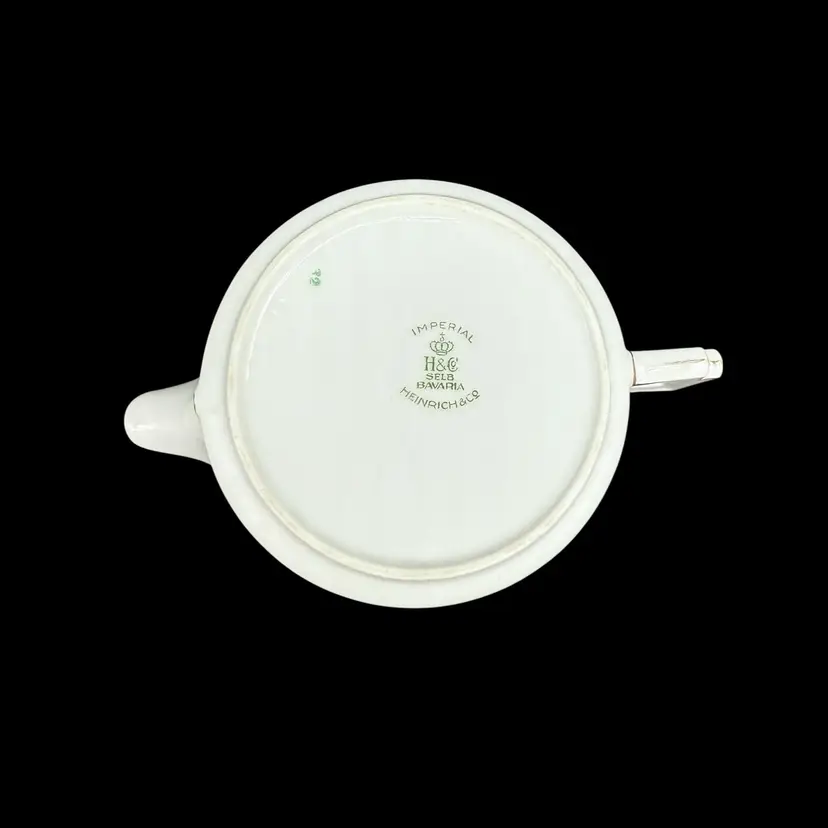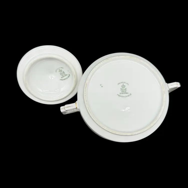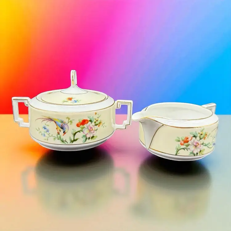 The Imperial Heinrich & Co. H&C Selb Bavaria Songbird creamer and sugar bowl set is a vintage and antique piece of art pottery. Made in Germany in the 1920s, this original set features a beautiful multicolor songbird & floral pattern on porcelain material. The glossy finish and gold trim adds to its charm, making it a unique and decorative addition to any dining table or collector's display. The brand's reputation for quality craftsmanship is evident in this intricate and stylish set that exudes a charming theme.