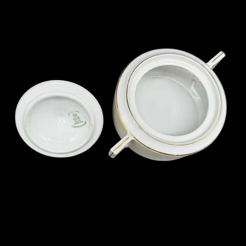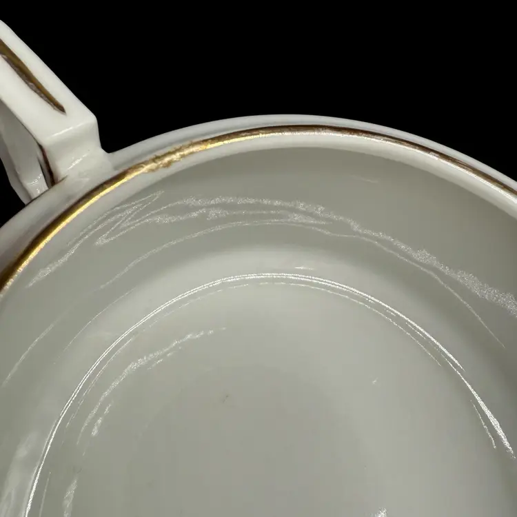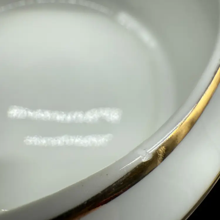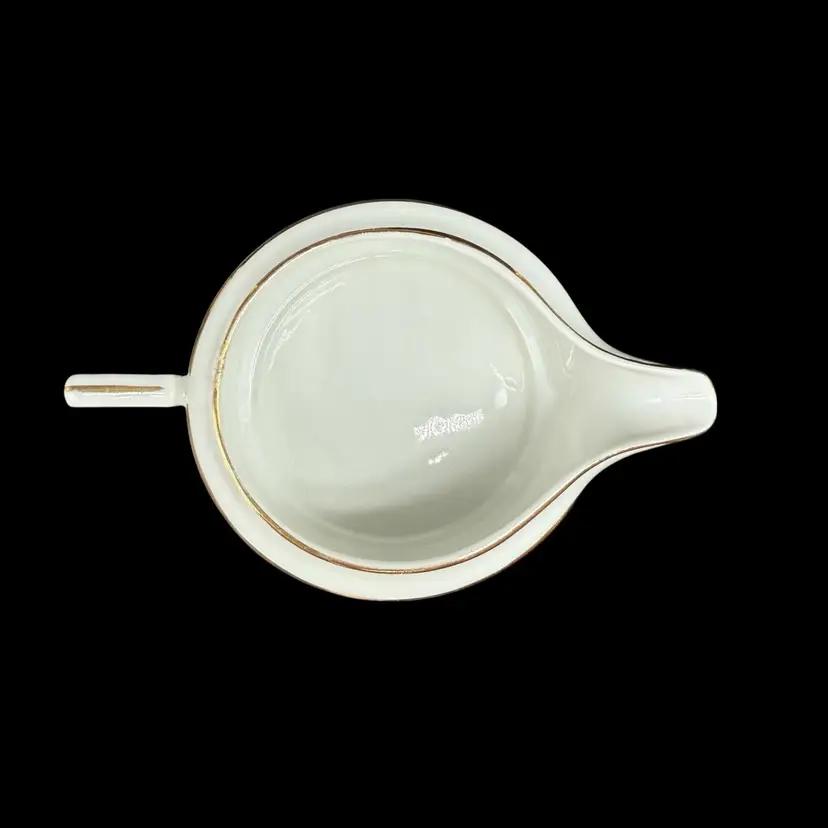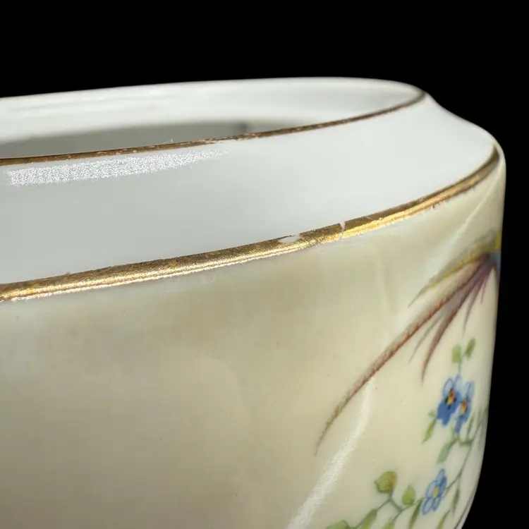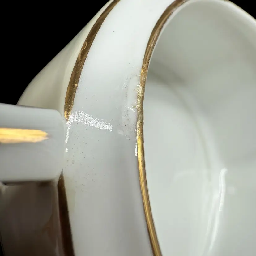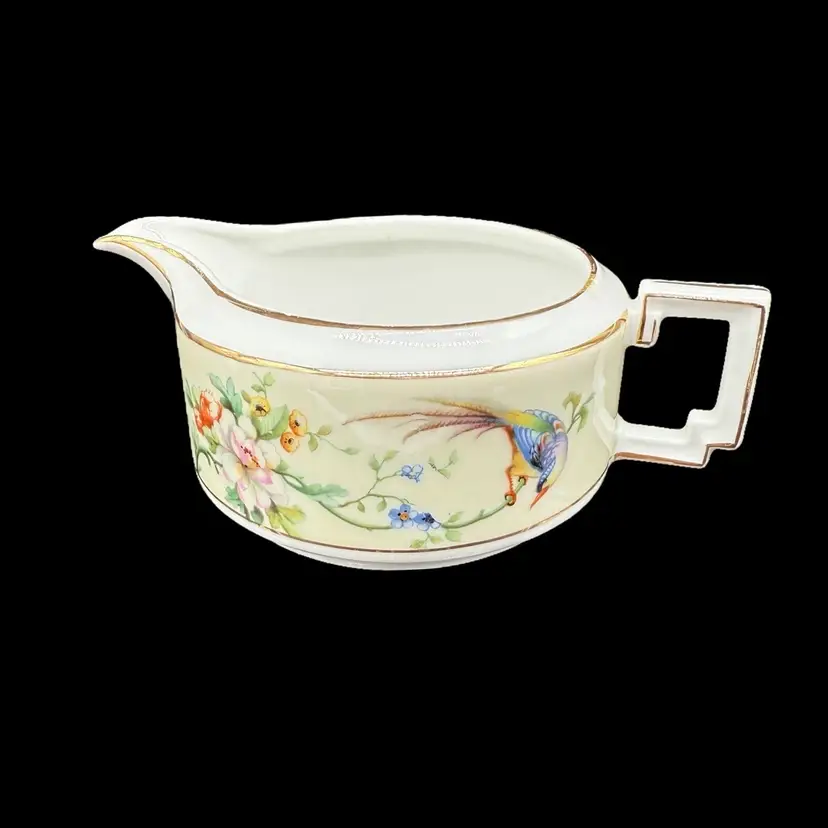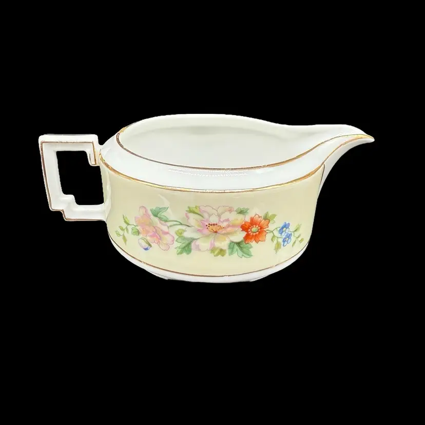 Condition - Preowned Good - some signs of use/age including some scratches, debris and crazing. There is some wear to the gold trim. The creamer has a small chips on the rim, and what looks like a melted area (possible repair).