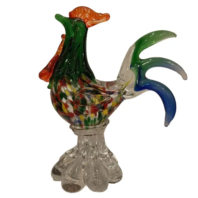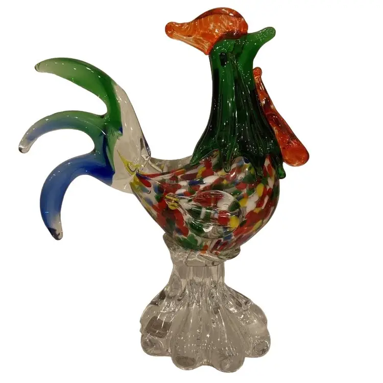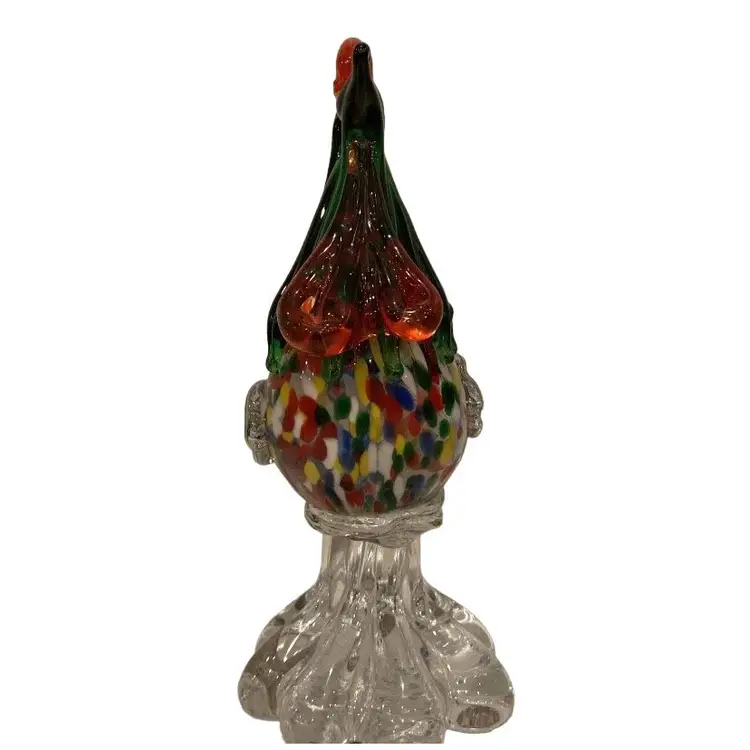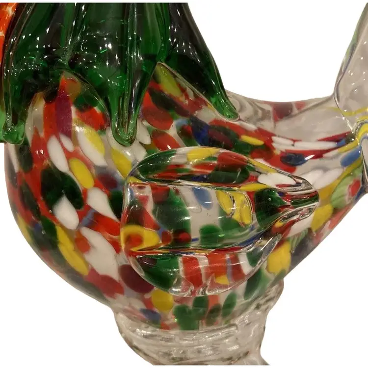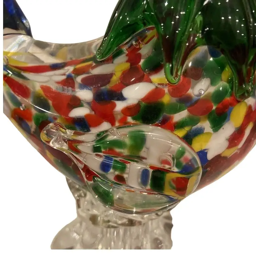 Add some color and life to your farmhouse décor with this beautiful glass rooster figurine with intricate details, this vintage original piece stands at 9 inches tall and weighs 3.5 The multicolor confetti design adds a playful touch to the animal theme, with a focus on the beautiful rooster subject. This import art glass animal is a one-of-a-kind piece, perfect for collectors and enthusiasts alike. Pre-owned, excellent condition with no chips. It has some felt pads on bottom. It is absolutely beautiful! The pictures don’t do it justice. 🐓