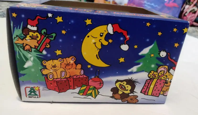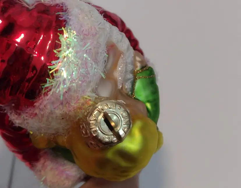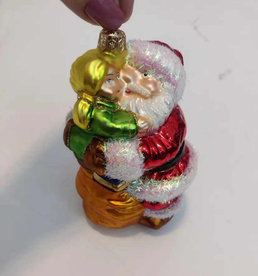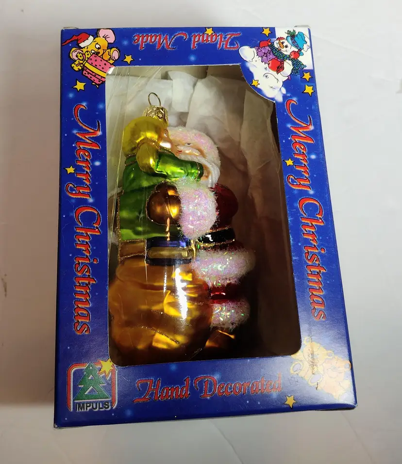 Item is pre-owned and in very good condition with no cracks or chips. The boxes plastic front cover is missing however, but box is still in good shape. Smoke free environment. This is a sweet little ornament that is hand blown and very colorful with Santa holding or hugging a little girl with his sack of toys. The fur on his coat has long strands of glitter. The box has got the cutest graphics! Ornament measures 5" tall x 2.5" wide x 3" long.