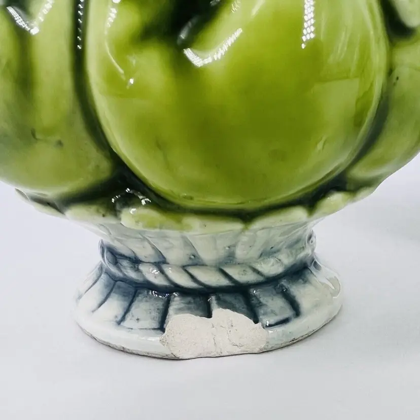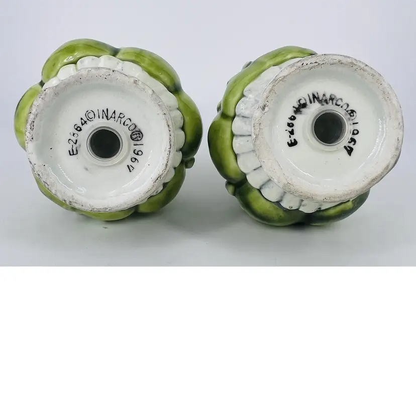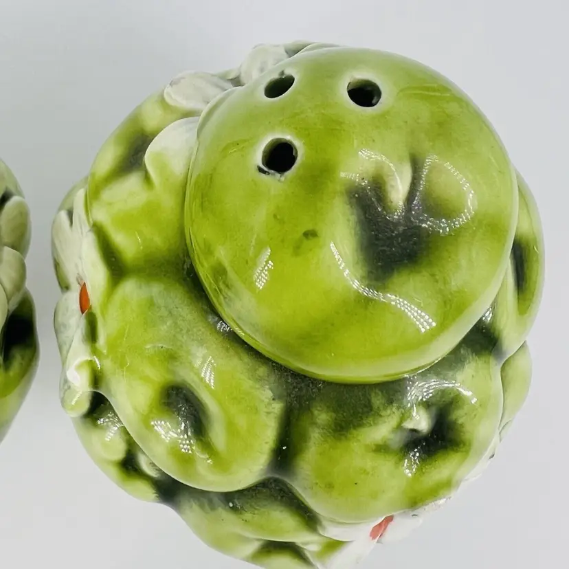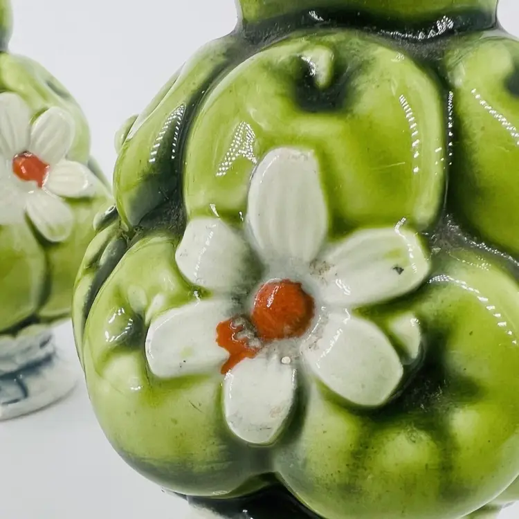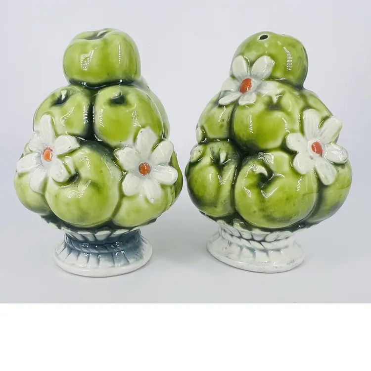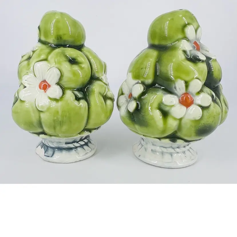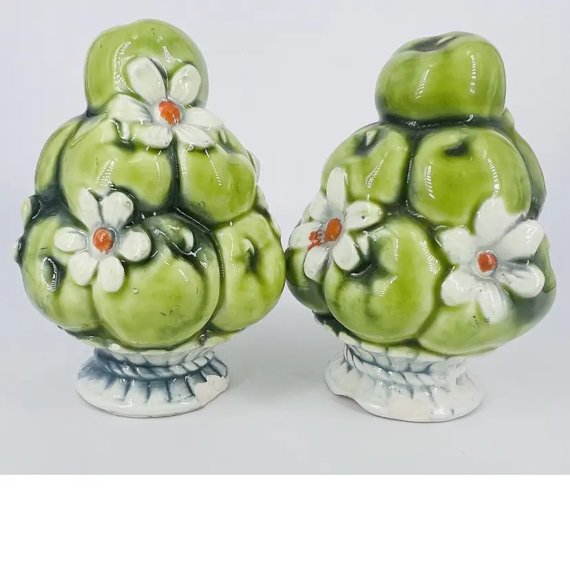 This set is in good vintage condition. Some chipping around the base of the shakers. Does not affect their stability. Minor chipping to paint around shaker holes. Comes with clear plastic stoppers. See all images for details. Measures 4" tall by 2 1/2" wide. Weighs 5oz
