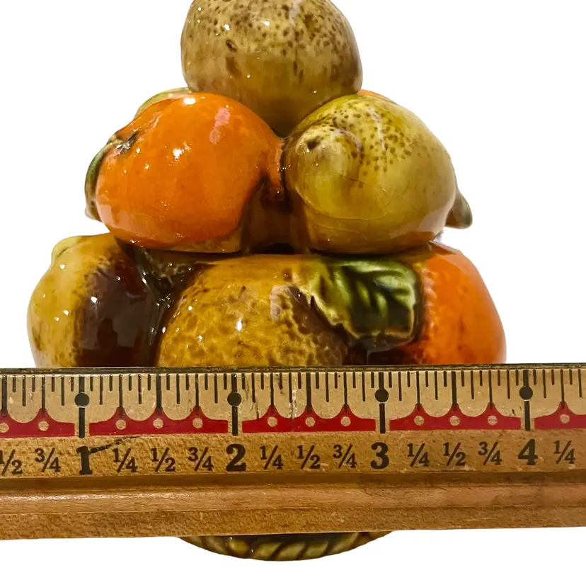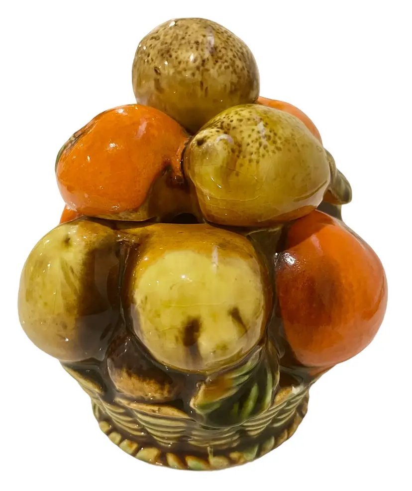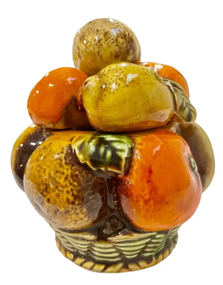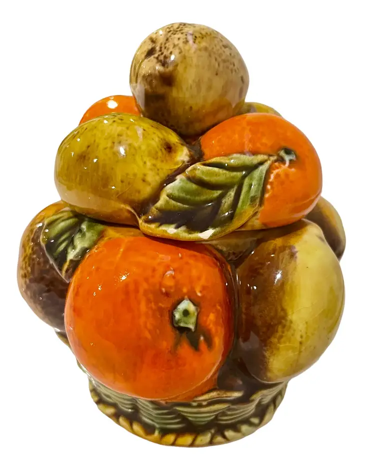 This Inarco Japan E3352 Sugar or Jam Jar is a lovely addition to any mid-century modern kitchen. Measuring at 5 inches in height and 4 inches in width, this medium-sized jar has a lift-off lid and a single compartment. The jar weighs 8.8 oz and comes with a matching lid. These is some wear on one leaf and the stem of an orange on the lid. Please enlarge and inspect photos to determine it’s accurate condition. With its vibrant orange spice fruit design, this ceramic and porcelain jar is perfect for storing sugar or jam.