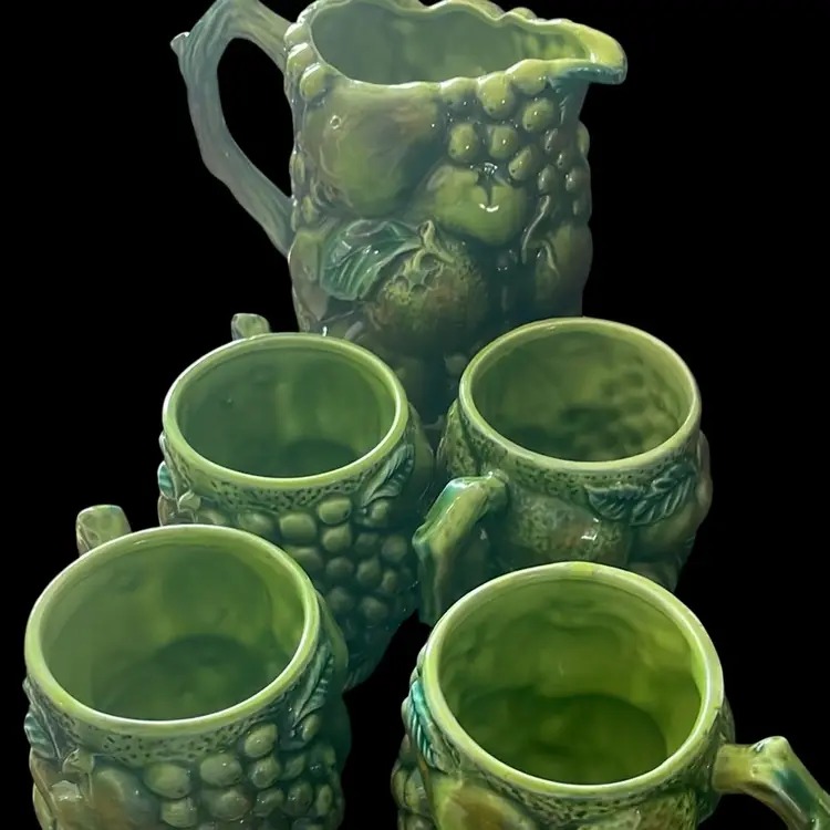 This is a vintage ceramic pitcher and mugs set featuring a vibrant green raised fruit design, manufactured by INARCO in Japan during the mid-century era. Brand: INARCO (International Artware Corporation), Japan. Pattern: Often referred to as "Green Mist" or "Green Spice," featuring embossed grapes, apples, and leaves. Material: Glazed ceramic pottery.