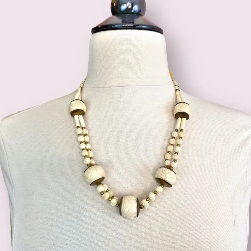 Screw clasp, ornately carved bone beads with bronze spacer beads. Hand strung.