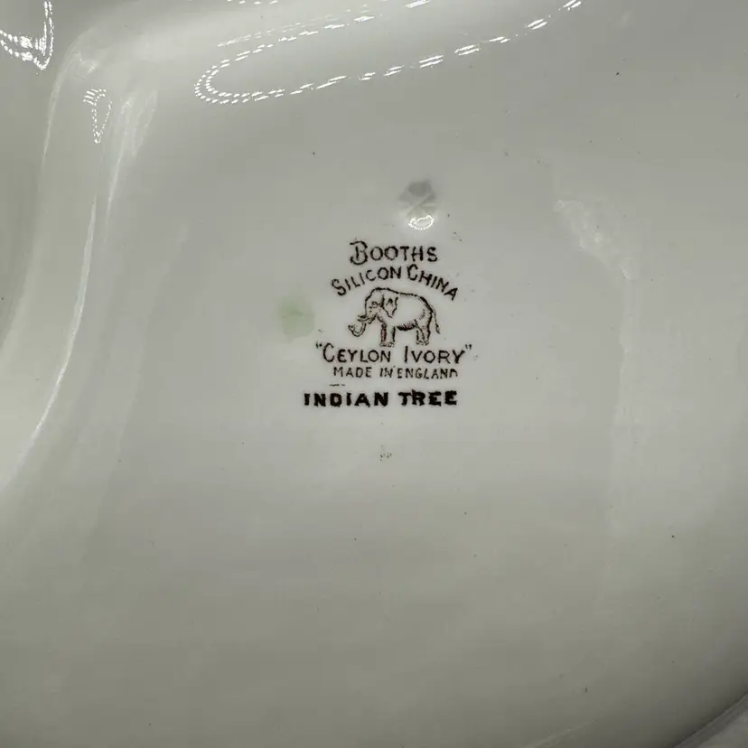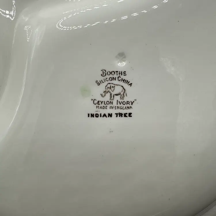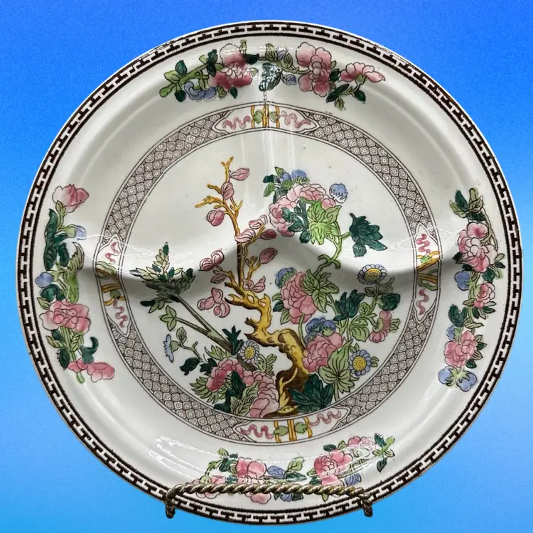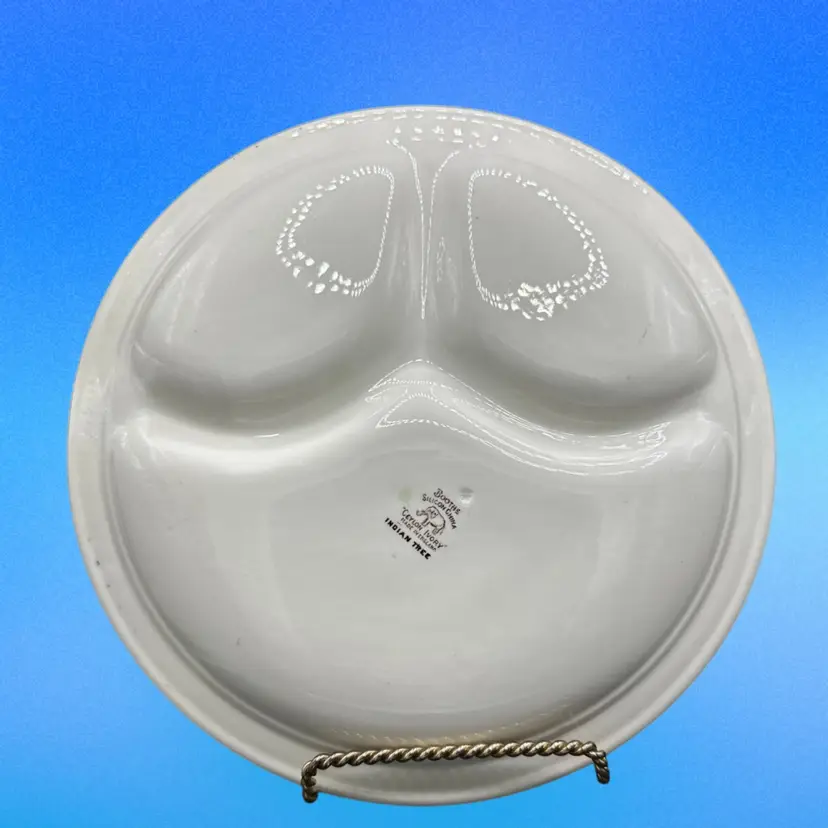 The image shows a vintage Booths Silicon China warming plate, specifically the Indian Tree pattern. This particular plate is designed with a divided section, making it suitable for serving different food items separately. The plate features a central design of a stylized tree with pink blossoms, surrounded by a decorative border. This type of plate was often used to keep food warm at the table.