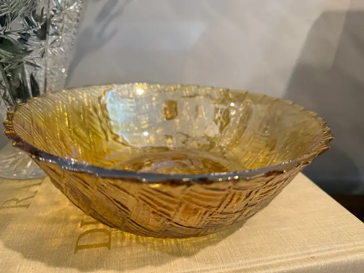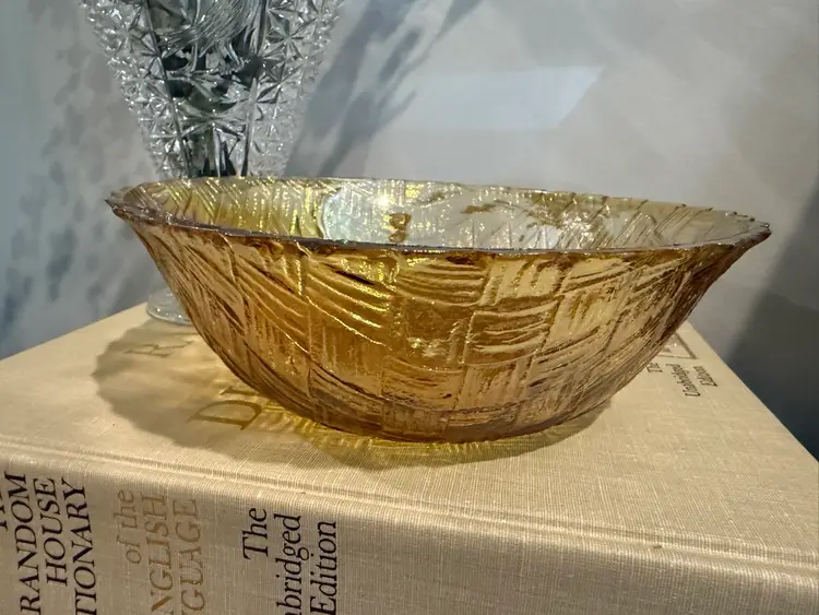 Vibrant vintage Indiana Carnival Glass bowl, featuring a distinctive basket weave pattern and stunning iridescent gold finish. This large, eye-catching piece is perfect for display, adding a touch of classic elegance to any home decor.