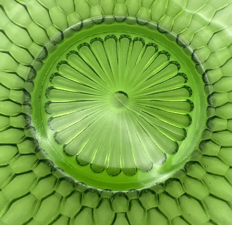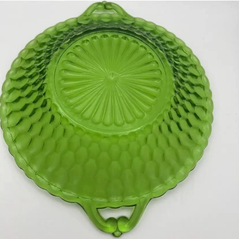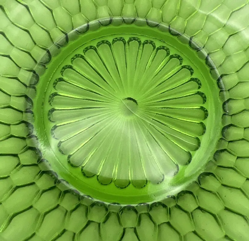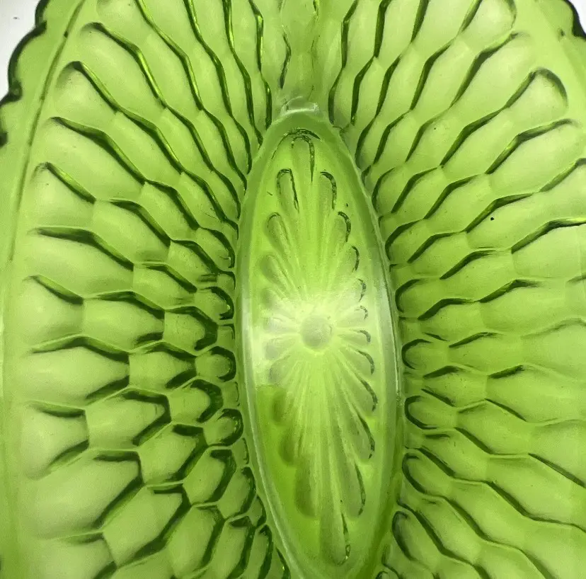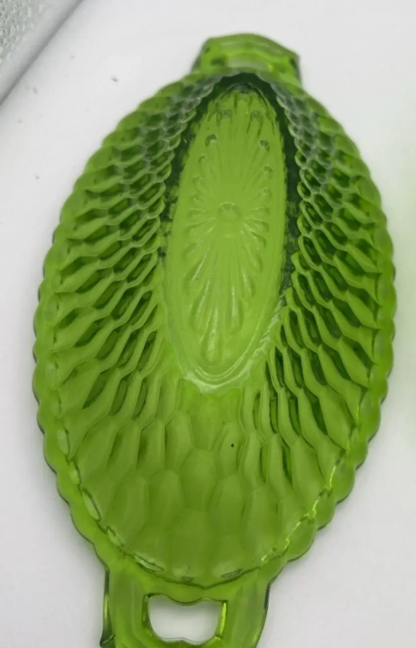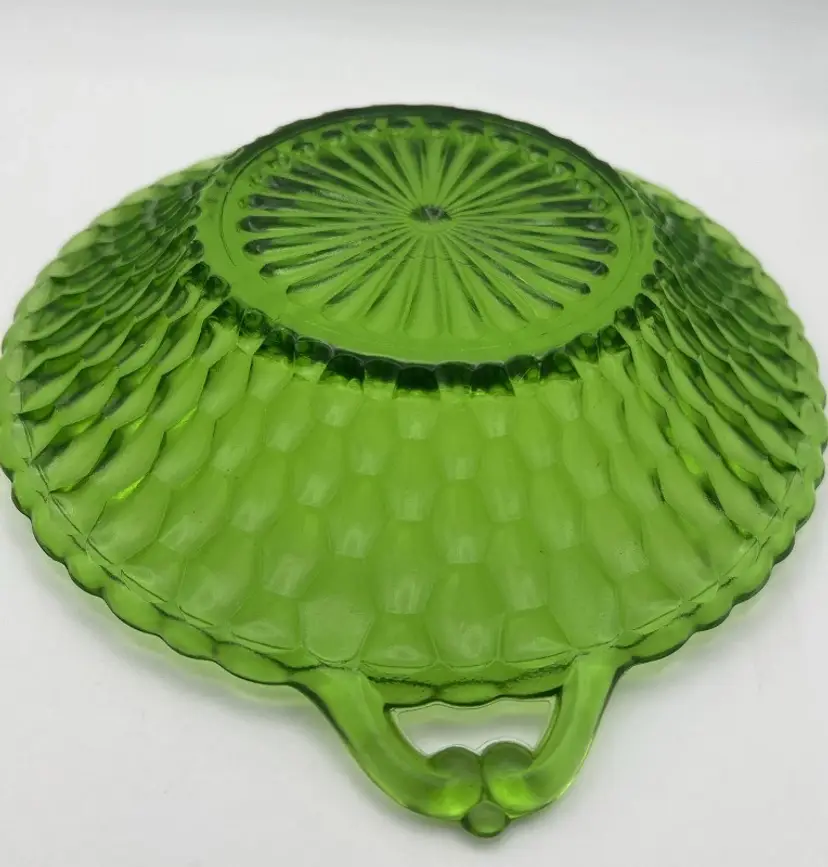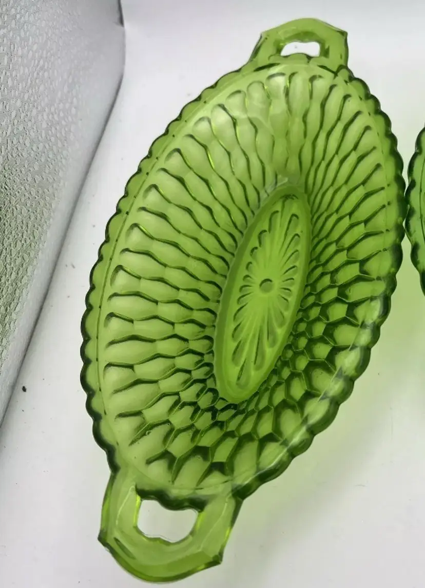 This product is a set of two Indiana Glass 1960s oval handled dish/pickle dish with a honeycomb pattern in green depression glass. These vintage pieces are from the 1960s and feature a mid-century modern style. The dishes have a unique design with two compartments and handles, making them a decorative and functional addition to any vintage collection. The Indiana Glass brand adds authenticity to these original pieces, making them a valuable and collectible item for those who appreciate retro glassware. The round dish is 7.5” diameter edge to edge not including handles. The oval dimensions are 7” length by 4” width. Excellent pre-condition! No chips! Beautiful pieces! Love the color!