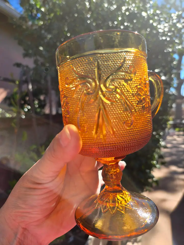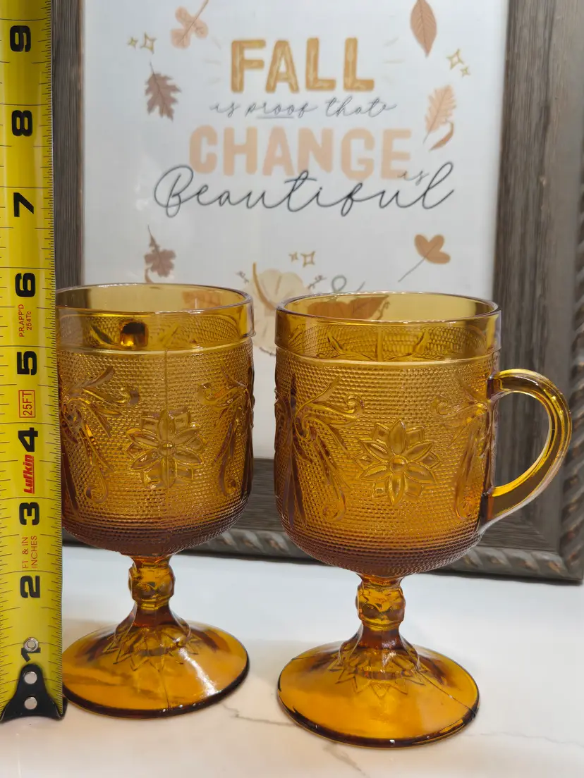 These goblets are absolutely stunning! The amber is rich in color and the etching design is beautiful. A gorgeous autumn color! Tiara Indiana Glass Amber Sandwich 4 oz. Footed Wine Goblets Set of 2. I would use them just for water! No chips, cracks or scratches.