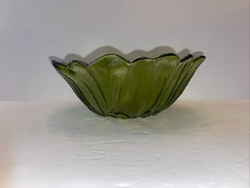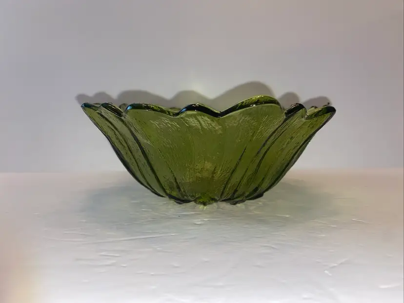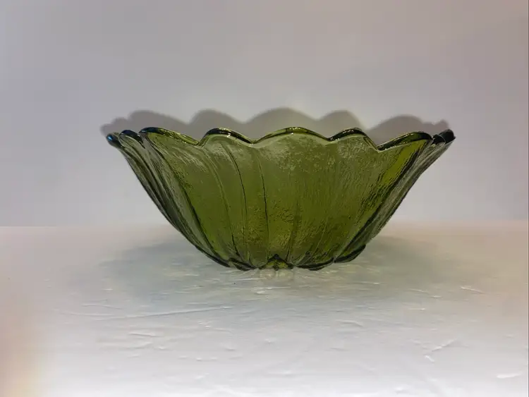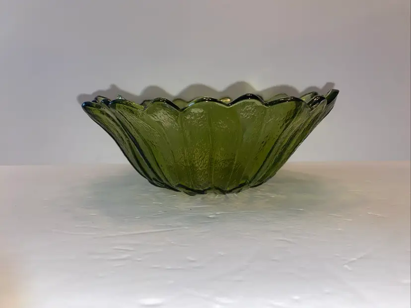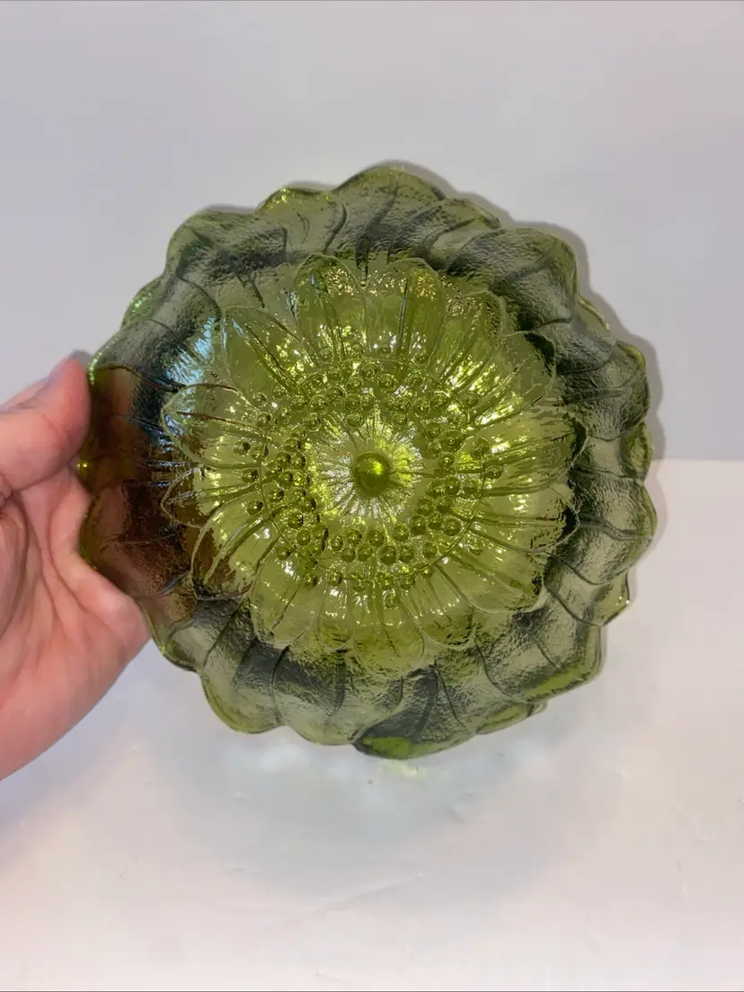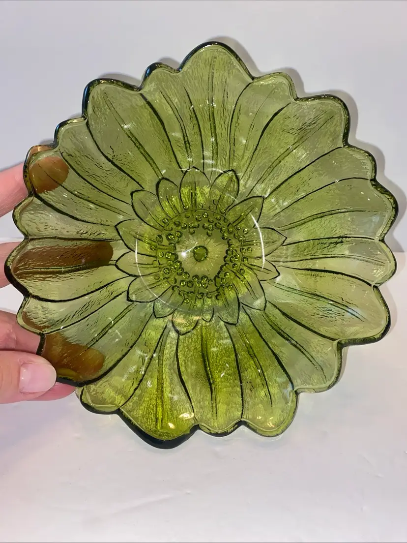 The Indiana Glass Avocado Green Sunflower Shaped Depression Glass Bowl is a beautiful and unique piece of vintage decor perfect for any occasion. Made in America in the mid 20th century, this round bowl features a glossy finish and a stunning sunflower pattern. Measuring 7 inches in diameter and 3 inches in height, this decorative bowl is a unique addition to any collection and a charming gift for teens, boys, and girls alike. The vibrant green color and sunflower theme add a touch of whimsy to any space, making it a lovely choice for those who appreciate classic American glassware. No chips no cracks.