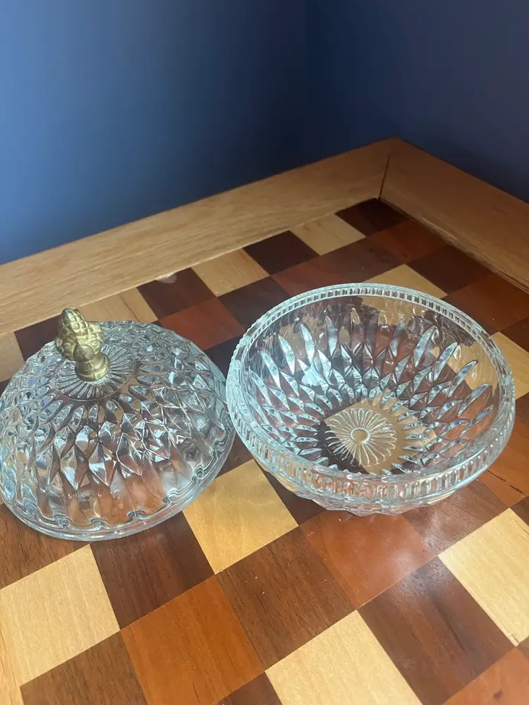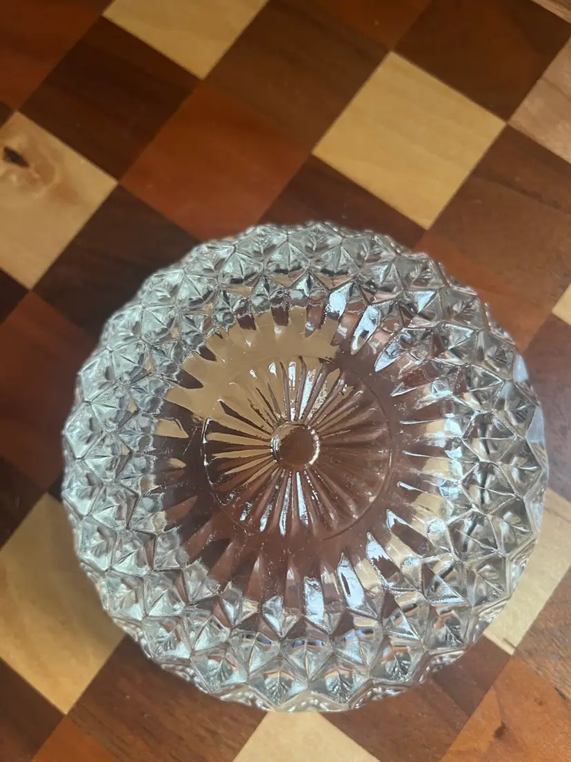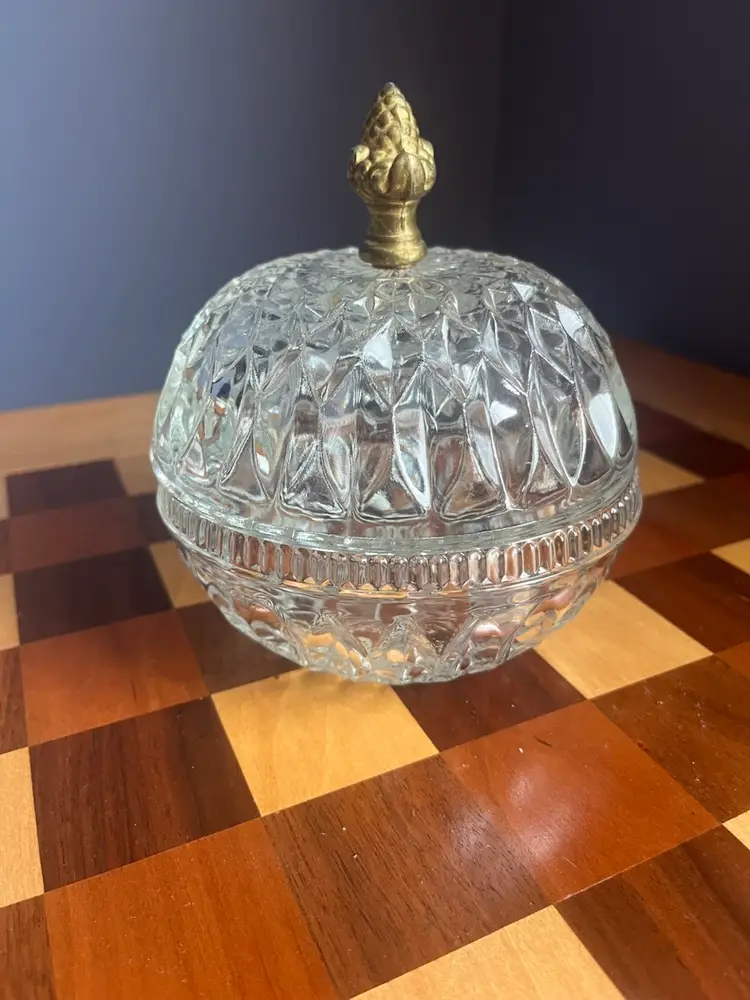 Indiana glass candy dish with lid brass acorn on top 5.5” tall