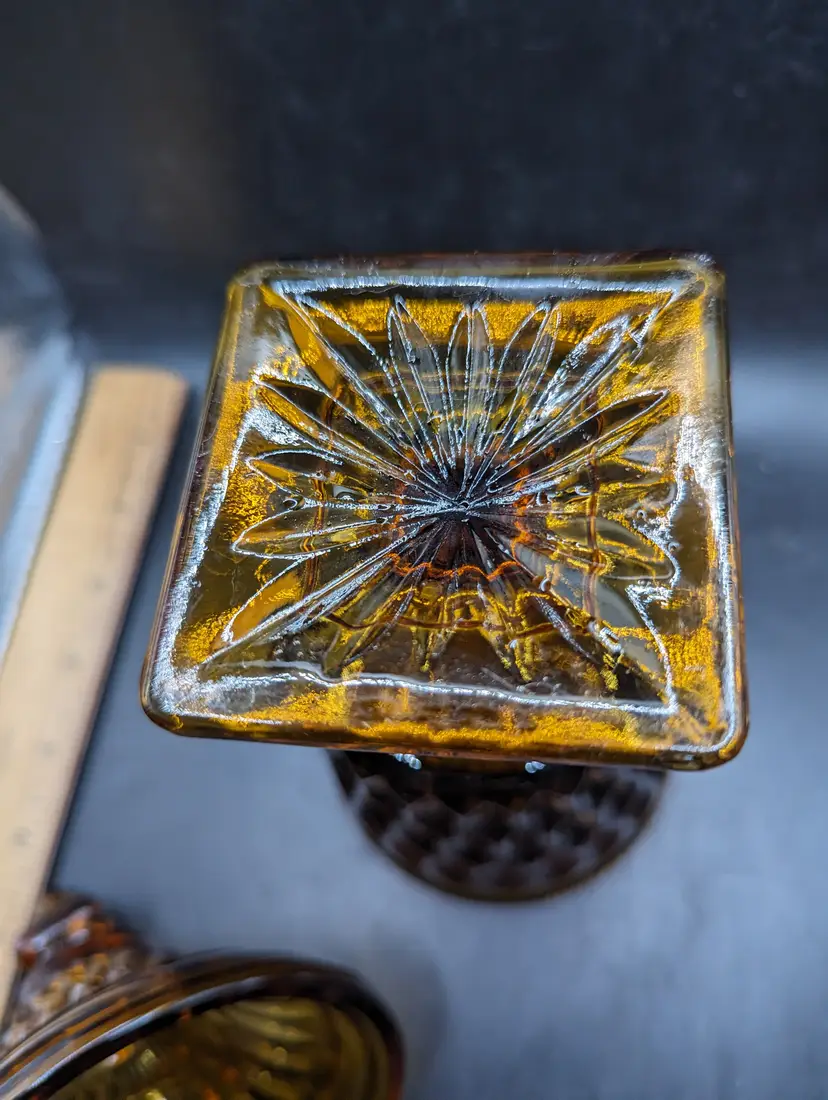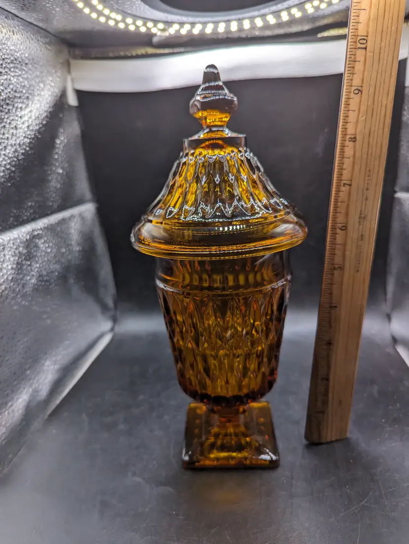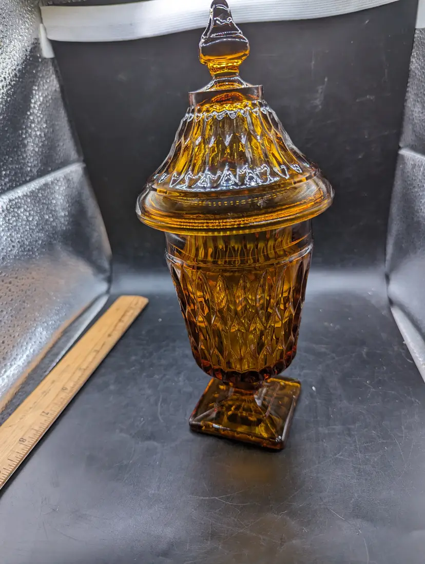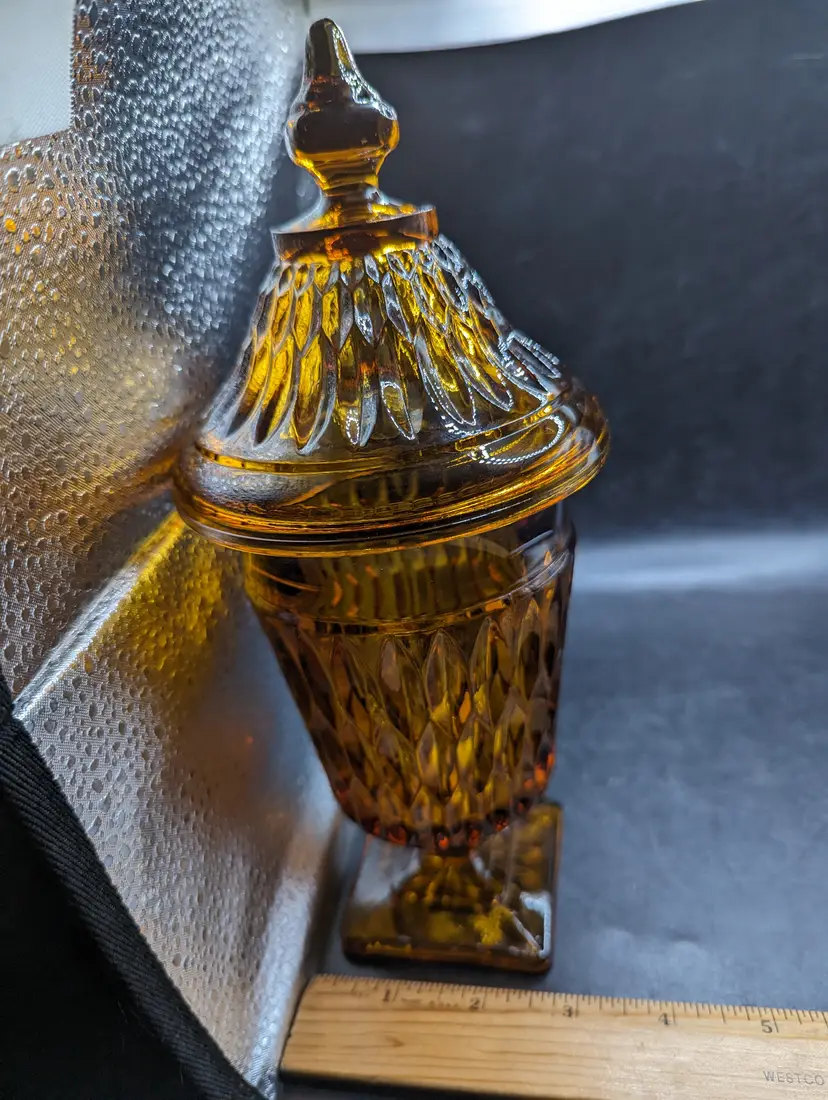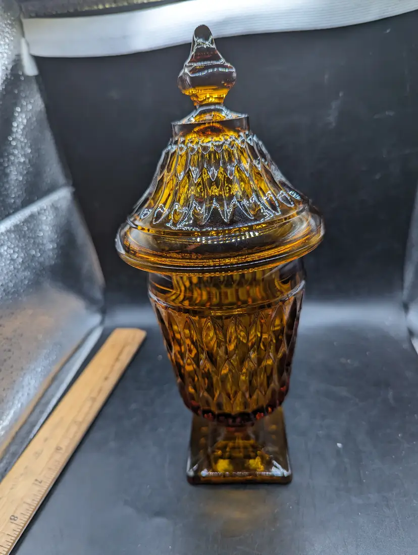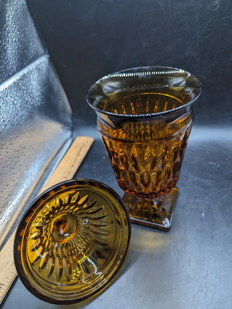 This is a lovely Indiana Glass Candy Dish Mt. Vernon AMBER Apothecary Jar Footed with Lid. No chips or cracks. Please see all pictures for condition and measurements.