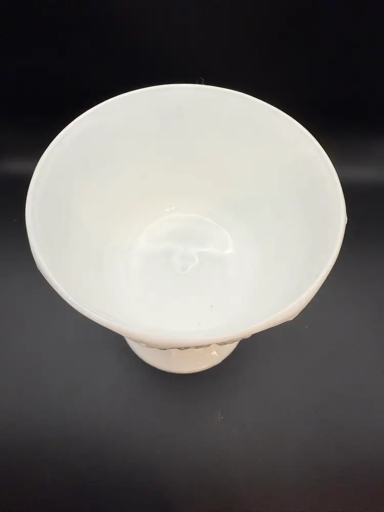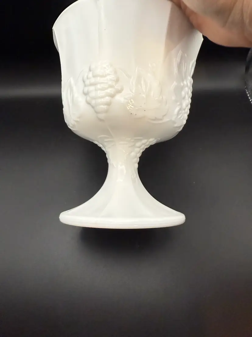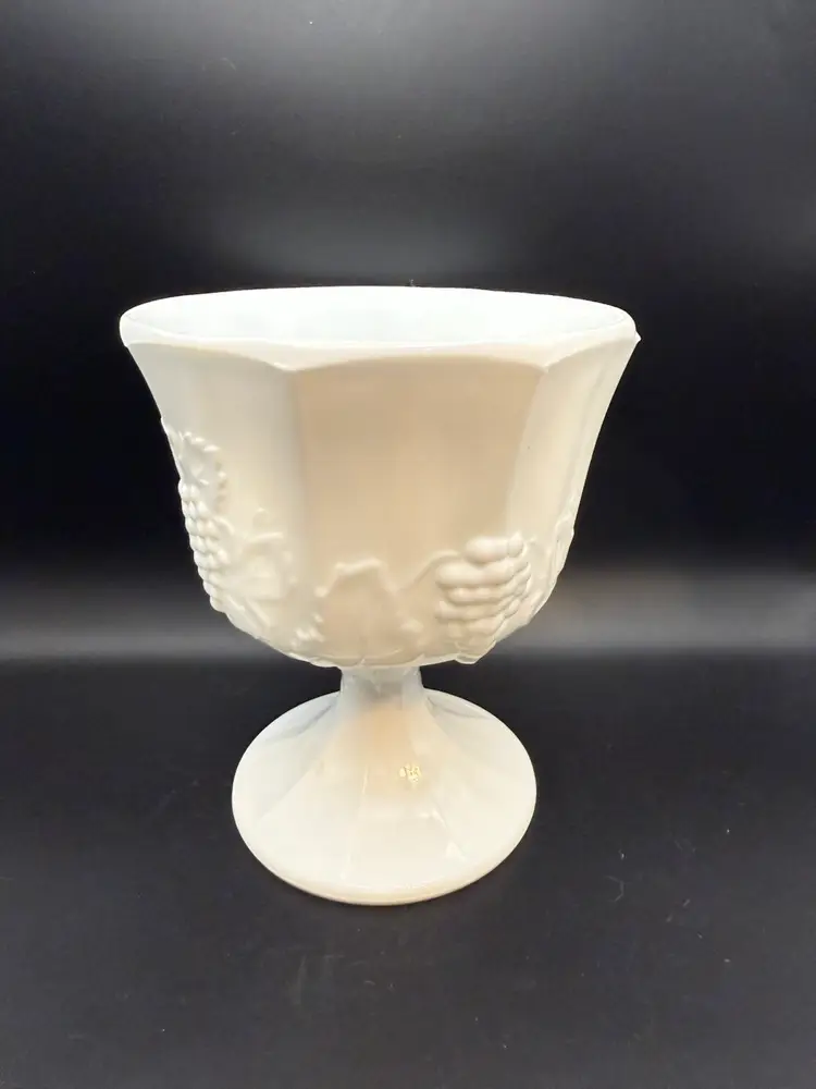 Vintage Indiana Glass Milk Glass Compote. Paneled Harvest Grape, with embossed grapes and grape leaves in Milk glass is from the 1950s/1970s. Stands around 6.5 inches tall, with a base diameter of about 4 inches and a rim diameter of roughly 5.5 inches.