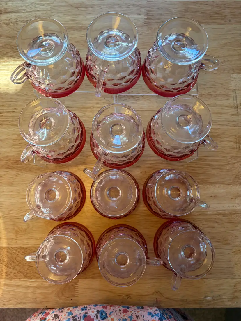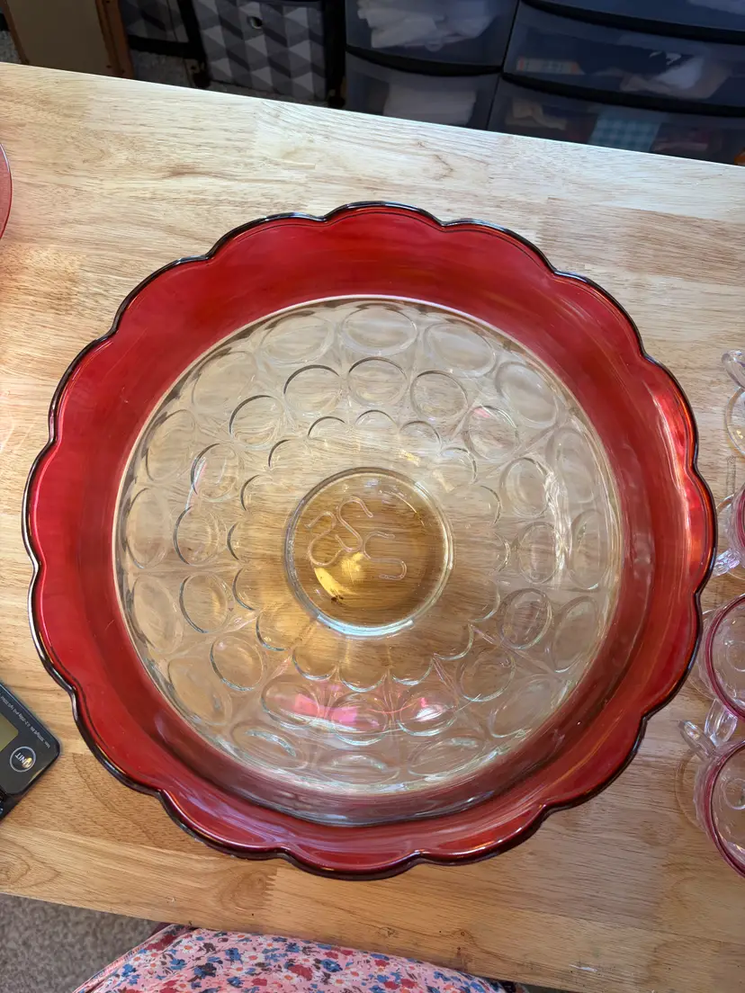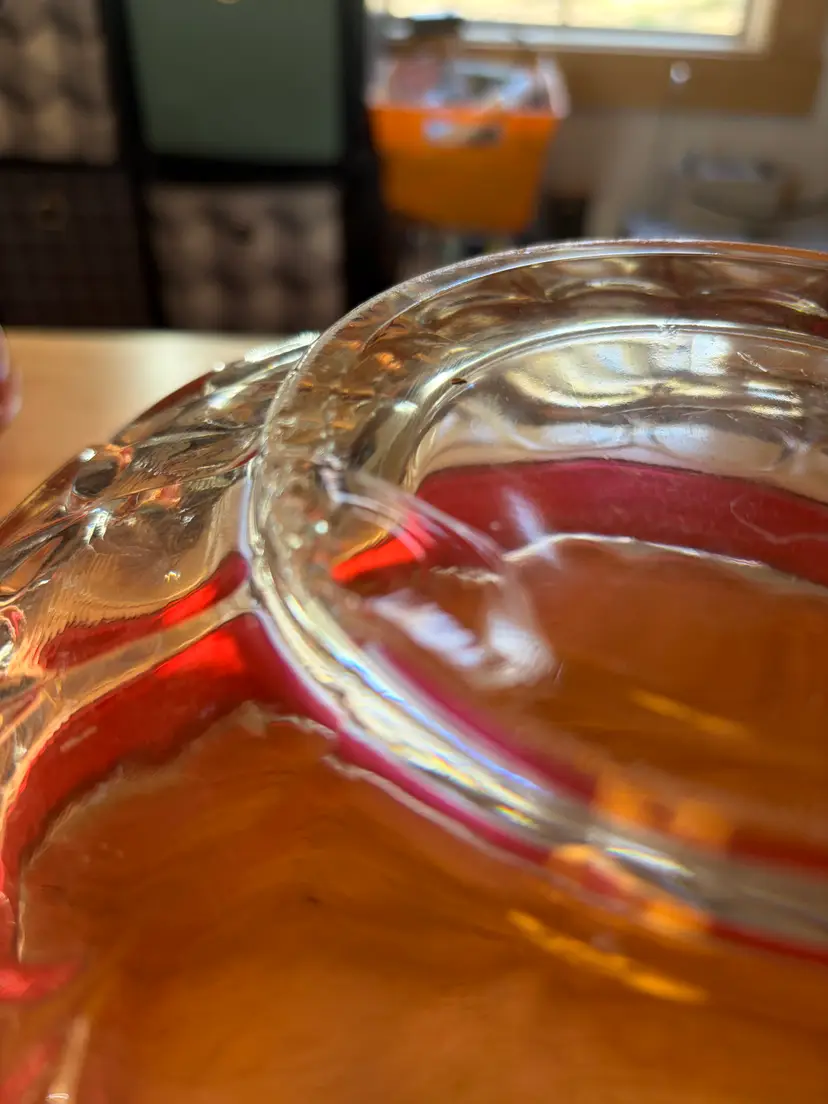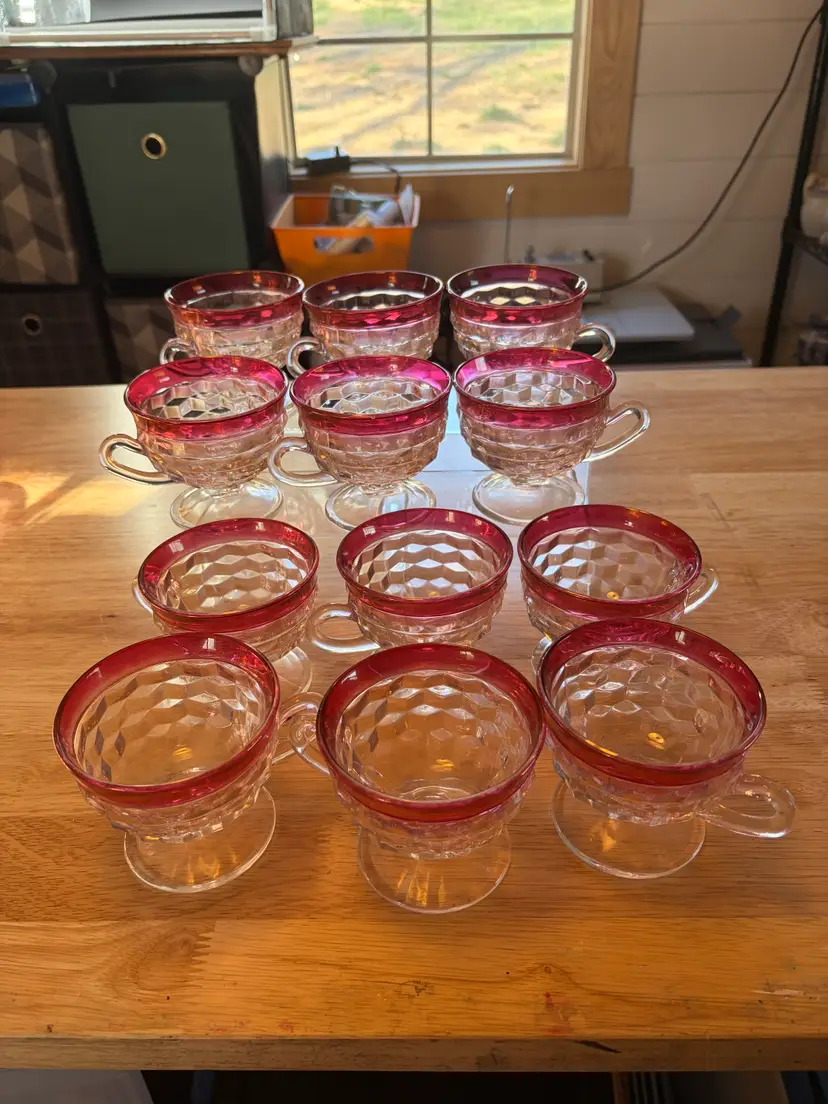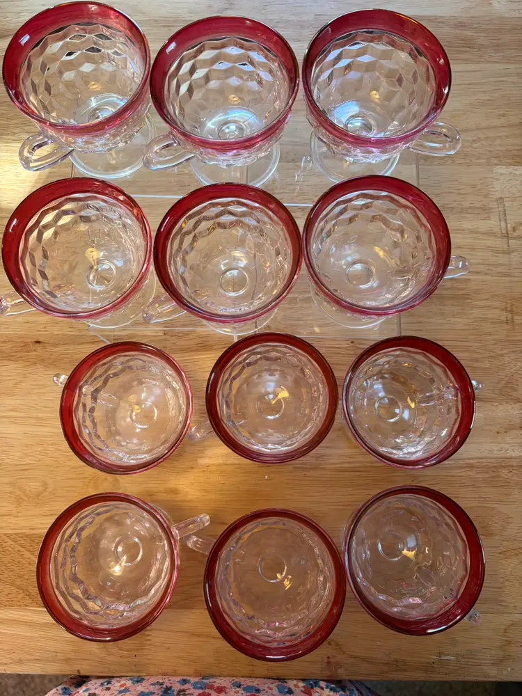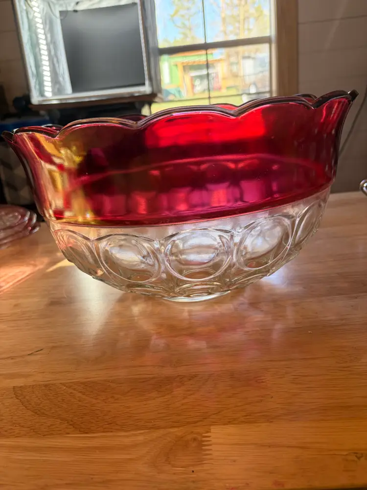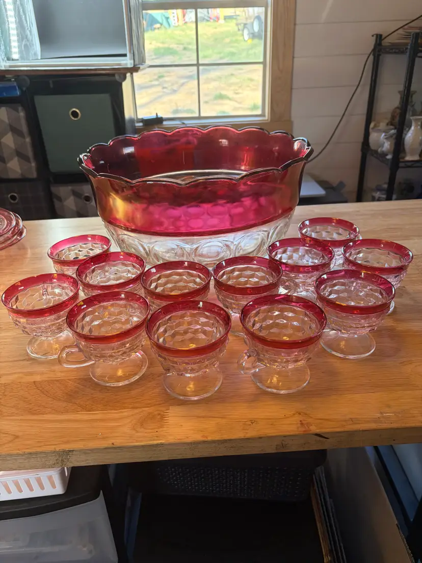 The Indiana Glass cranberry flashed punch bowl set is a vibrant and elegant addition to any dining or entertaining space Made of clear glass with a cranberry edge. It is in very good condition with only one flaw on the bottom of the punch bowl, there is a chip. It cannot be seen when bowl is standing upright. The bowl is 8 inches tall and 13 inches across the top. The flashed red is in excellent condition.