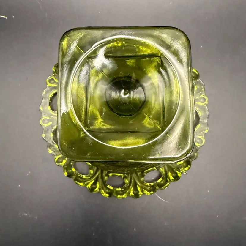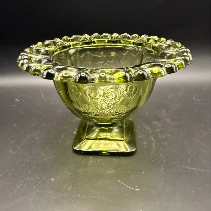 This is an Indiana Glass Company compute dish in the Lorain patternalso referred to as the Basket pattern, featuring an open lace rim and intricate basket-like designs on the bowl. Avocado green, was a popular color from the mid-century modern era. This particular style of glassware was produced in the 1930s and 1960s.