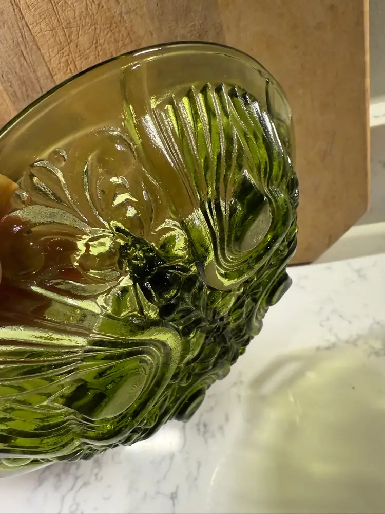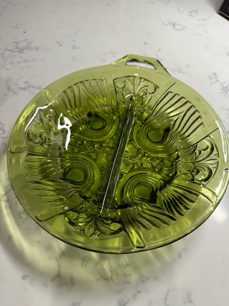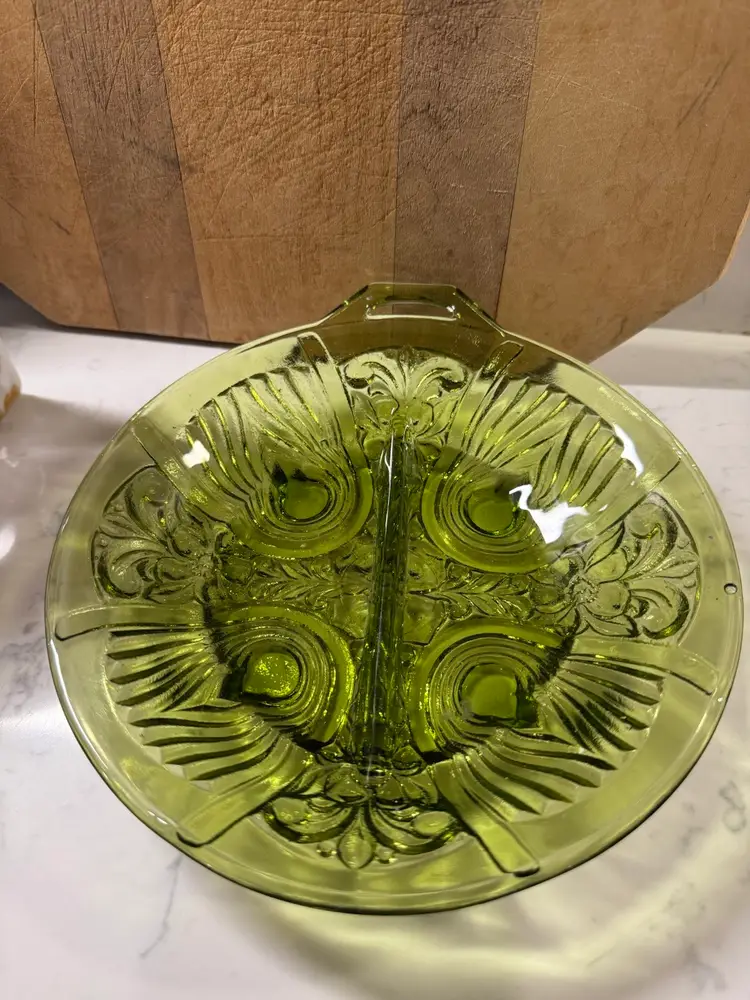 Vintage Indiana Glass Killarney Avocado Green Divided Relish Dish, perfect for serving appetizers, relishes, or snacks. This piece features a striking avocado green color and an elegant divided design with a convenient handle for easy carrying. The Killarney pattern is known for its intricate raised floral and scroll motifs. In excellent pre-owned condition with no chips or cracks, ideal for collectors of vintage glassware or for adding a touch of retro charm to your table setting.