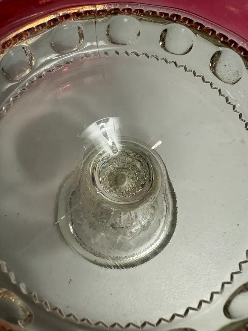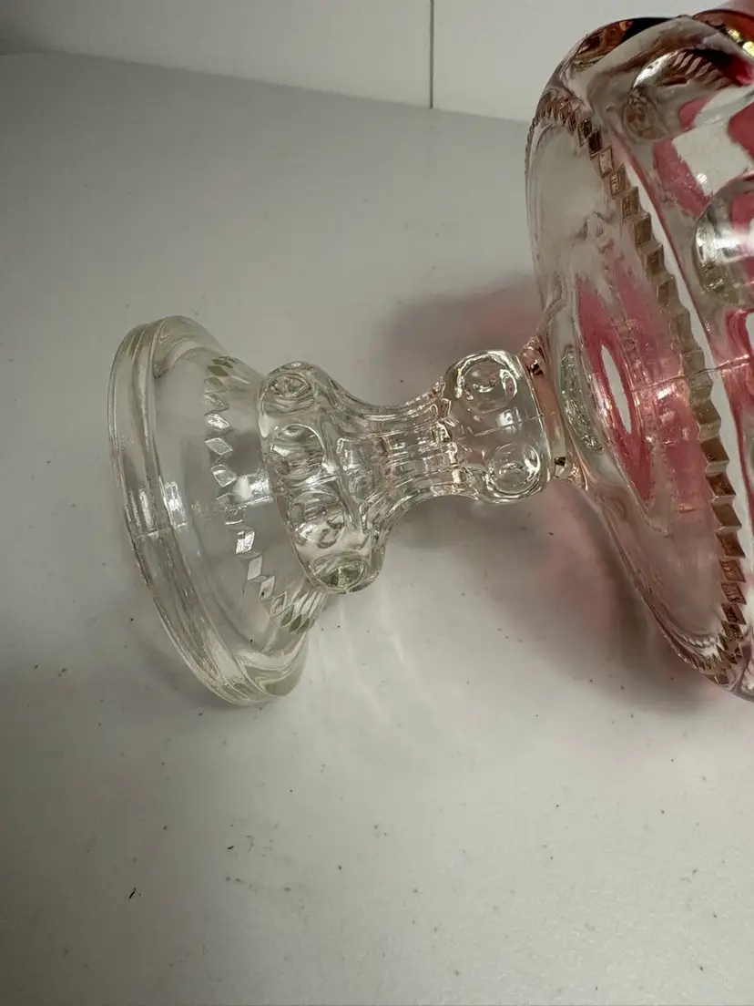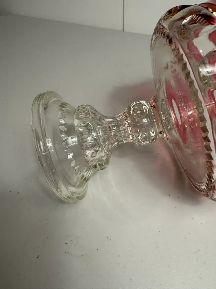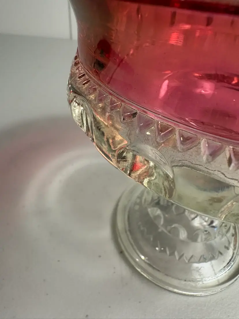 The Indiana Glass King's Crown & Diamond Point Ruby Flashed Compotes & Bowl set includes a round pedestal compote and a diamond point bowl, both featuring a glossy finish and a ruby flashed rim. Manufactured in Indiana in the late 20th century, this licensed reproduction pressed glass set is decorative and perfect for all occasions. The set is a vintage piece with a clear bowl and is made of pressed glass, adding a touch of elegance to any table setting. Made in the United States, this set weighs 3 lbs and is a beautiful addition to any collection of late 20th-century glassware.