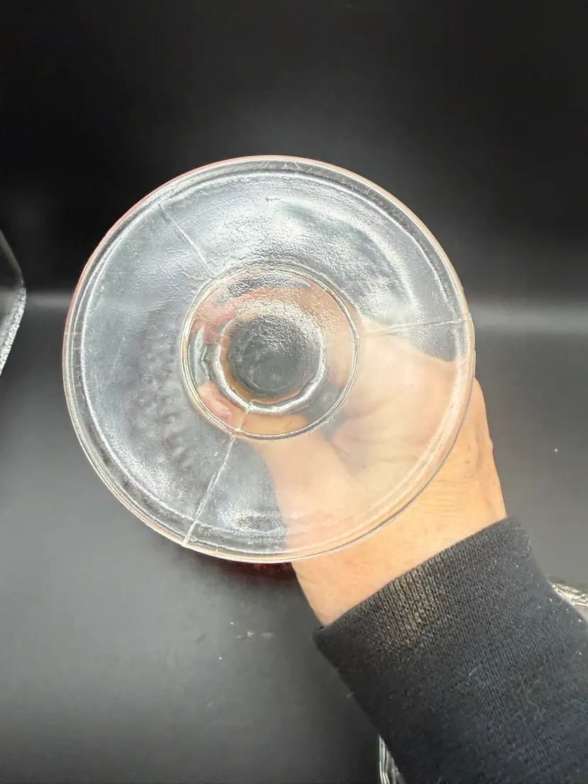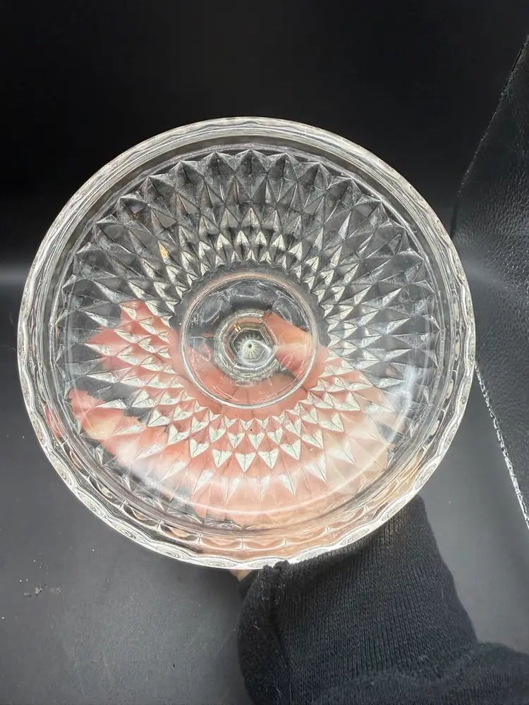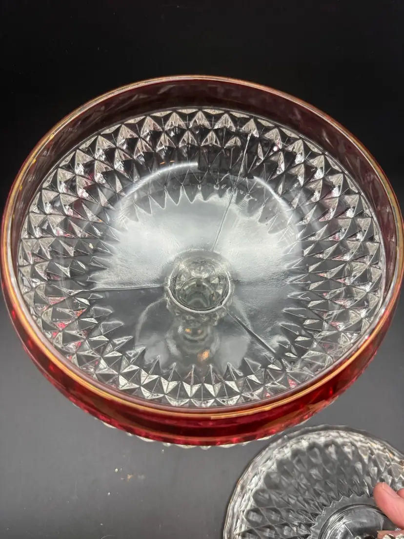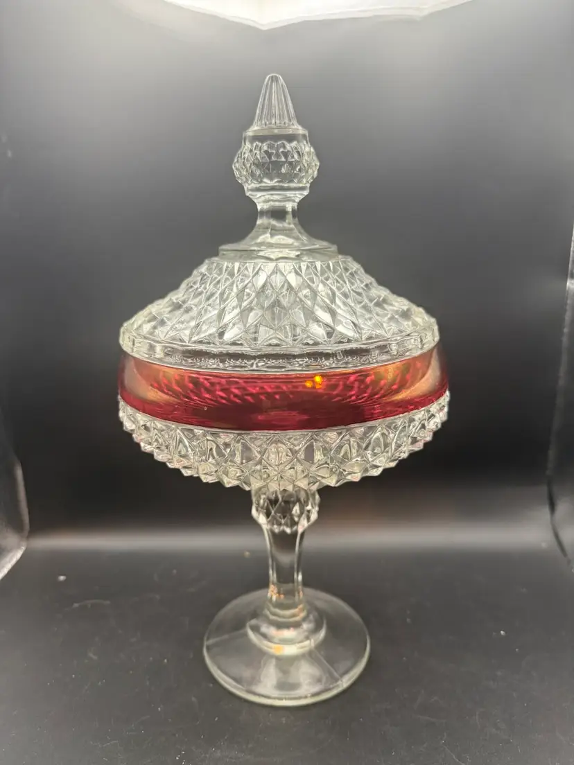 This particular candy dish, often referred to as a compote or covered candy dish, showcases the King's Crown pattern, characterized by its diamond-point hobnail design. The addition of cranberry or ruby flash adds a vibrant splash of color, making it a sought-after piece for collectors of vintage glassware. These dishes were commonly used for serving candies, nuts, or as decorative centerpieces.
