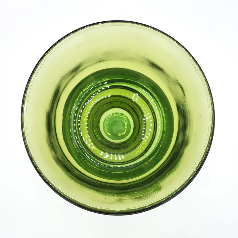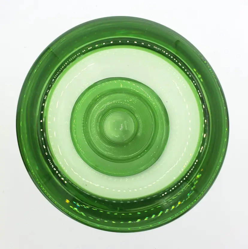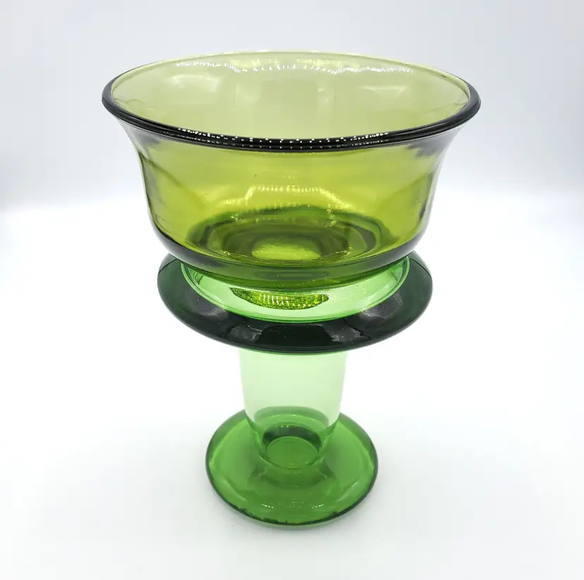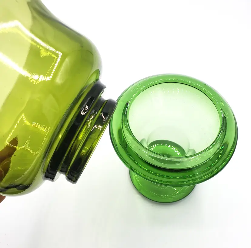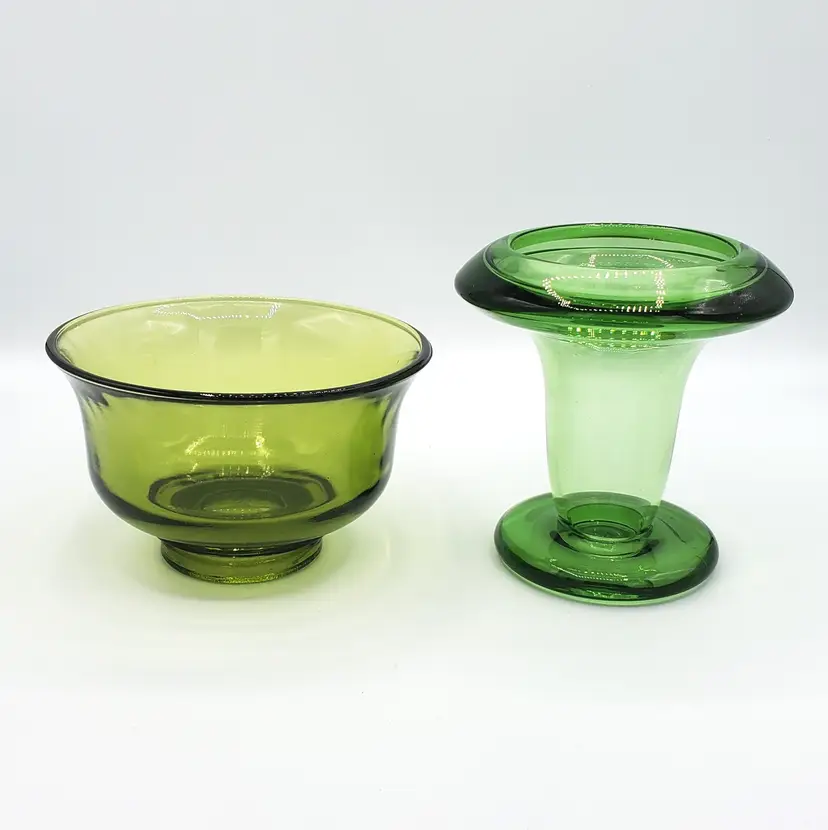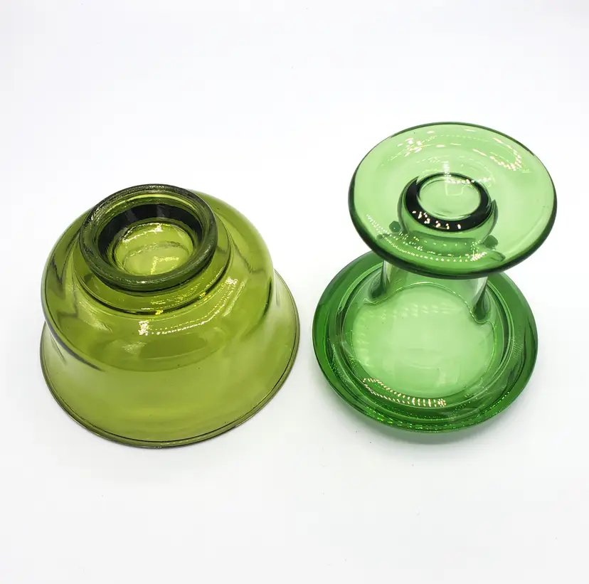 I purchased these two pieces together and they fit nicely. The color of the glass does not match however. I've identified the top piece as an Indiana Glass mayo/condiment server from the 1970s. The bottom piece is a mystery. However, green is my favorite color and I personally like the combo so I left it. The bottom piece may be used as a bud vase, a pedestal for the mayo bowl or some other service piece. The two stacked are slightly over 7" high. The bowl is 5" in diameter. Thanks for looking!