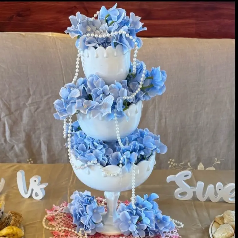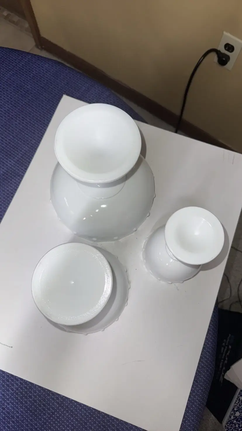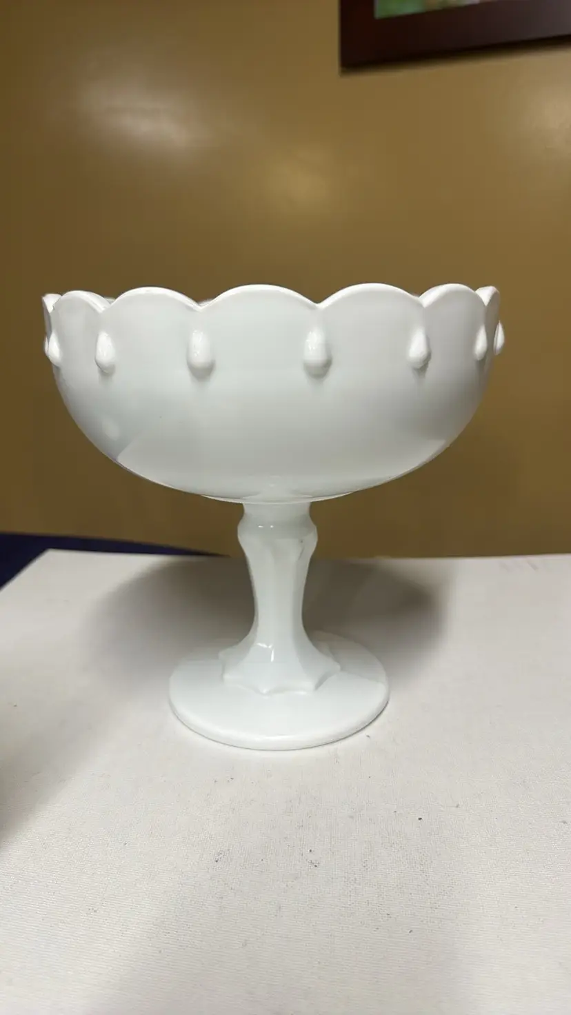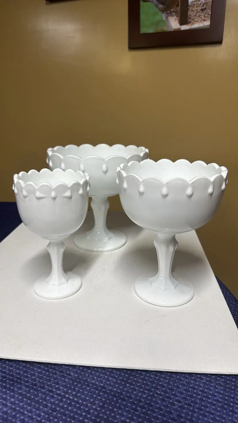 Set of three white scalloped pedestal bowls. Perfect for decor or serving. Indiana Glass Milk Glass Scalloped Pedestal Bowls set of 3 stacking centerpiece or candy dishes U used these to create a centerpiece for my daughter’s wedding shower Excellent condition with no breaks or chips (83672825a)