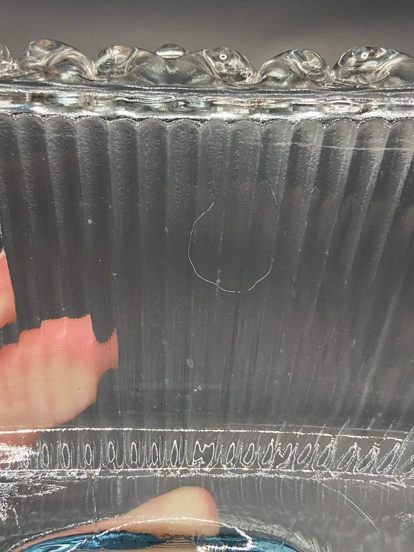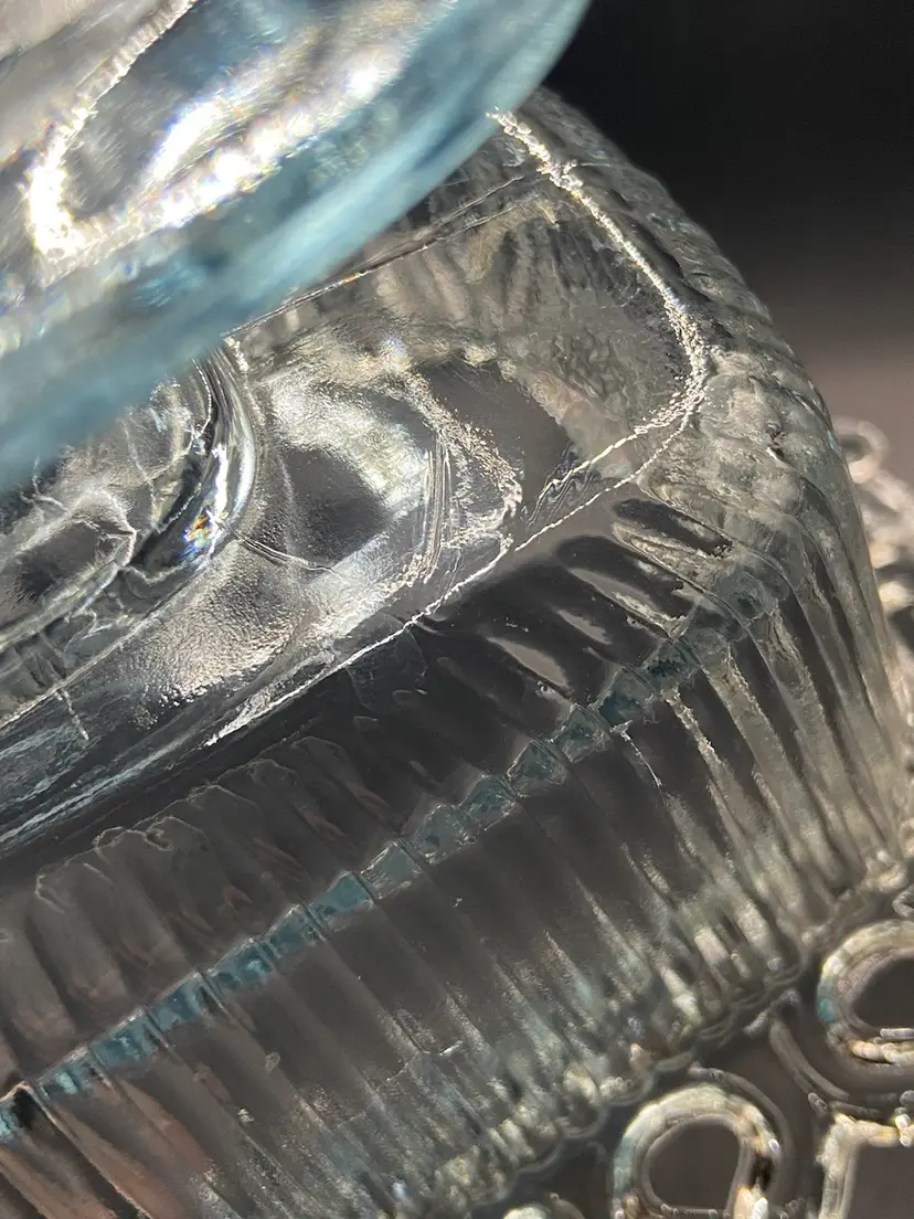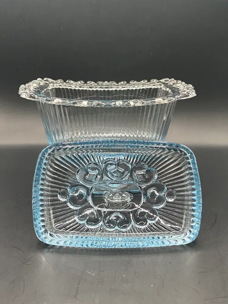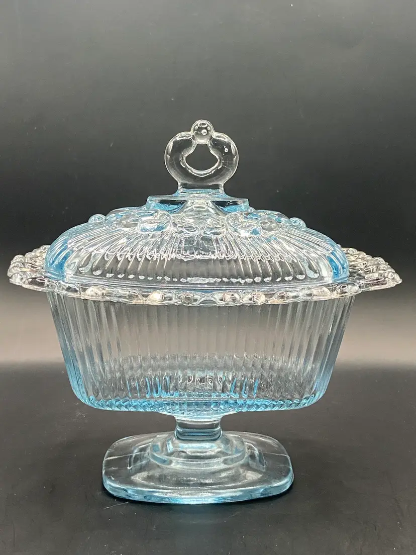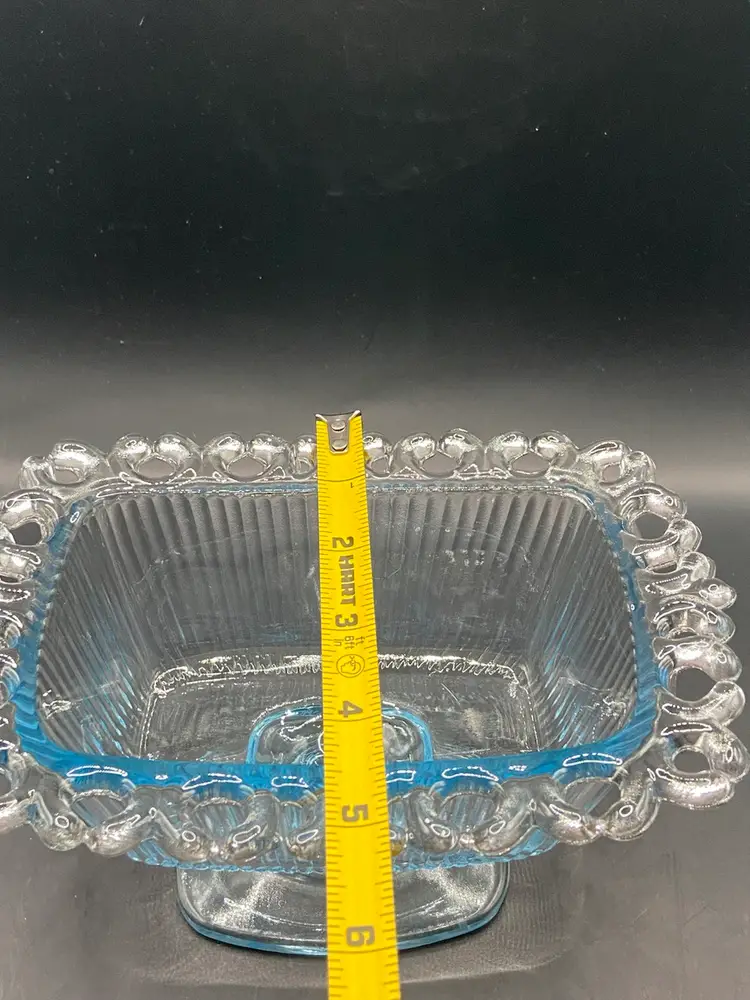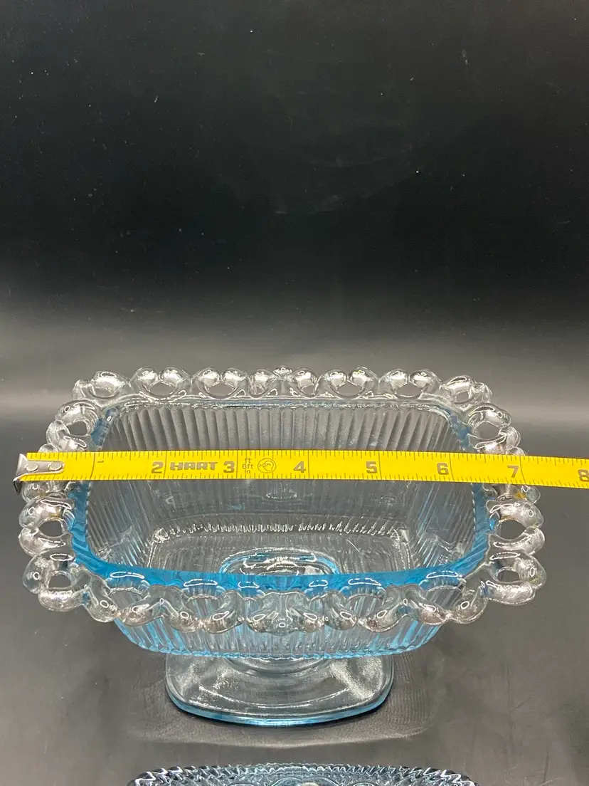 This light blue covered dish is on a pedestal base and is a vintage beauty. She is surrounded by a feminine glass lace that just takes the show. She would look stunning holding the old fashioned ribbon candy. She does have a small circular scratch inside the dish (see photos) but it isn’t rough to the touch. I also photographed what I believe is a manufacturing flaw on the bottom side of dish that is very small. She’s in very good vintage shape and clean.