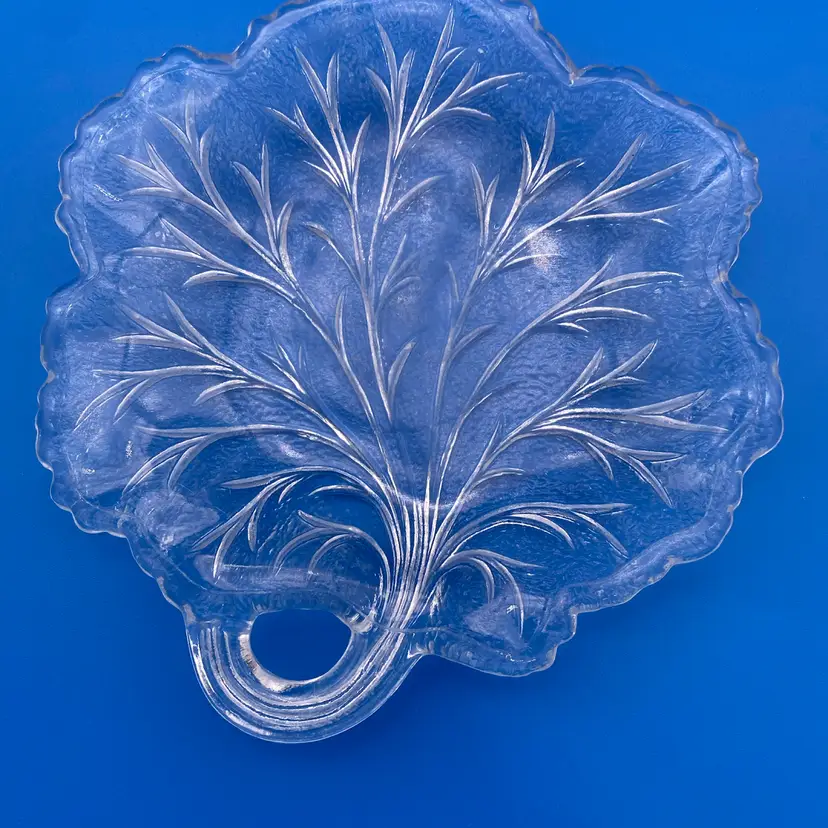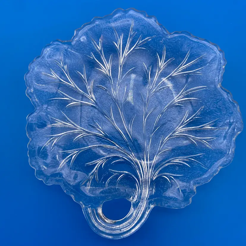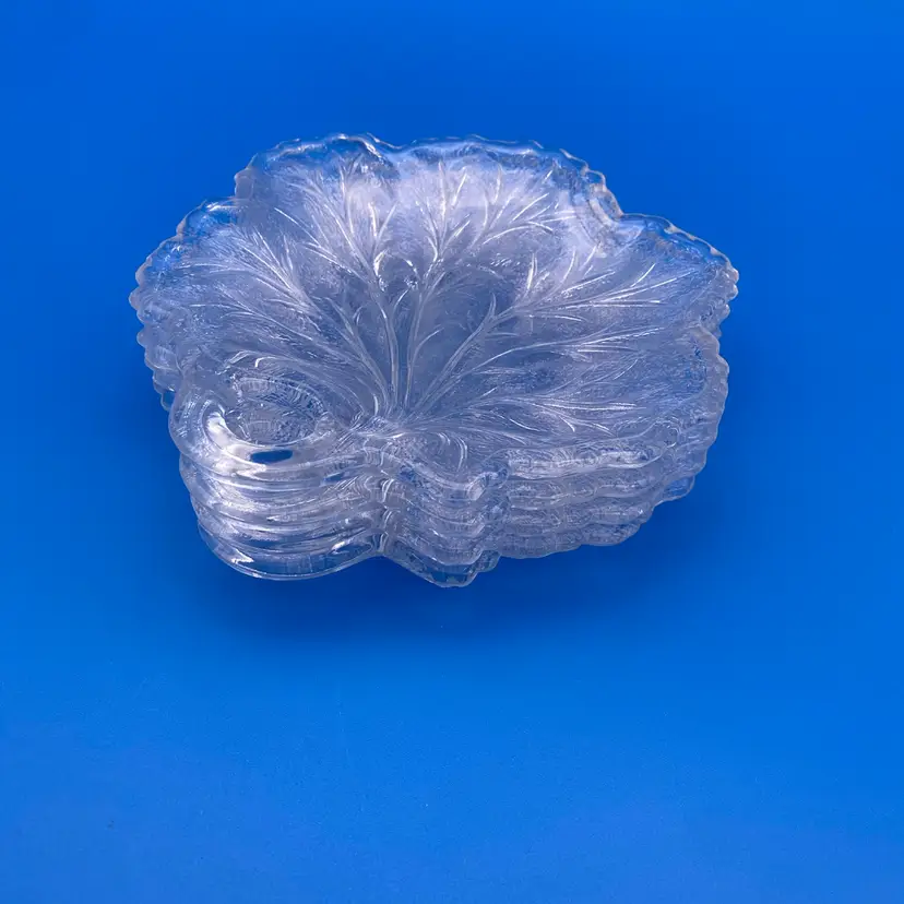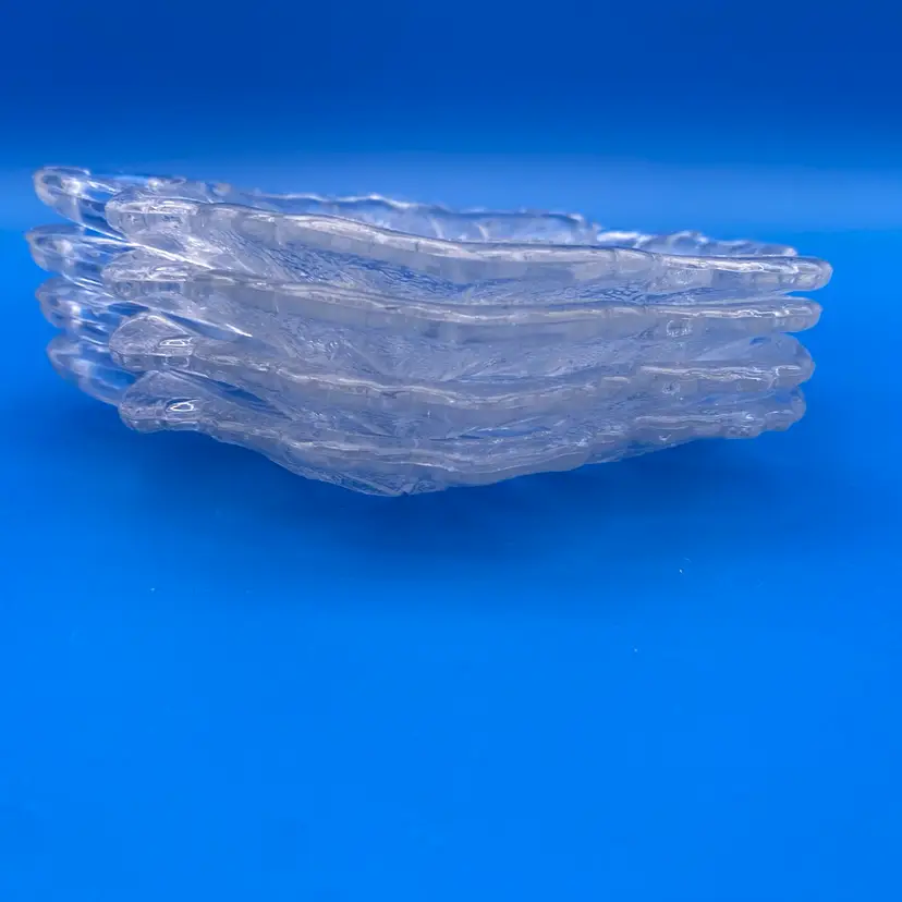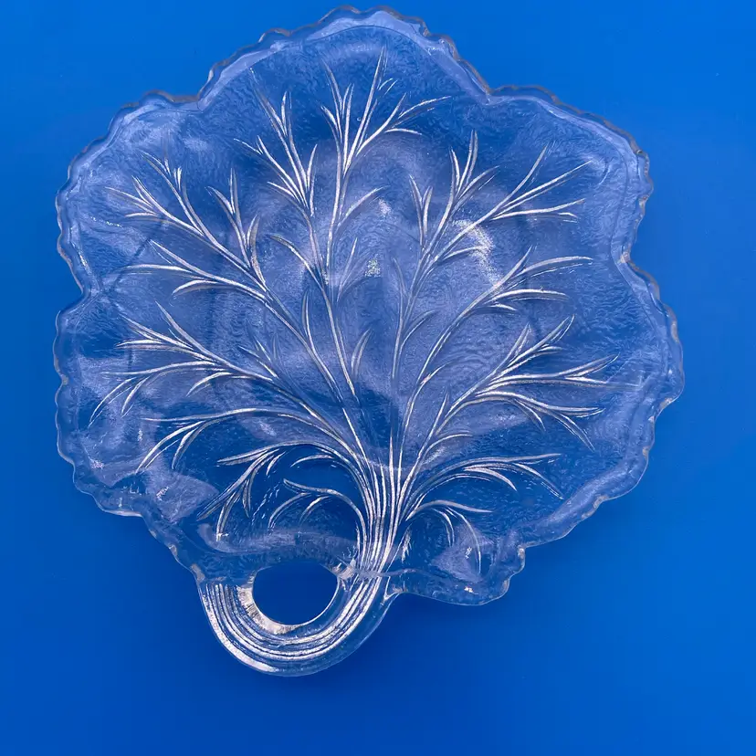 You are purchasing a set of Four Clear Glass Pebble Leaf Pattern/Shaped Appetizer or Tidbit Plates by Indiana Glass. Textured bottoms and have a convenient handle for transport. Up to 6.5"x6.25". These Plates are in overall great condition with no chips, cracks or stains. Just see final image to show one plate has minor scuffing on the center top face.