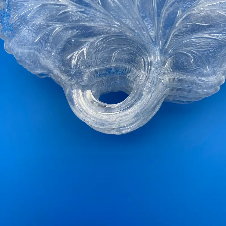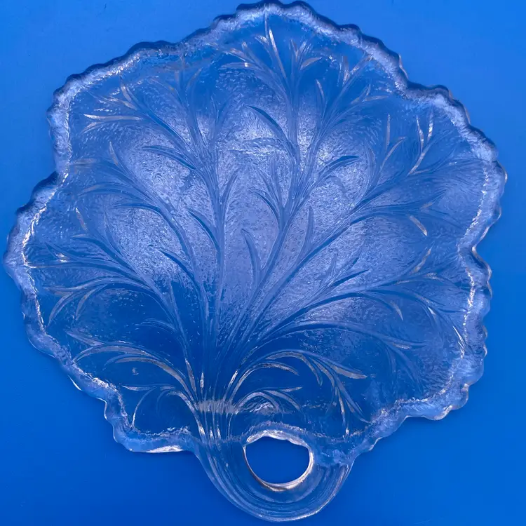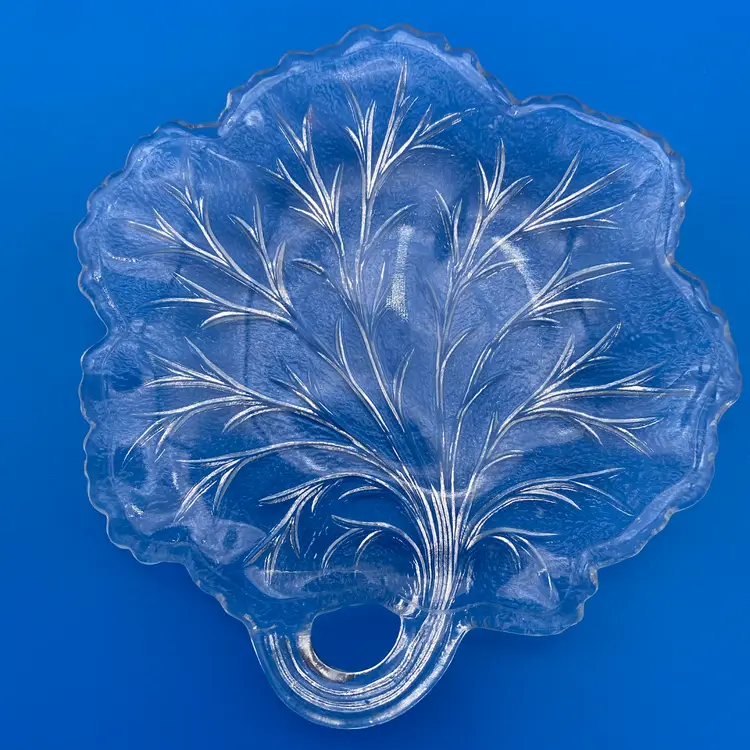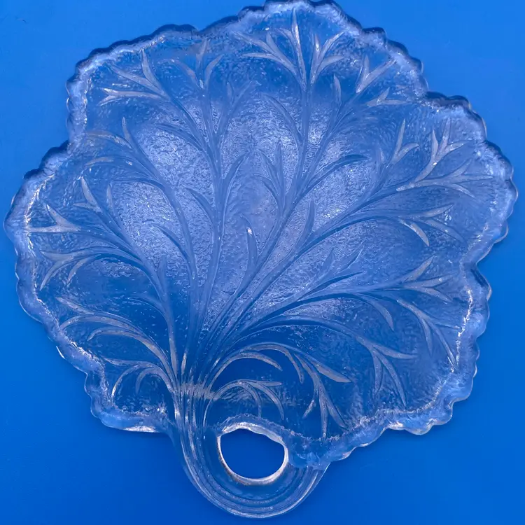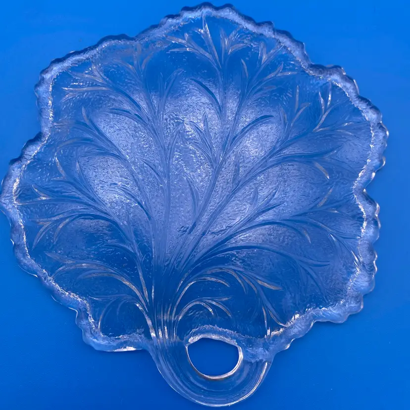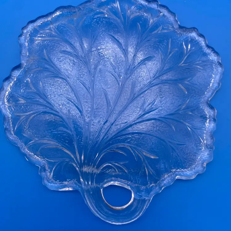 You are purchasing a set of Four Clear Glass Pebble Leaf Pattern/Shaped Appetizer or Tidbit Plates by Indiana Glass. Textured bottoms and have a convenient handle for transport. Up to 6.5"x6.25". These Plates are in overall great condition with no chips, cracks or stains. Just see final image to show one plate has minor scuffing on the center top face.