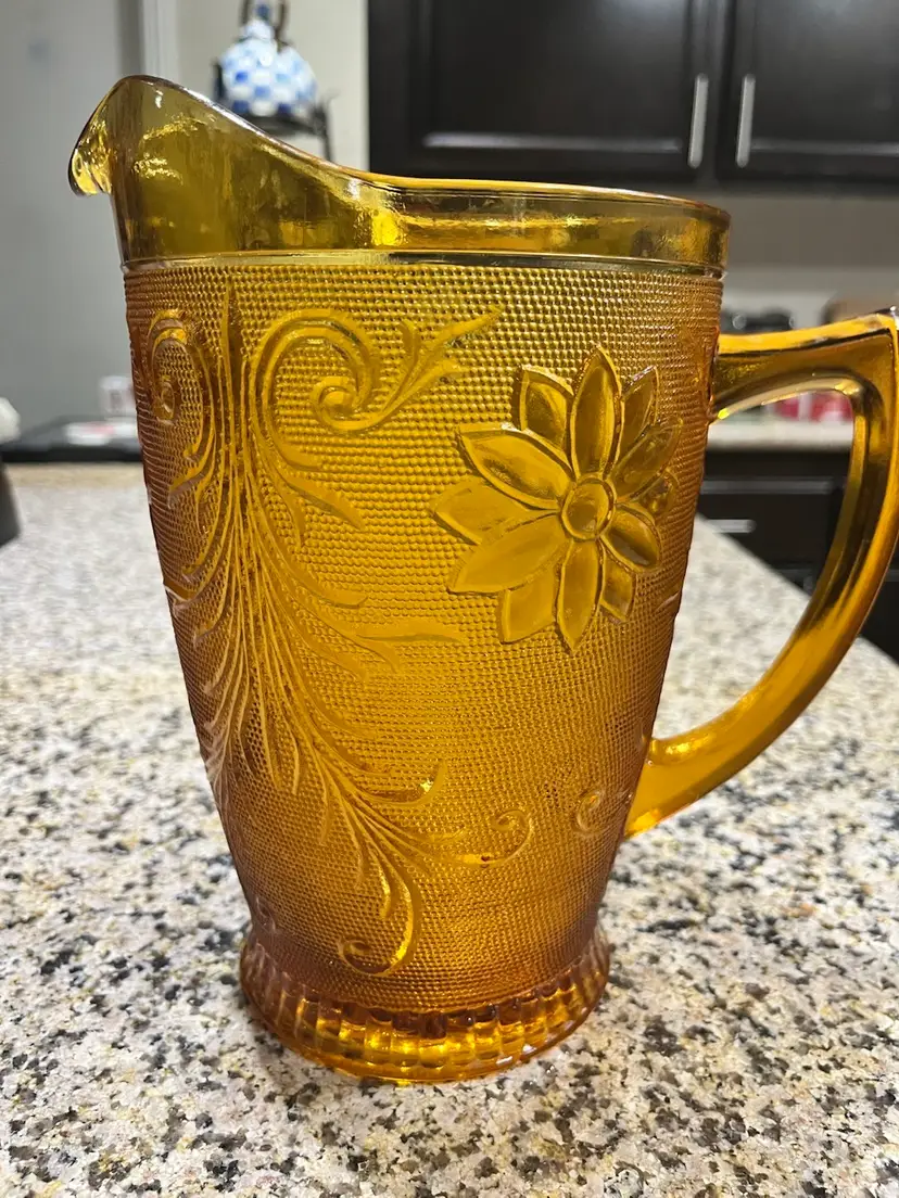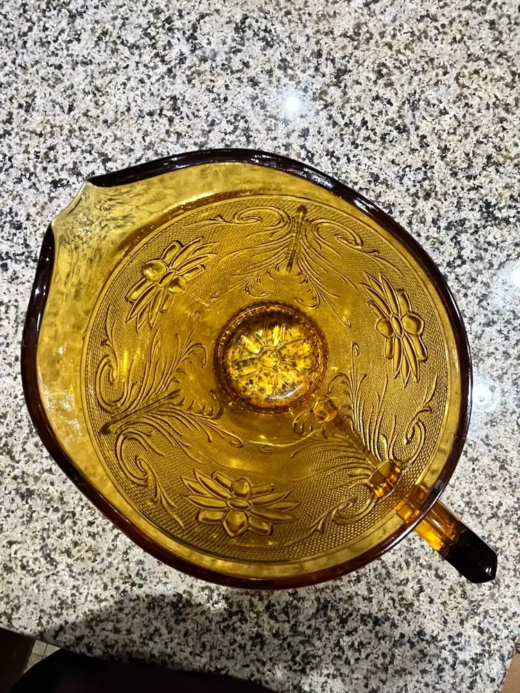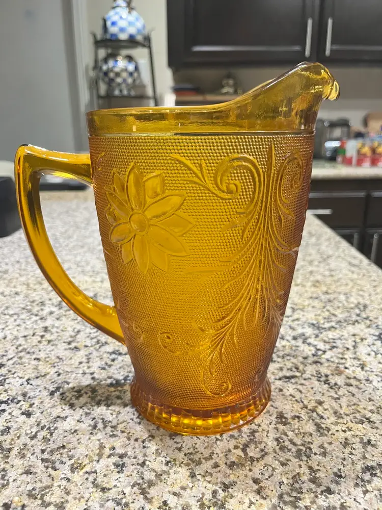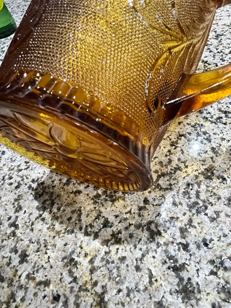 Vintage amber-colored glass pitcher, specifically identified as an Indiana Glass Tiara Sandwich pattern pitcher, likely dating back to the 1960s or 1970s.